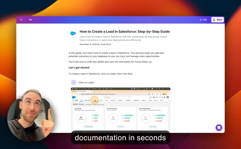 “Glitter is really cool! The step-by-step guide it created was exactly what we needed for our corporate Salesforce setup, which was a literal mess. Just having a video isn't great because it's a nightmare to update all the fields for billing. This tool is saving us so much time!”