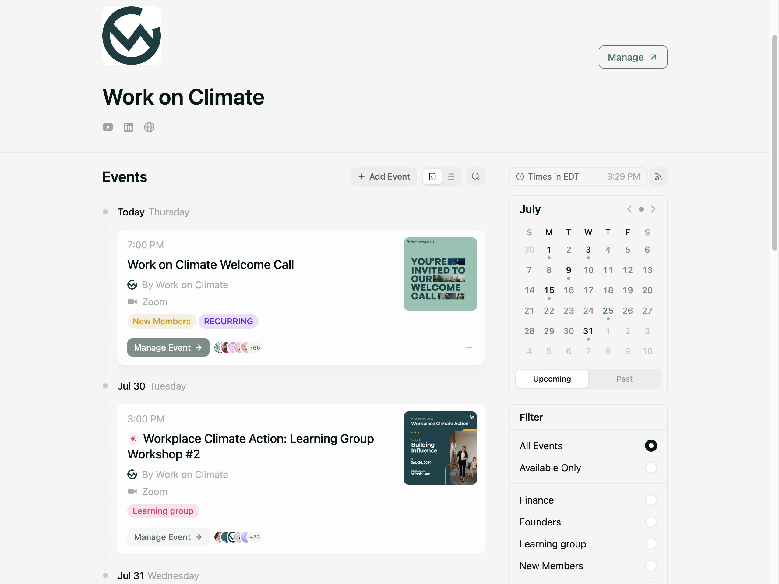 To duplicate your Luma event, navigate to Manage Event on your event page. From there, go to More.
