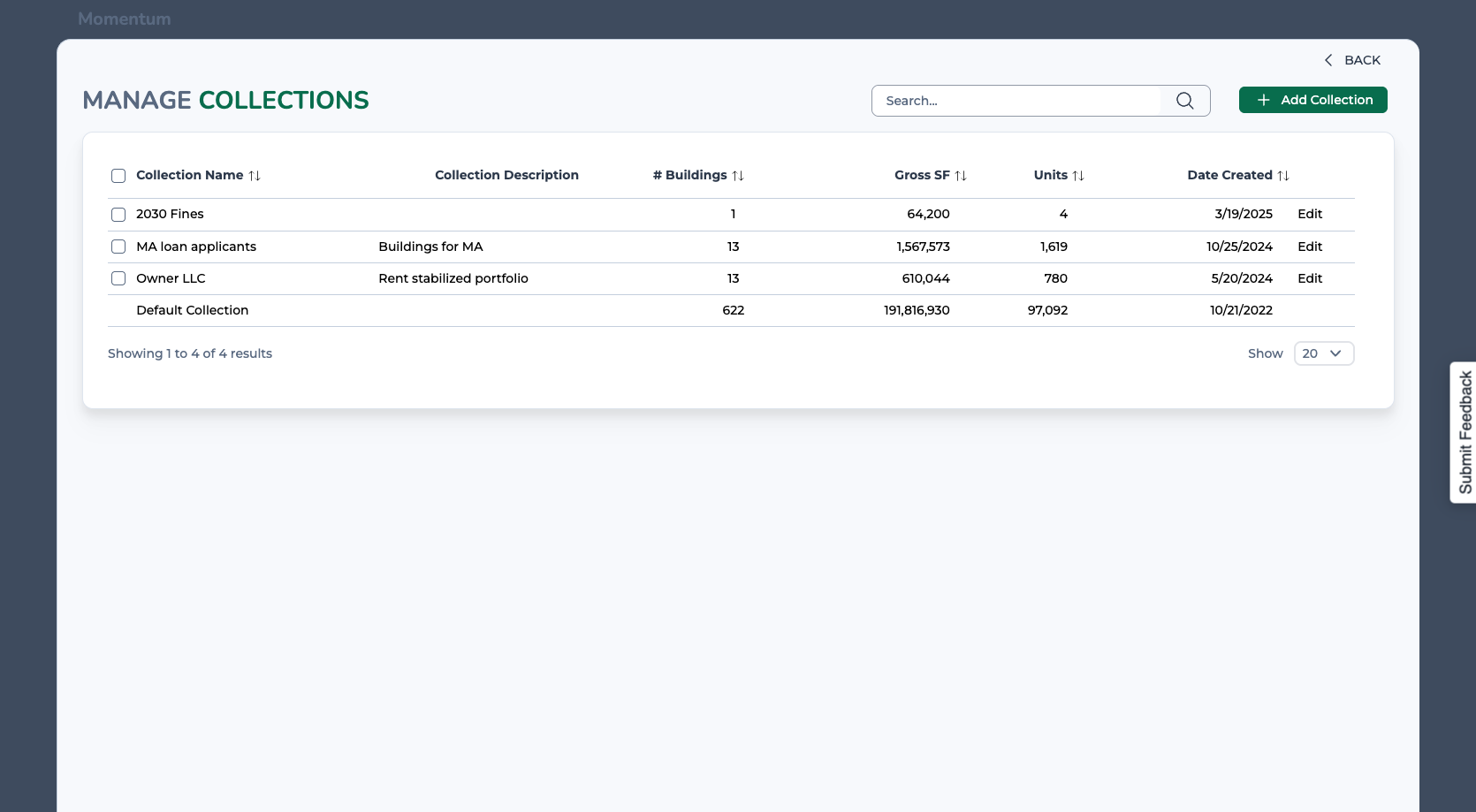 There you'll see a list of the buildings in that collection, along with summary statistics, including the number of buildings, units, and square feet.