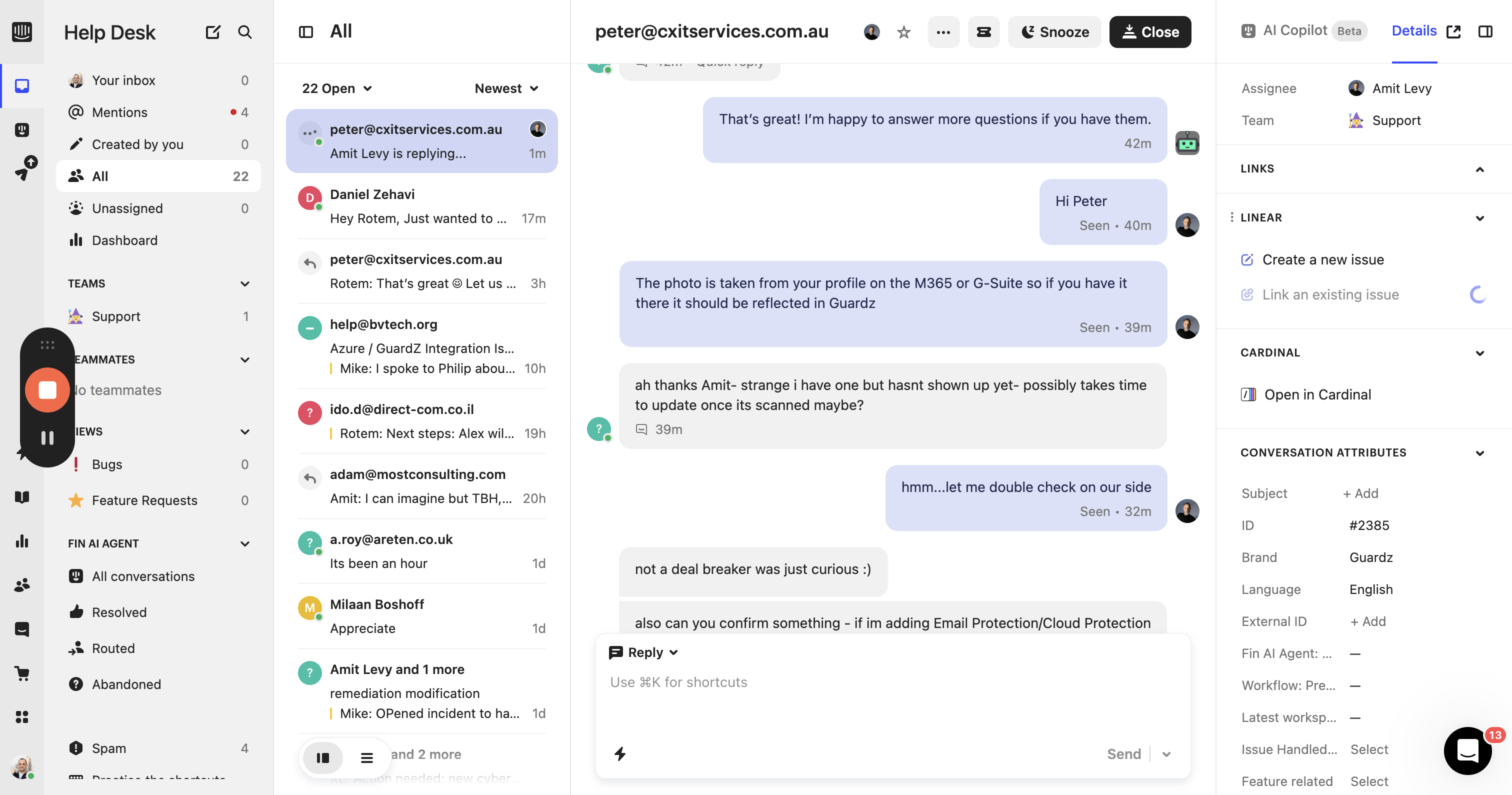 In the Intercom conversation, you will find the Linear section on the right. Here, you can either link to an existing issue or create a new issue.
