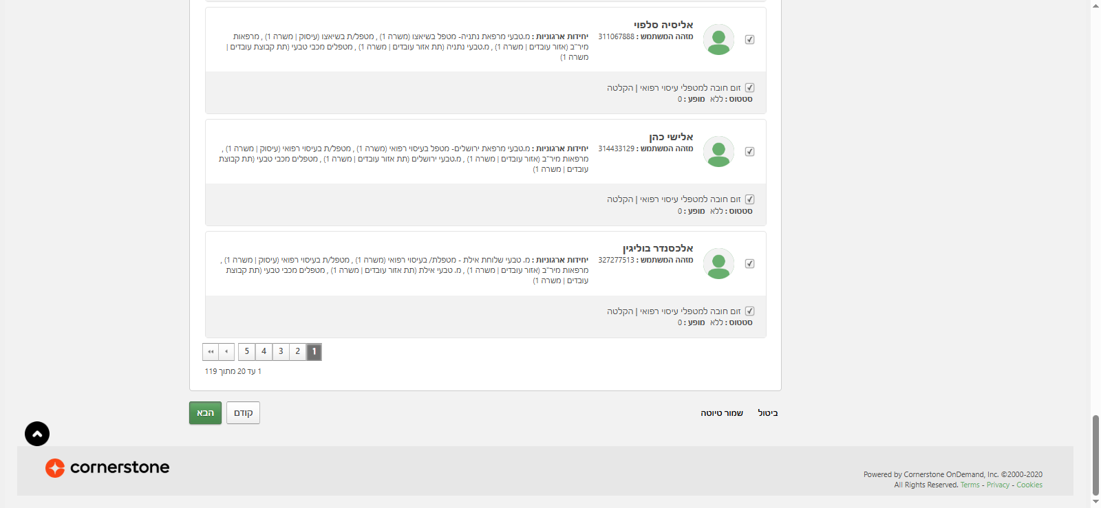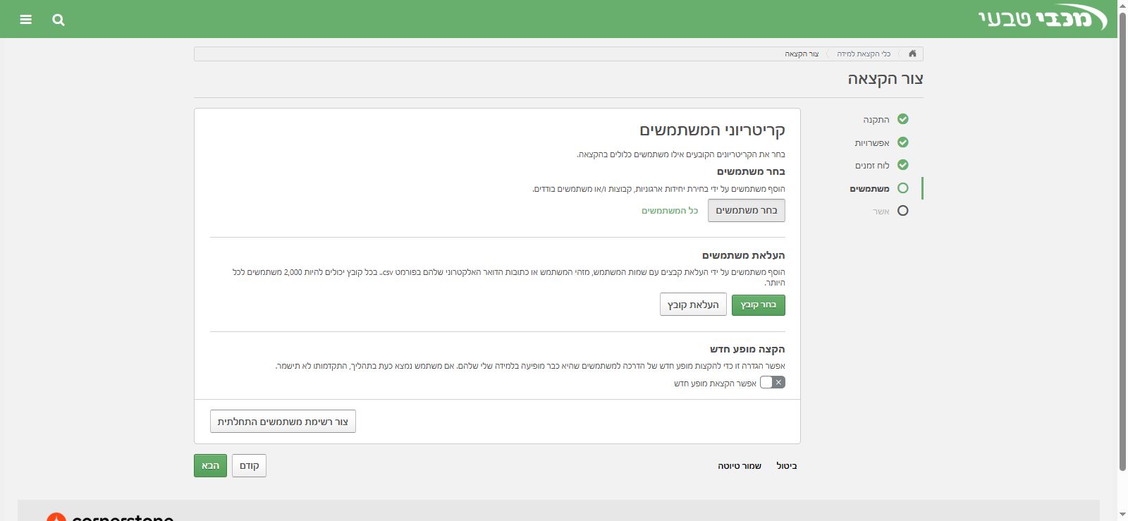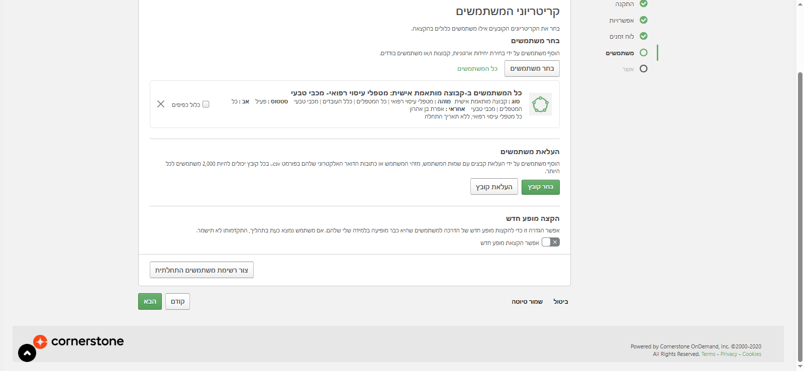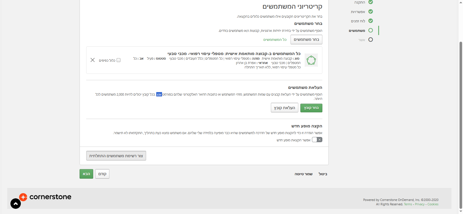 אממ, אני רואה שיש לו סטטוס "ללא" כי זה עדיין לא קיים אצלו. מופיע אפס, מופע אפס. כלומר, הוא אף פעם לא עשה את הלמידה הזאת. יש אפשרות בהעלאת משתמשים לטעון קובץ של משתמשים, באופן ספציפי. אם אני צריכה, אפשר לראות את השמות המלאים שלהם, תעודות הזהות שלהם, או כתובת הדואר האלקטרוני שלהם. הקובץ צריך להיות בפורמט CSV. זאת אפשרות אחרת לטעינת משתמשים להקצאה במקום קבוצה חכמה.