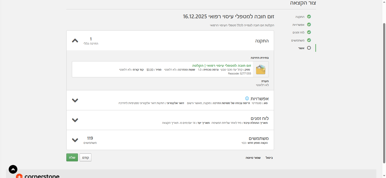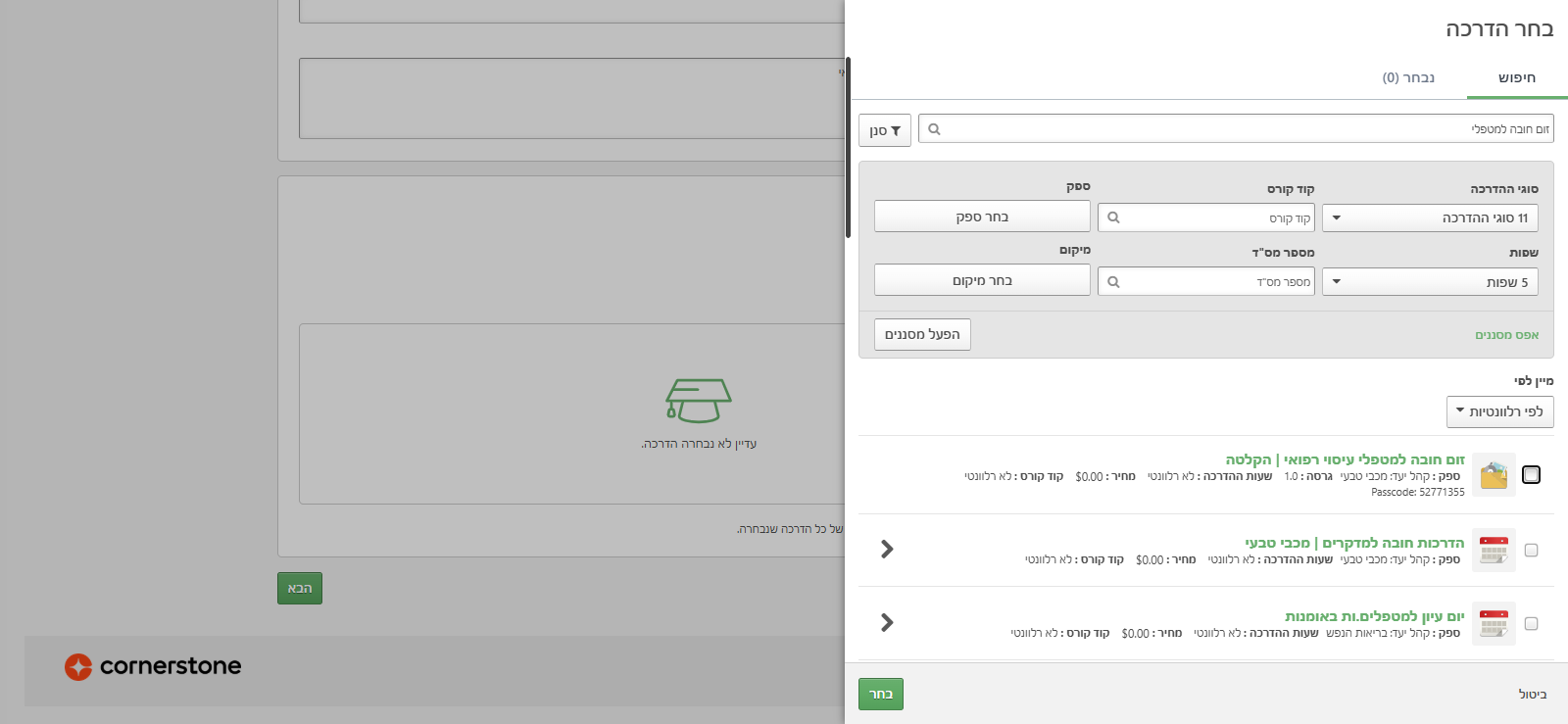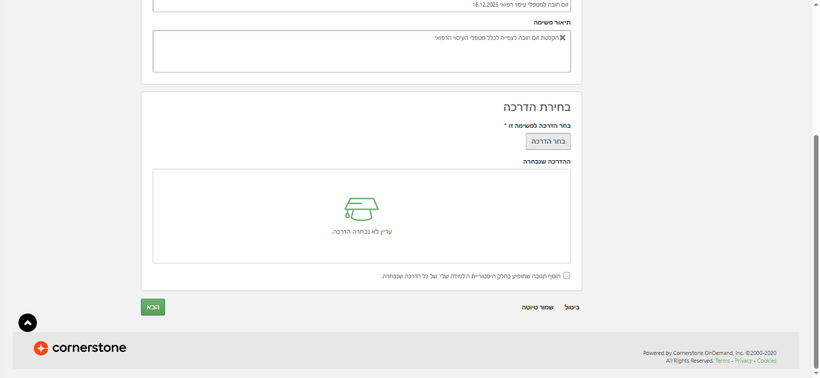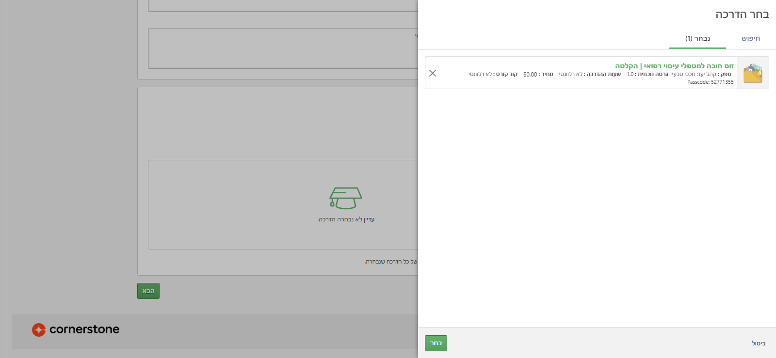 תיאור המשימה: כאן אני בוחרת את ההדרכה. בעצם, מה אני רוצה לשלוח ללומד. אז קוראים לזה "זום חובה למטפלי עיסוי רפואי"