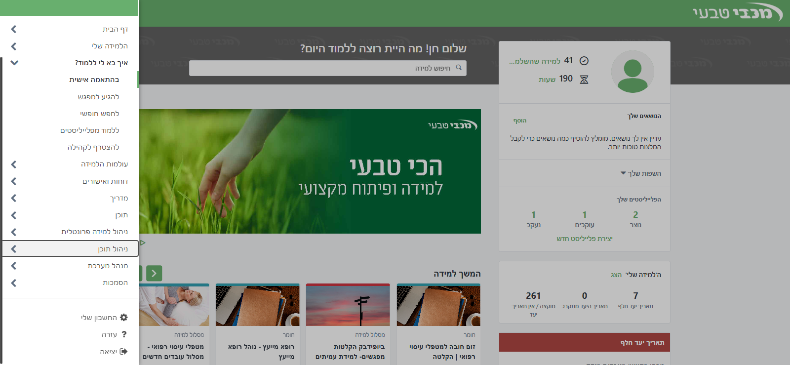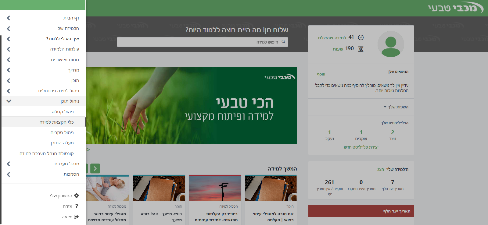טוב, עכשיו אנחנו הולכים ללמוד איך לעשות הקצאה. אז אני הולכת לתפריט הניווט. אני הולכת לניהול תוכן. כלי הקצאת למידה.