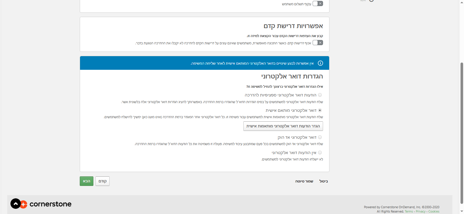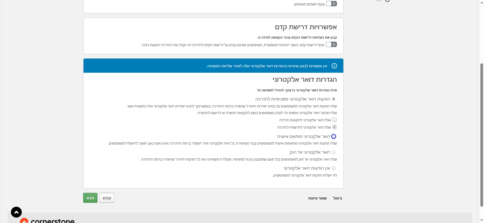 הגדרות דואר אלקטרוני: כאן אפשר לבחור הגדרות שיהיו ספציפיות להדרכה, כלומר להגדיר מיילים ברמת ההדרכה, או לבחור דואר אלקטרוני מותאם אישית. שבמקרים מסויימים אני יכולה להגדיר אותו ברמת ההקצאה. אני יכולה לבחור דואר אלקטרוני אד הוק (מעולם לא השתמשתי) או שלא יהיו מיילים בכלל.