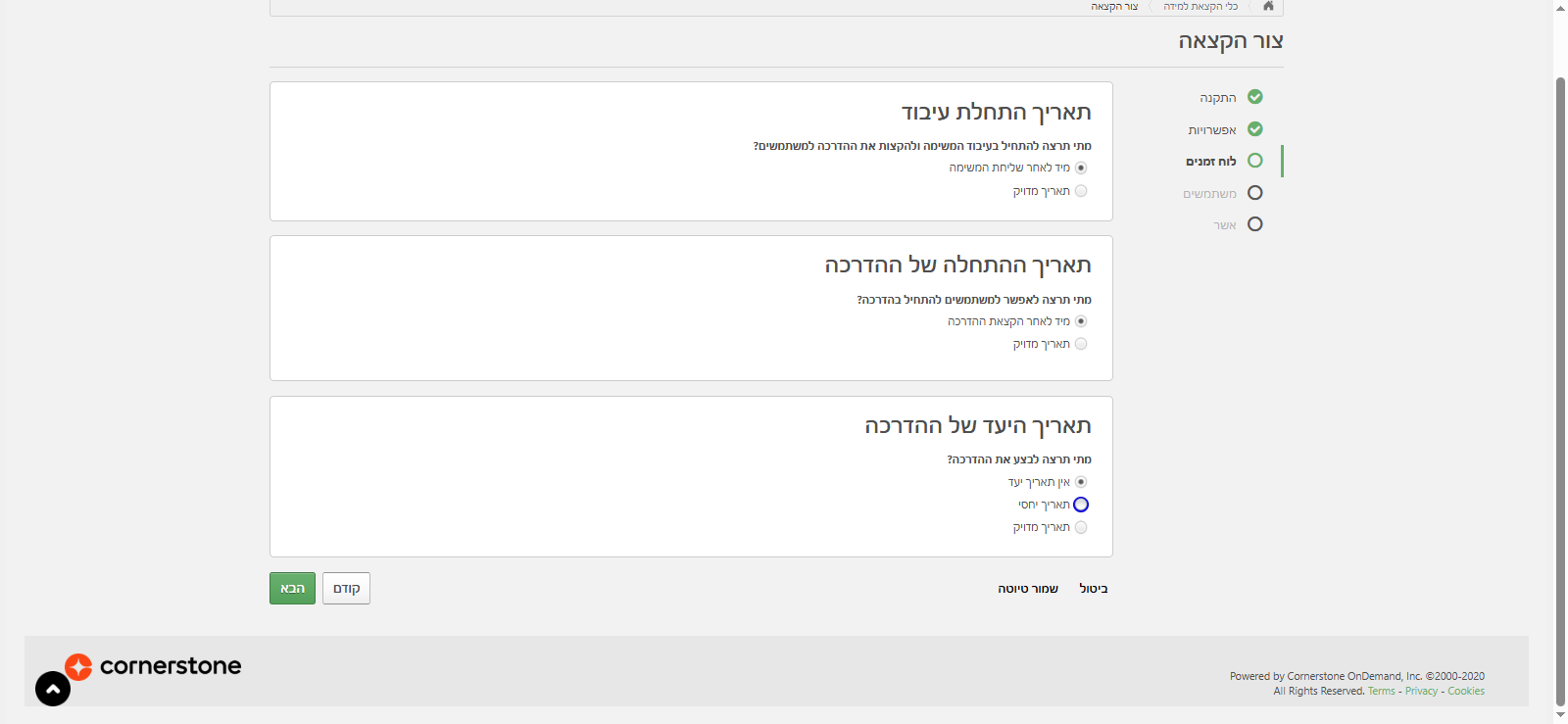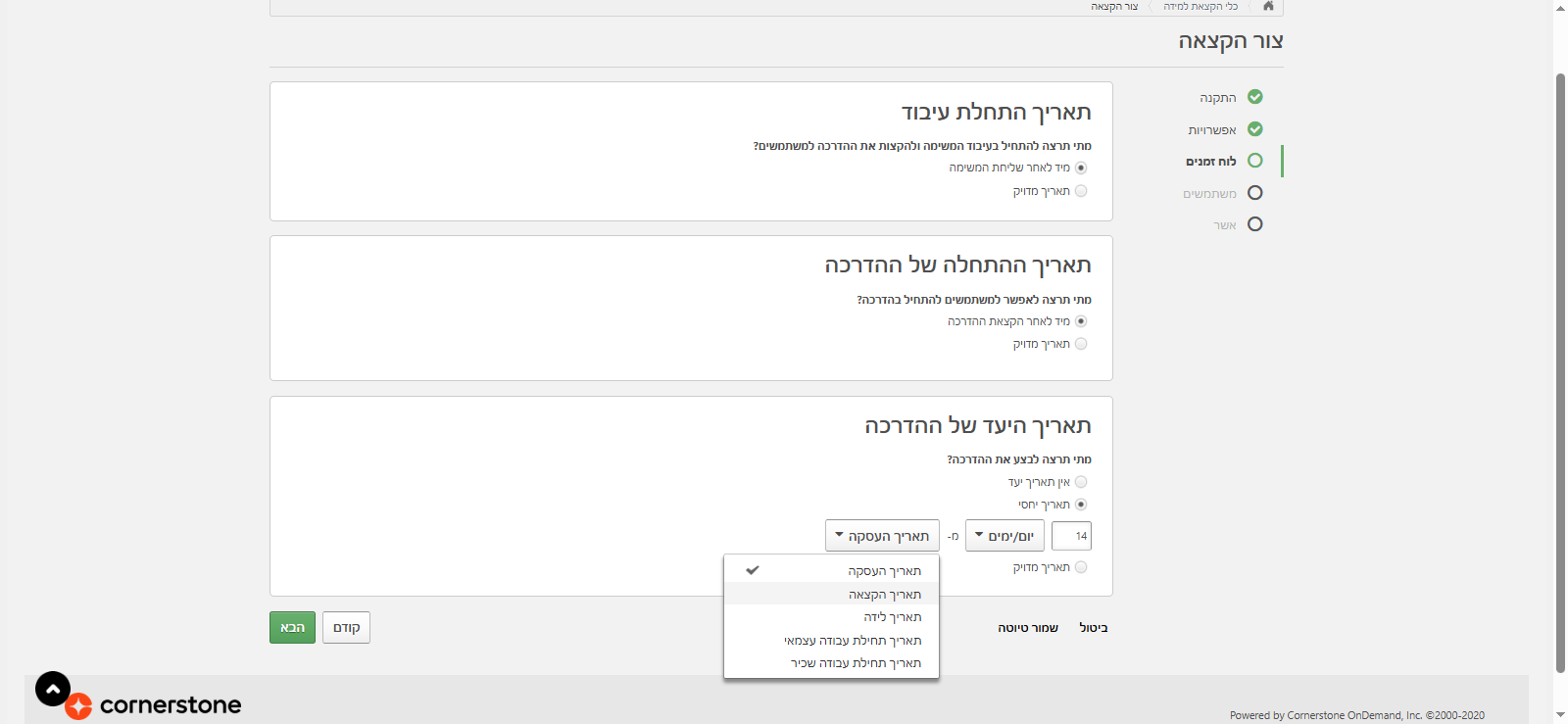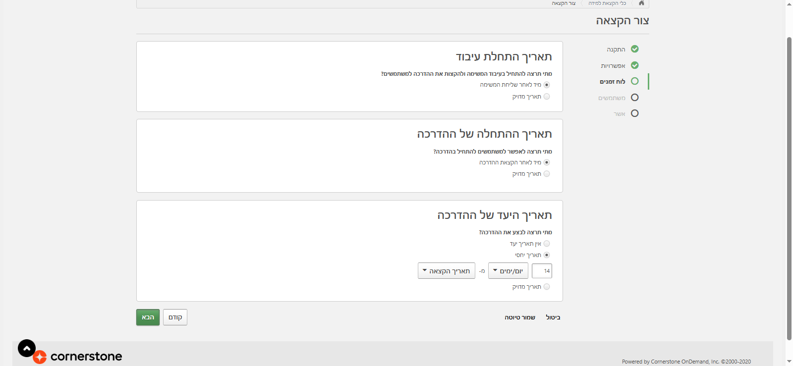 פה אני יכולה לבחור מתי בדיוק אני רוצה שהלמידה תישלח: האם ברגע שאני לוחצת "שלח", או לבחור תאריך עתידי מדויק. בנוסף, אני יכולה להחליט מתי ההדרכה תיפתח ללומדים: מיידית או בתאריך עתידי.