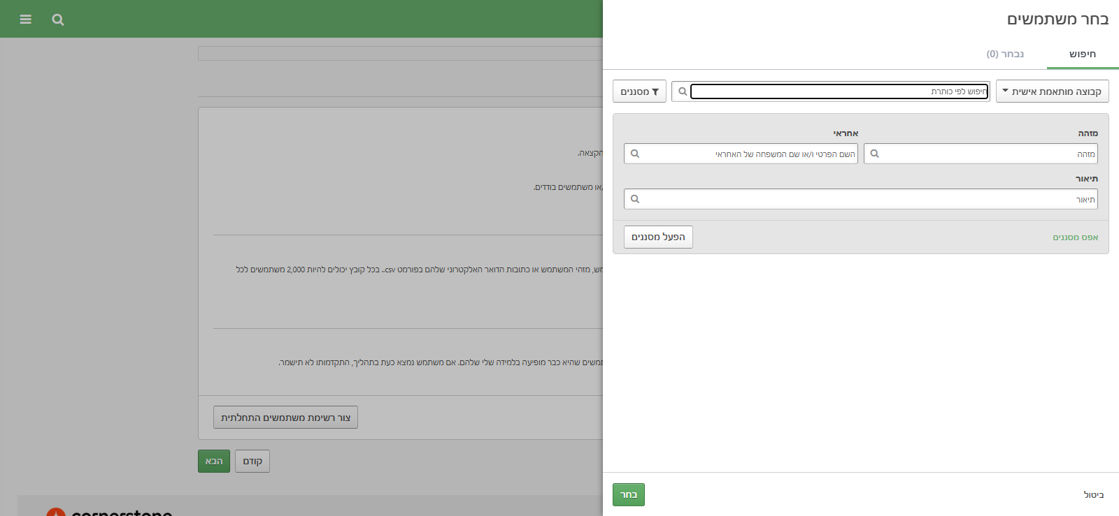 עכשיו אני בוחרת למי אני רוצה לשלוח את הלמידה. אני הולכת ל"בחר משתמשים". יש לי כאן ב"משתמשים" כמה אפשרויות. אני יכולה לבחור לפי אזור עובדים או לפי מיקום יש גם אפשרויות אוטומטיות שונות.