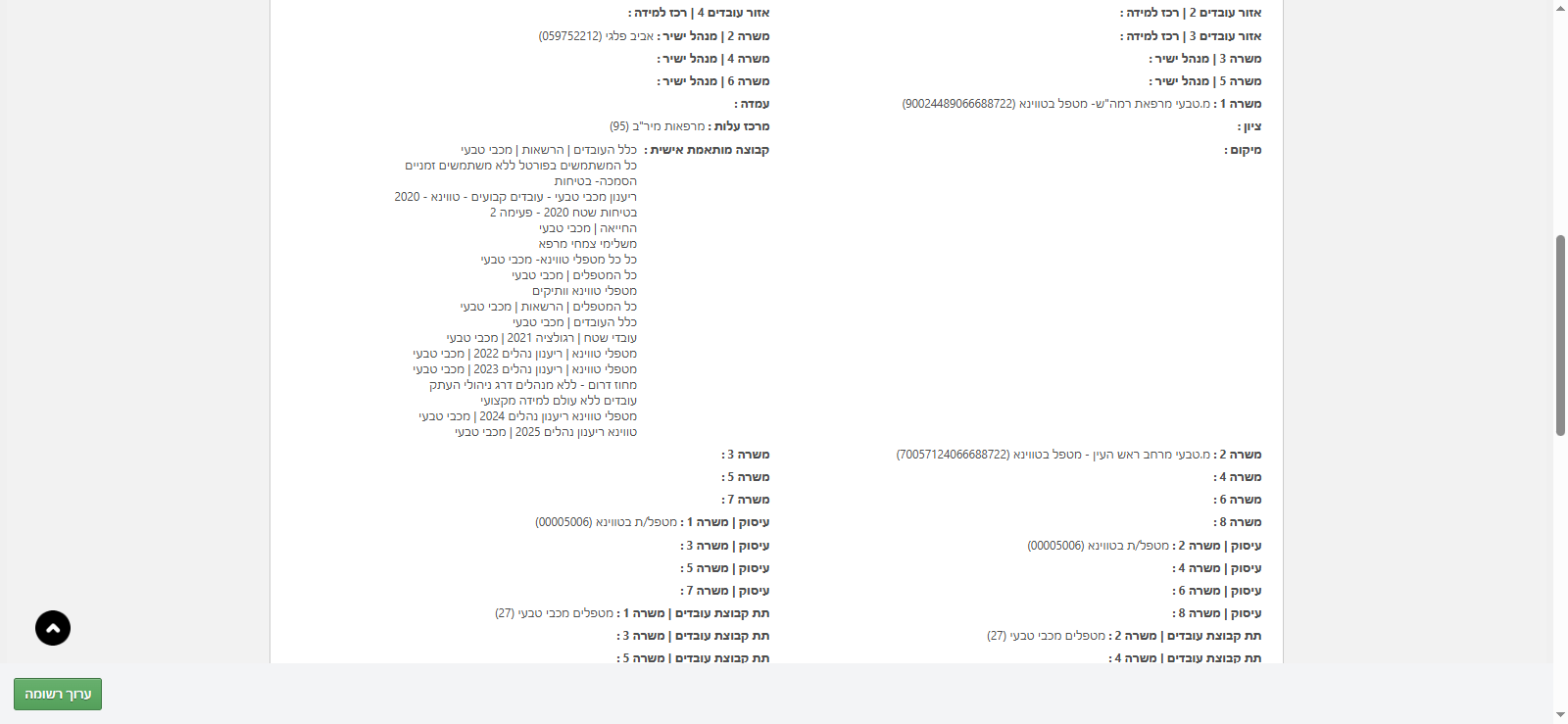 גוללת למטה עד שאני מגיעה לסקשן "קבוצה מותאמת אישית" שם יופיעו כל הקבוצות שהוא משויך אליהן. ניתן לראות שהוא משויך לקבוצת ההרשאות של כלל העובדים של מכבי טבעי, מטפלי טווינא, החייאה ועוד.
