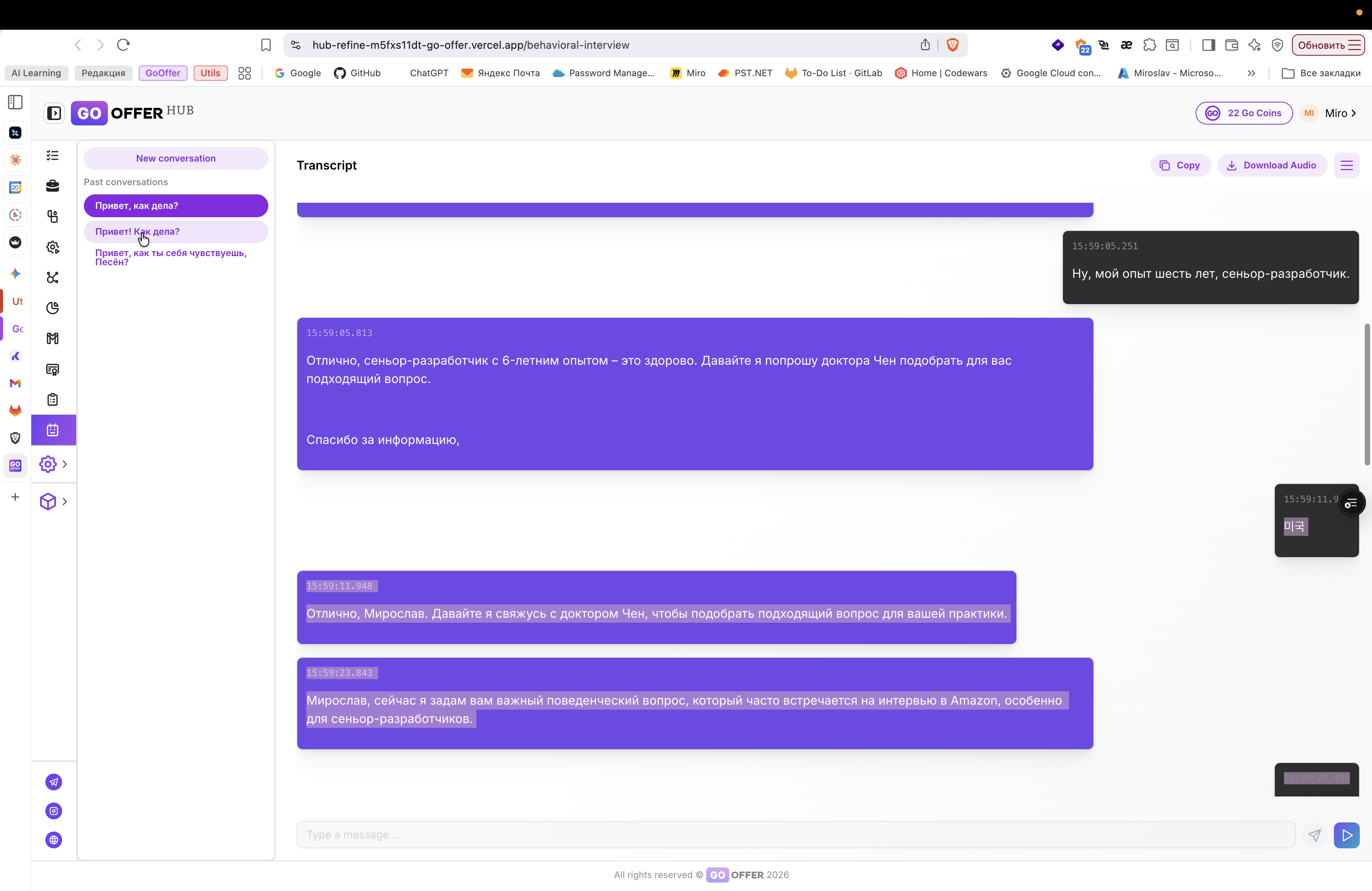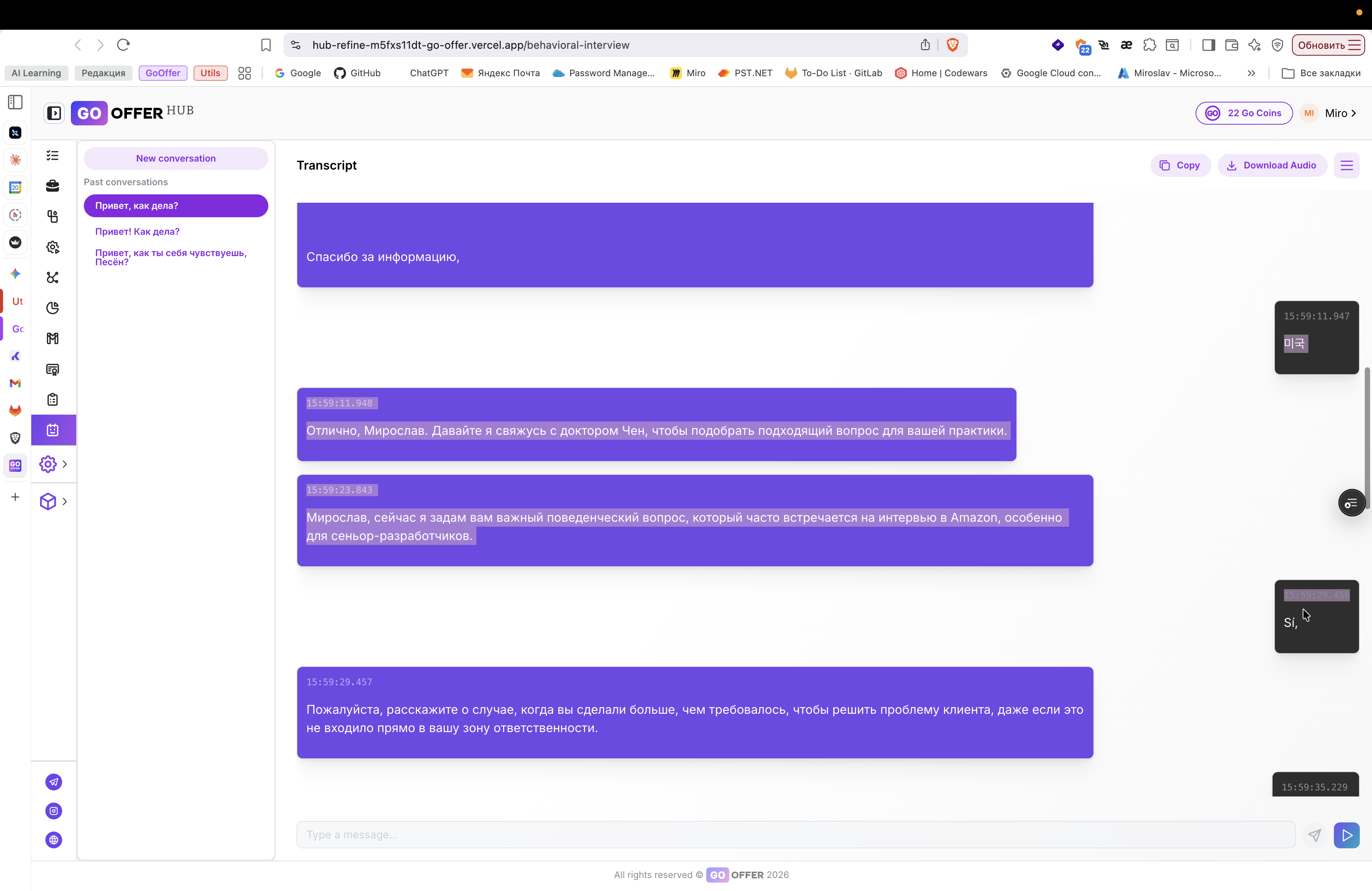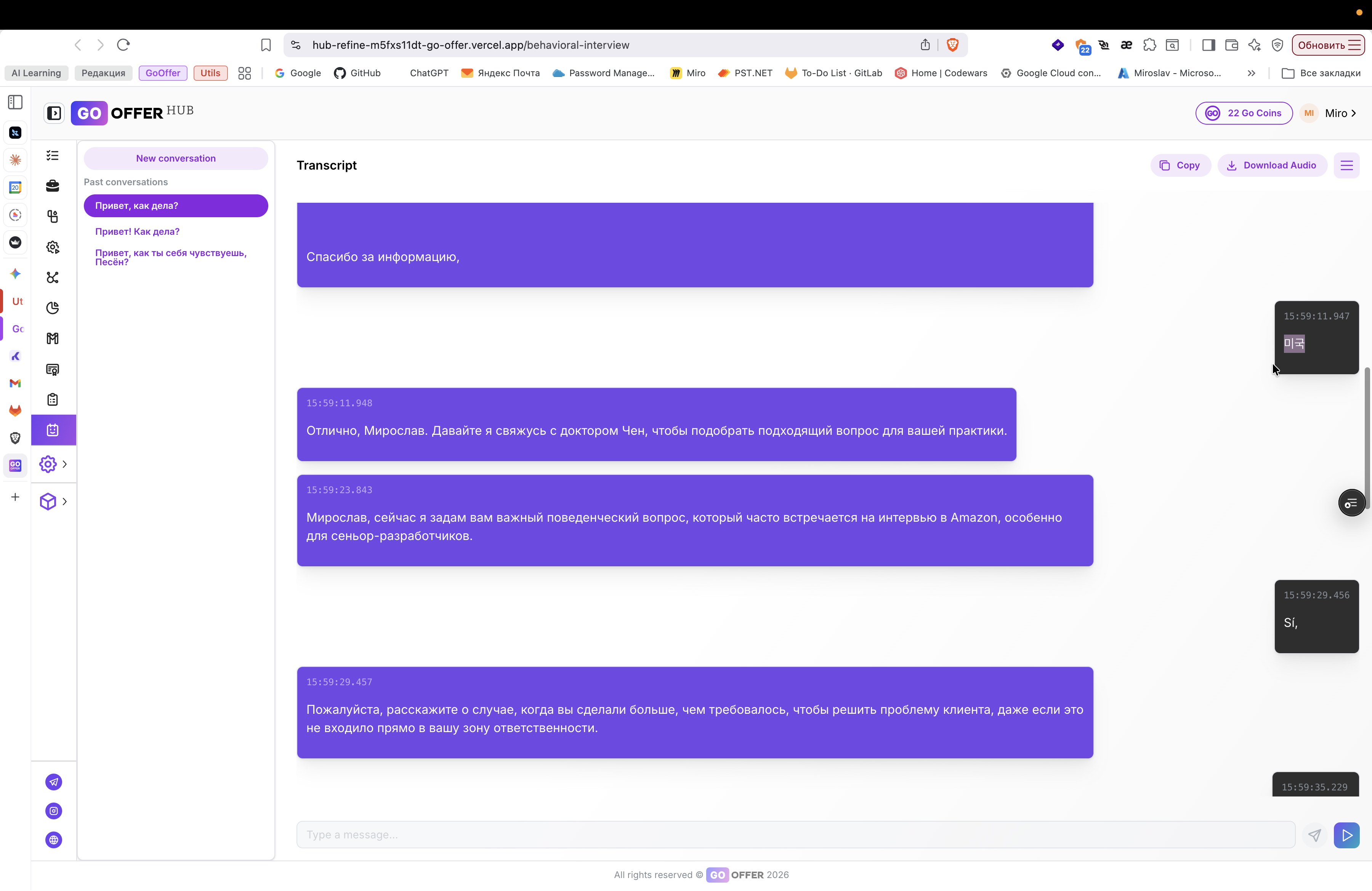 Описание ошибки в Go Offer Hub: задержка аудио, самопроизвольный диалог ИИ и генерация текста на сторонних языках.