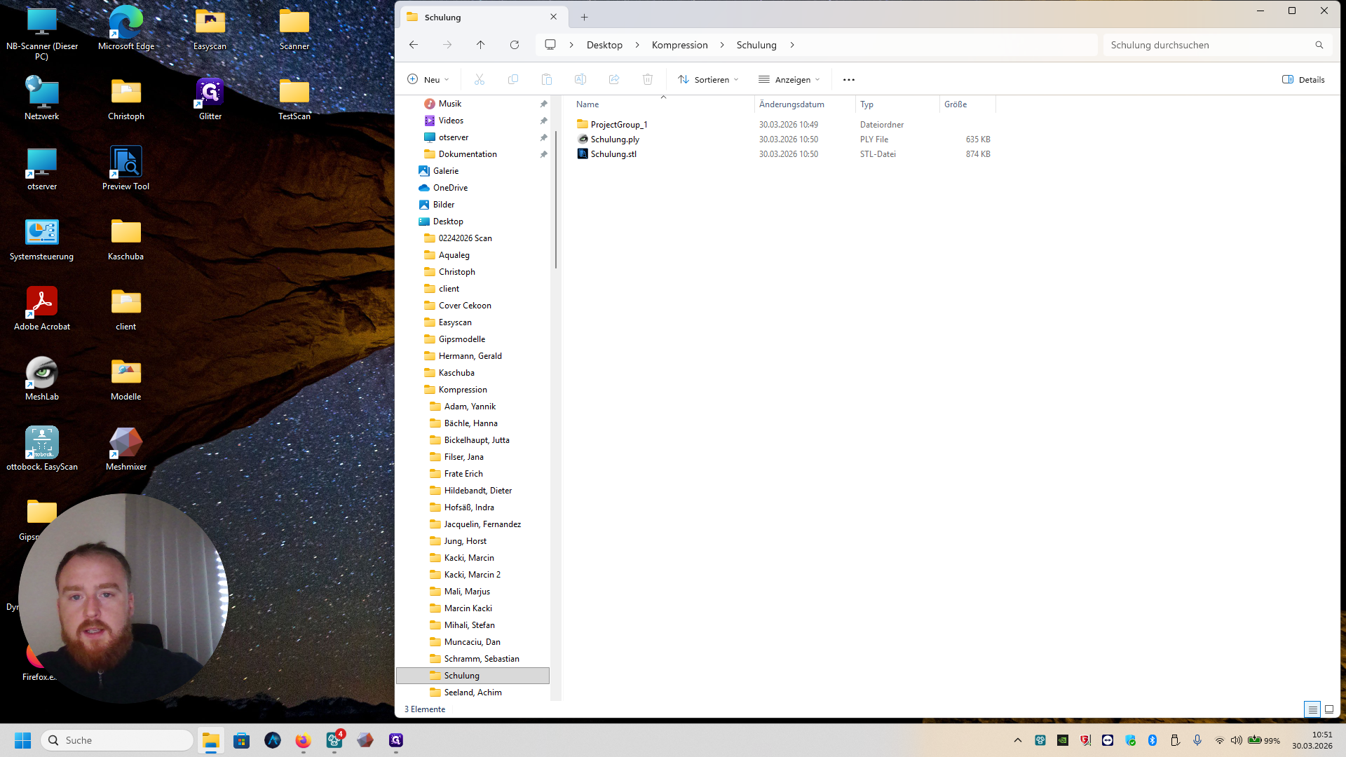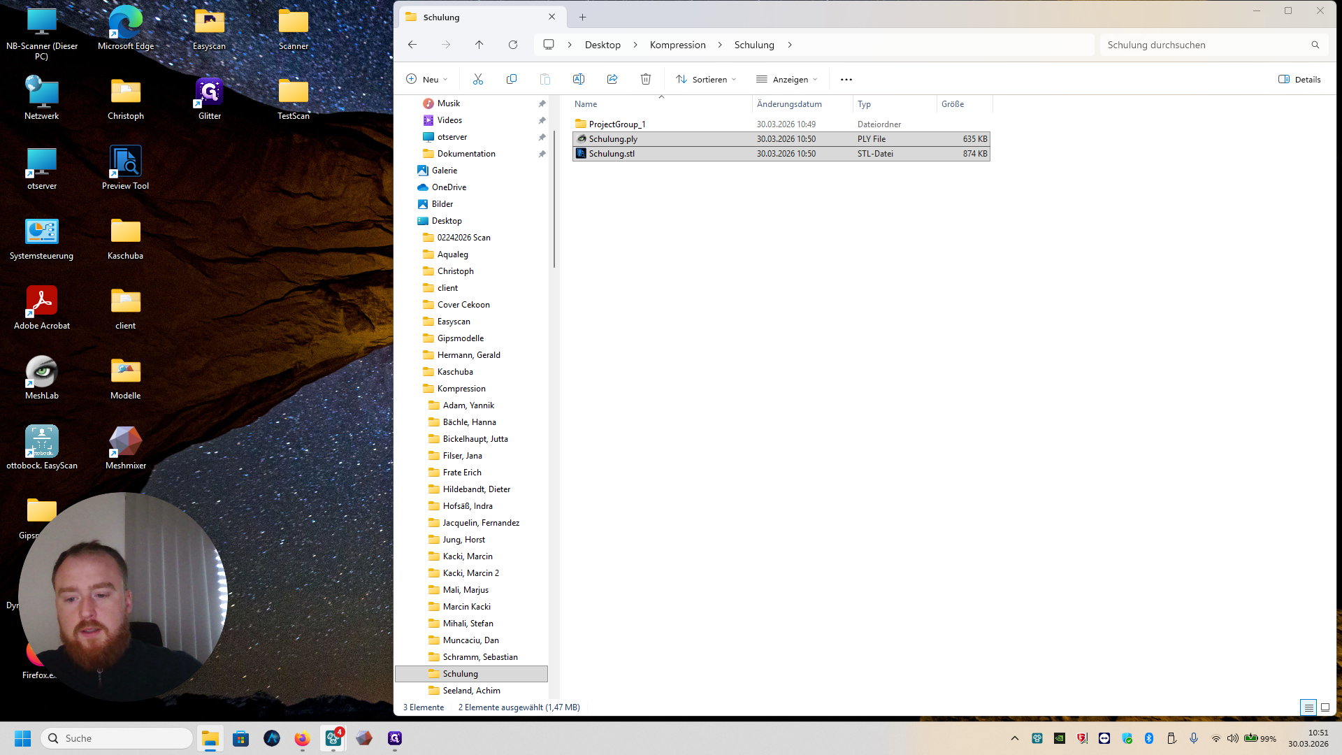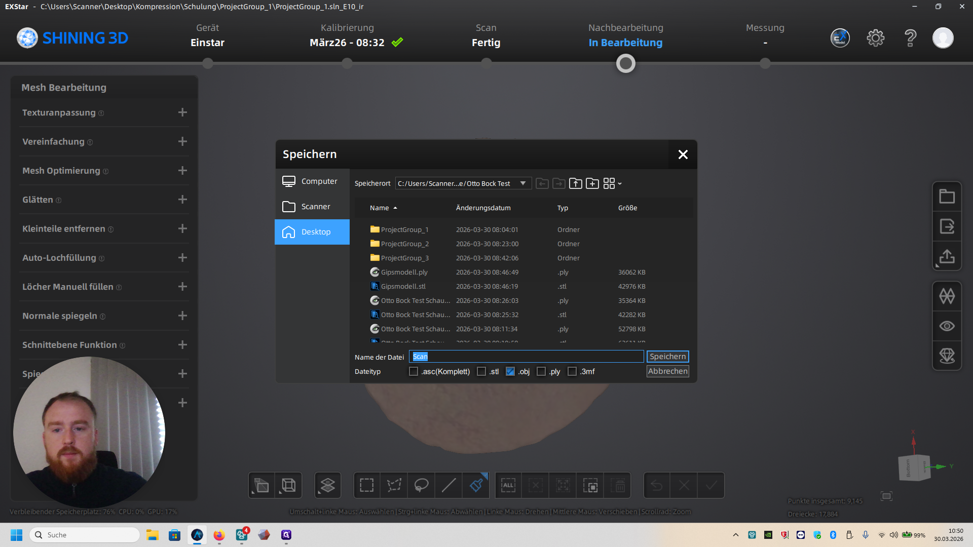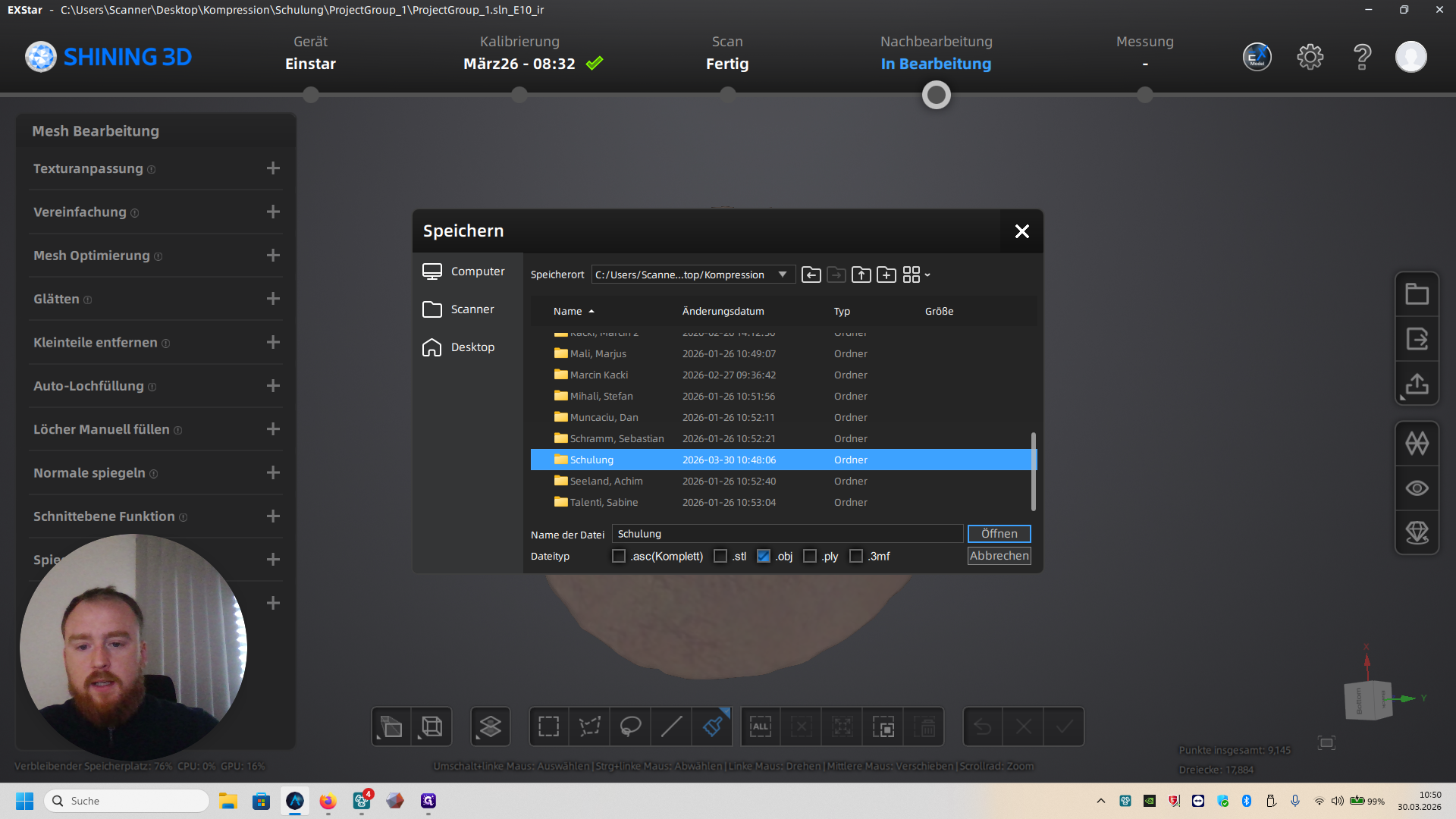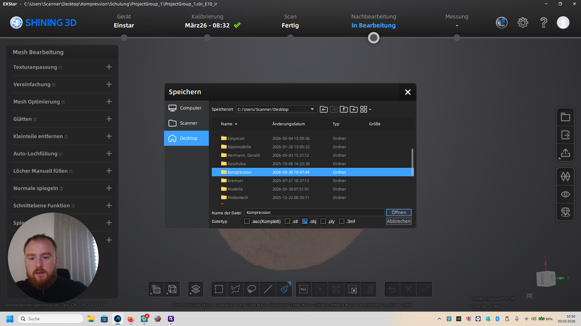 Dann müsst ihr noch einmal in Kompression in euren angelegten Ordner gehen. Speichert die Datei als PLY und STL und Entfernt Obj