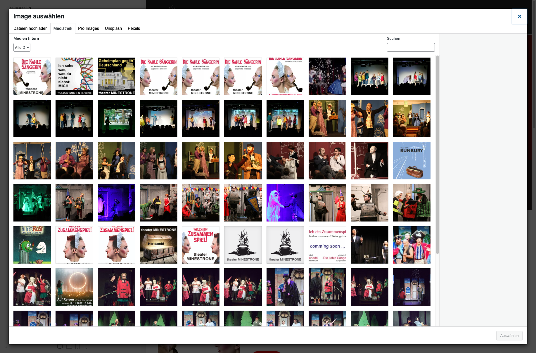 Klicke hier auf das Startseite-Logo. Jetzt haben wir hier oben die Slideshow. Klicke auf das Feld. Jetzt hast du deine einzelnen Einträge zu den Punkten für den Slider. Wenn du auf einen bestehenden Eintrag gehst, zum Beispiel den obersten, kannst du hier oben das Bild auswählen. Die Informationen zum Bild hatte ich dir schon damals in einer E-Mail mitgeschickt. Du lädst das Bild hoch, indem du es hier auswählst.