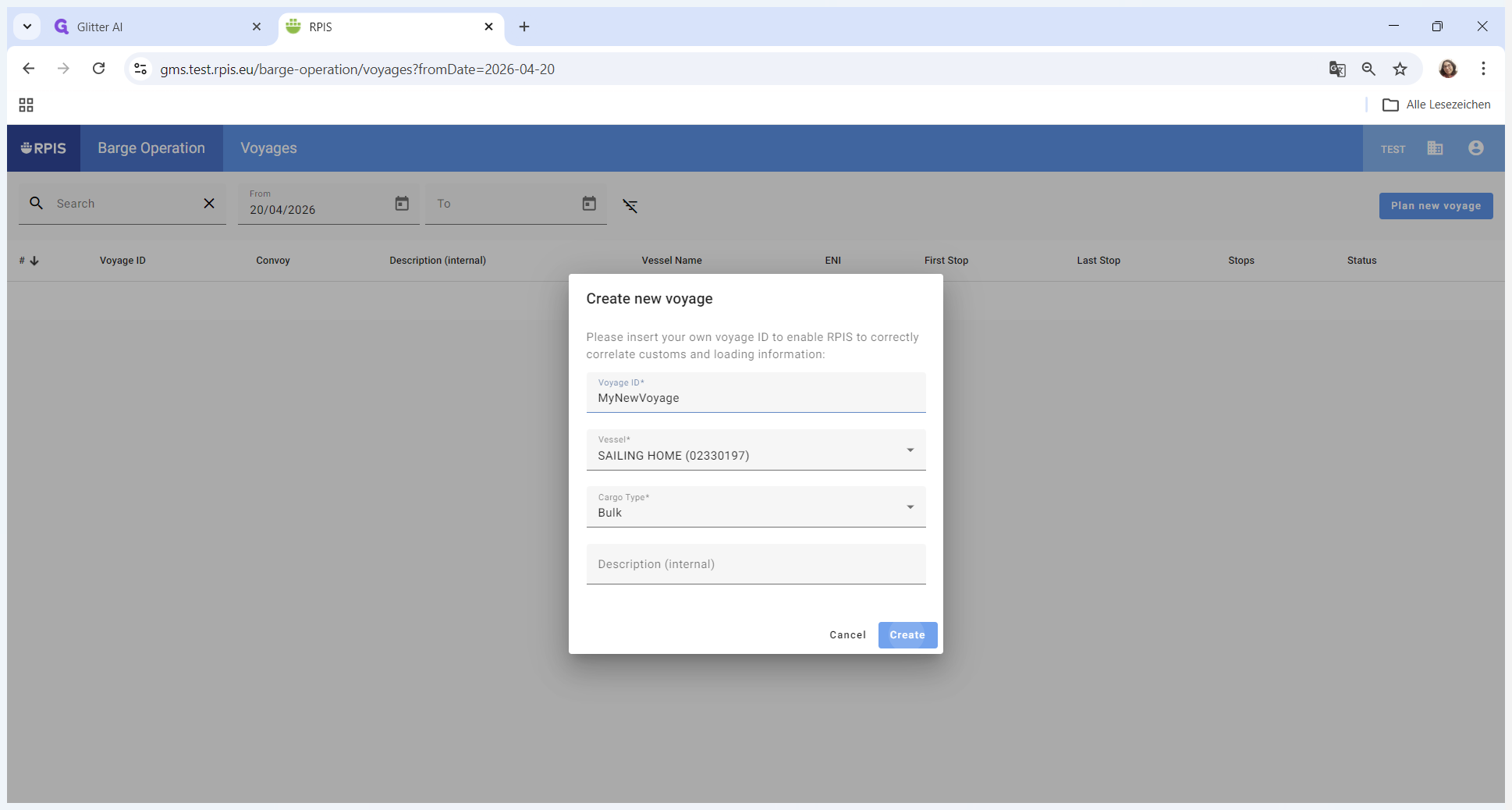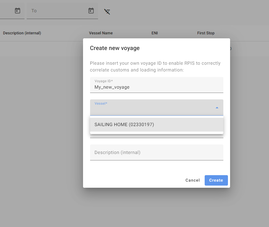 Enter a Voyage ID (free text field) and select your vessel from the dropdown menu