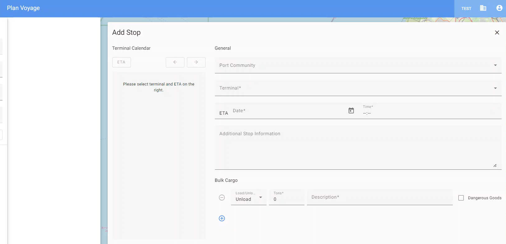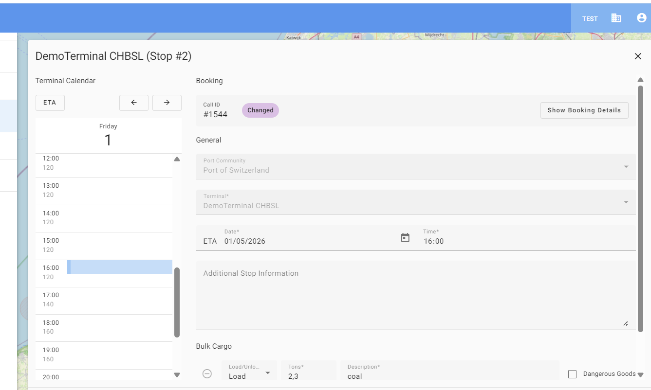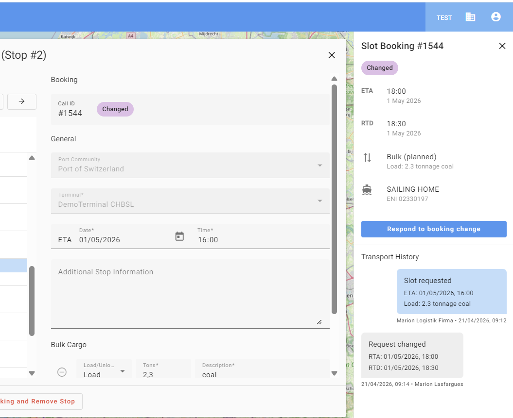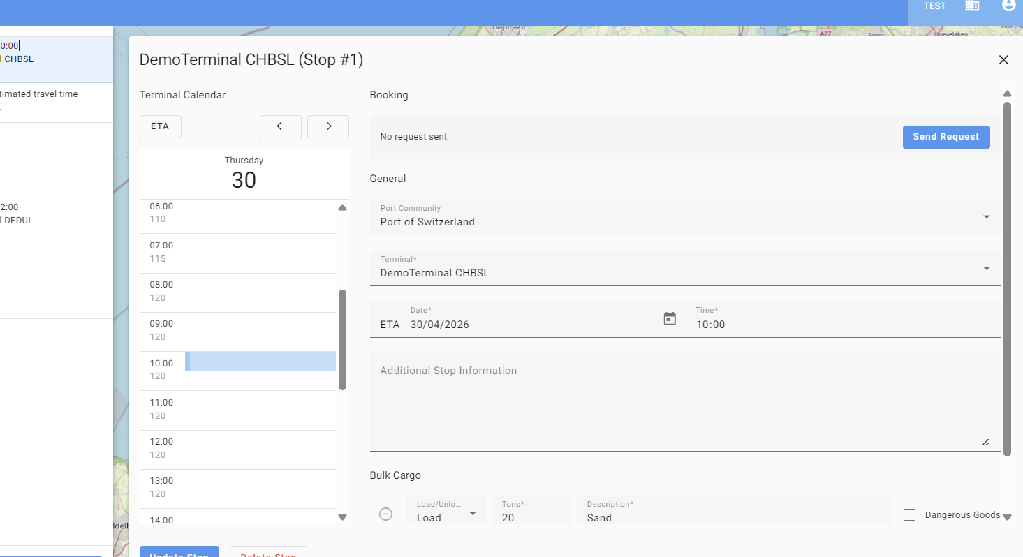 To book a slot at the terminal, select the stop and submit your request by clicking on 'Send request'.