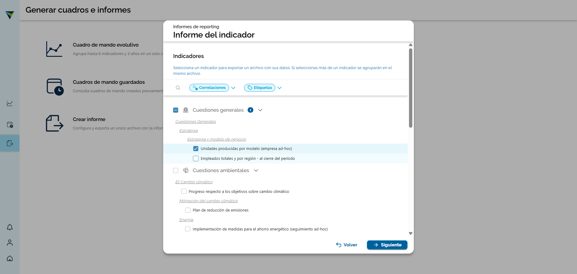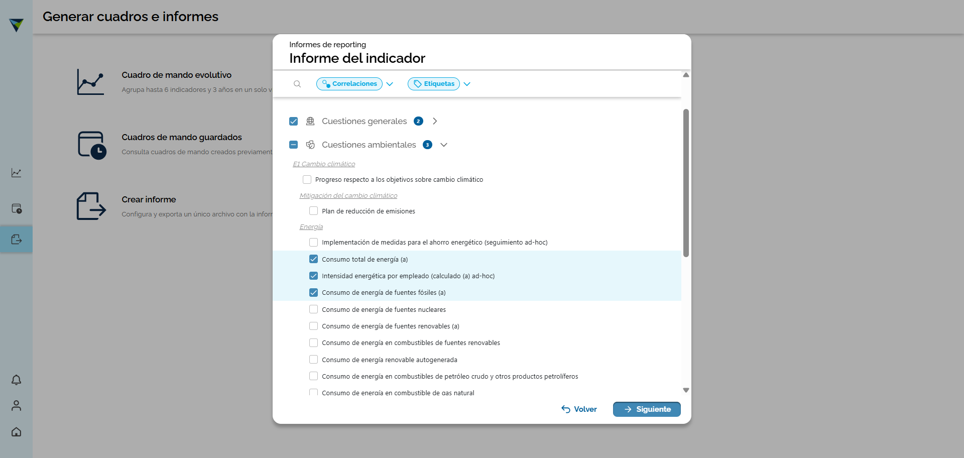 Seleccionar los indicadores que se desean visualizar en el informe consolidado. Se pueden utilizar filtros de correlaciones o filtros de etiquetas para mostrar solo los indicadores necesarios y seleccionarlos más fácilmente.