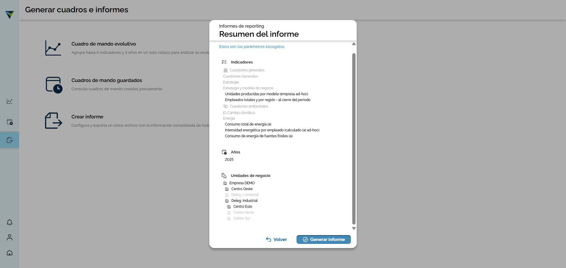 En el resumen final se mostrarán los indicadores y las unidades de negocio previamente seleccionados para la exportación de la información consolidada. A continuación, haz clic en "Generar informe" para comenzar.