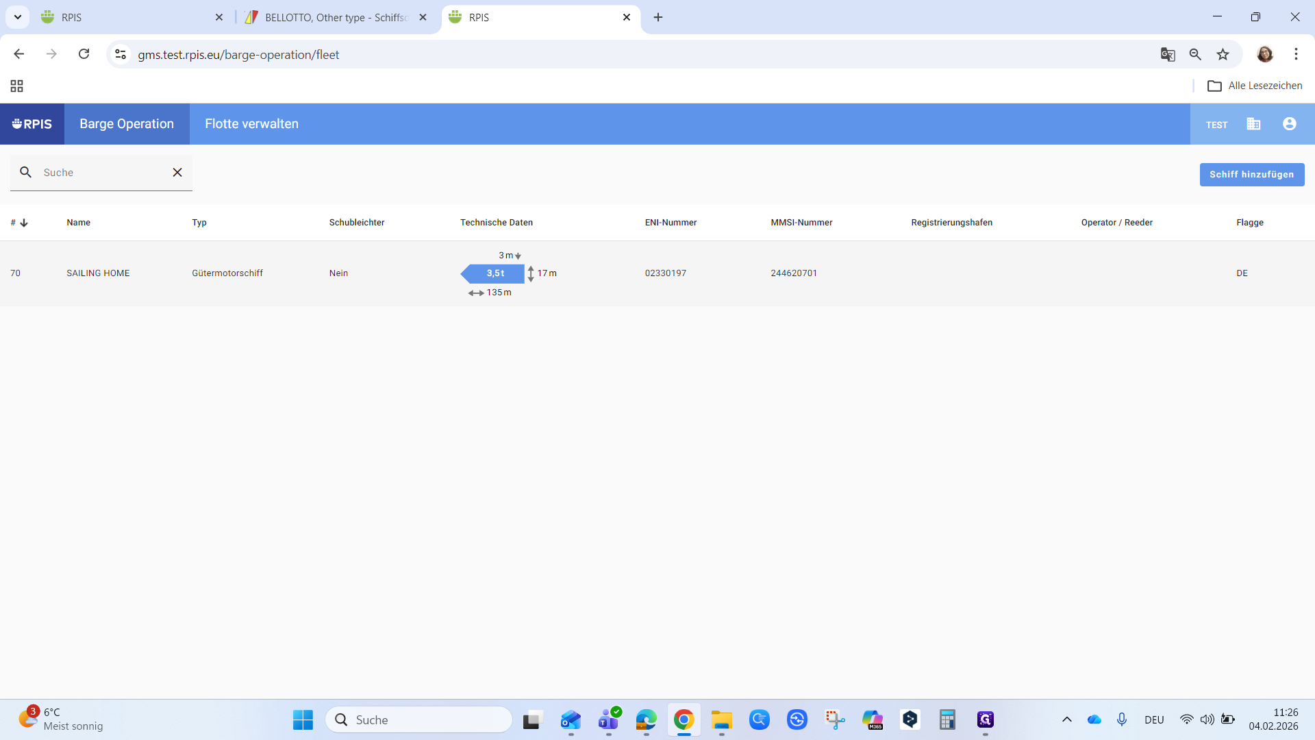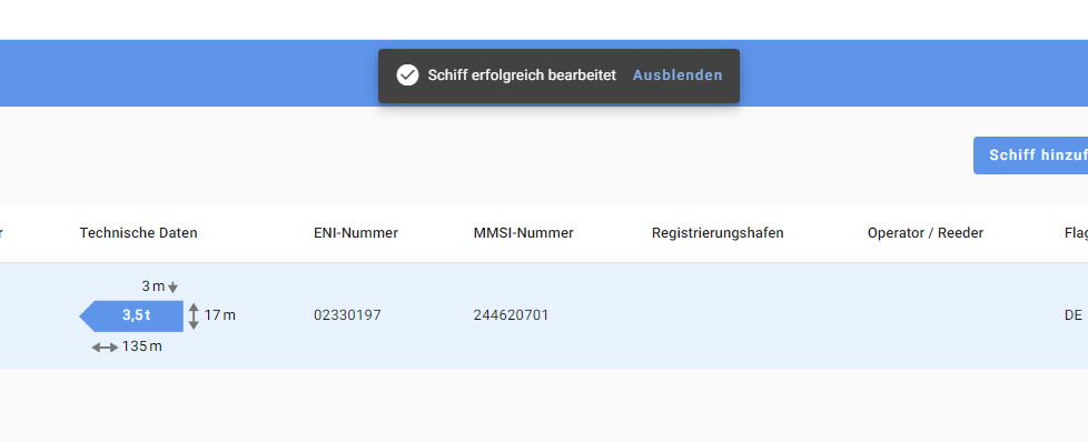 Als Barge-Operator können Sie in RPIS die neuen Pflichtangaben zu den Schiffen Ihrer Flotte "Tiefgang", "Tragfähigkeit" und "AIS-Signal" überprüfen, ergänzen oder ändern. Dies erfolgt im Abschnitt „Flottenmanagement“.