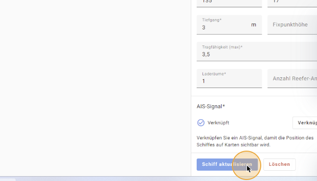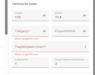 Im Informationsbereich auf der rechten Seite den Tiefgang und die Tragfähigkeit überprüfen und ggf. vervollständigen. Dabei darauf achten, dass auch alle anderen mit * gekennzeichneten Felder ausgefüllt sind.