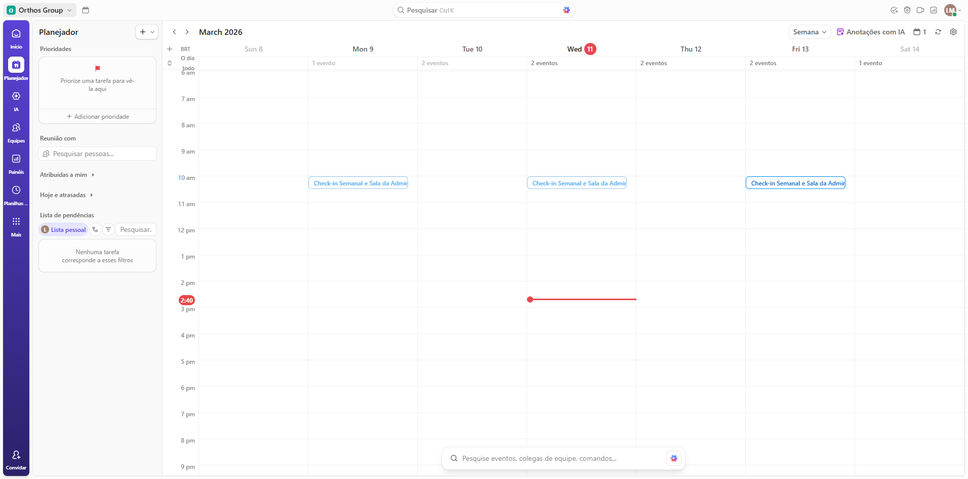 E então, ele vai carregar o planejador. Neles, vão aparecer algumas demandas já agendadas, como o check-in semanal que está ali, e as outras que forem sendo atribuídas para vocês.