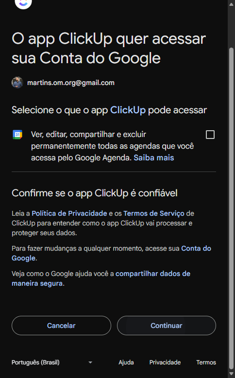 Aí normalmente aparece essa janela de novo aqui, que é meio bugadinha. Mas aí, clique em "Google Agenda" de novo. Escolha seu e-mail tal qual feito nos passos anteriores e continue.