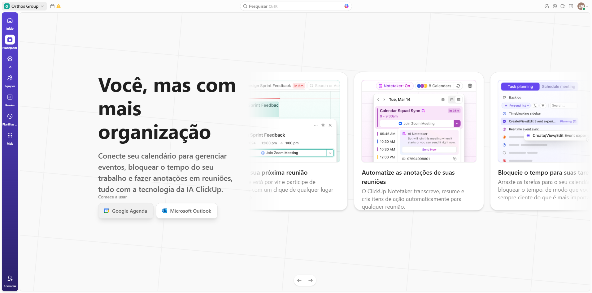 No primeiro momento em que acessarem o ClickUp, vocês devem: Vocês devem clicar em "Planejador" e depois em "Google Agenda".