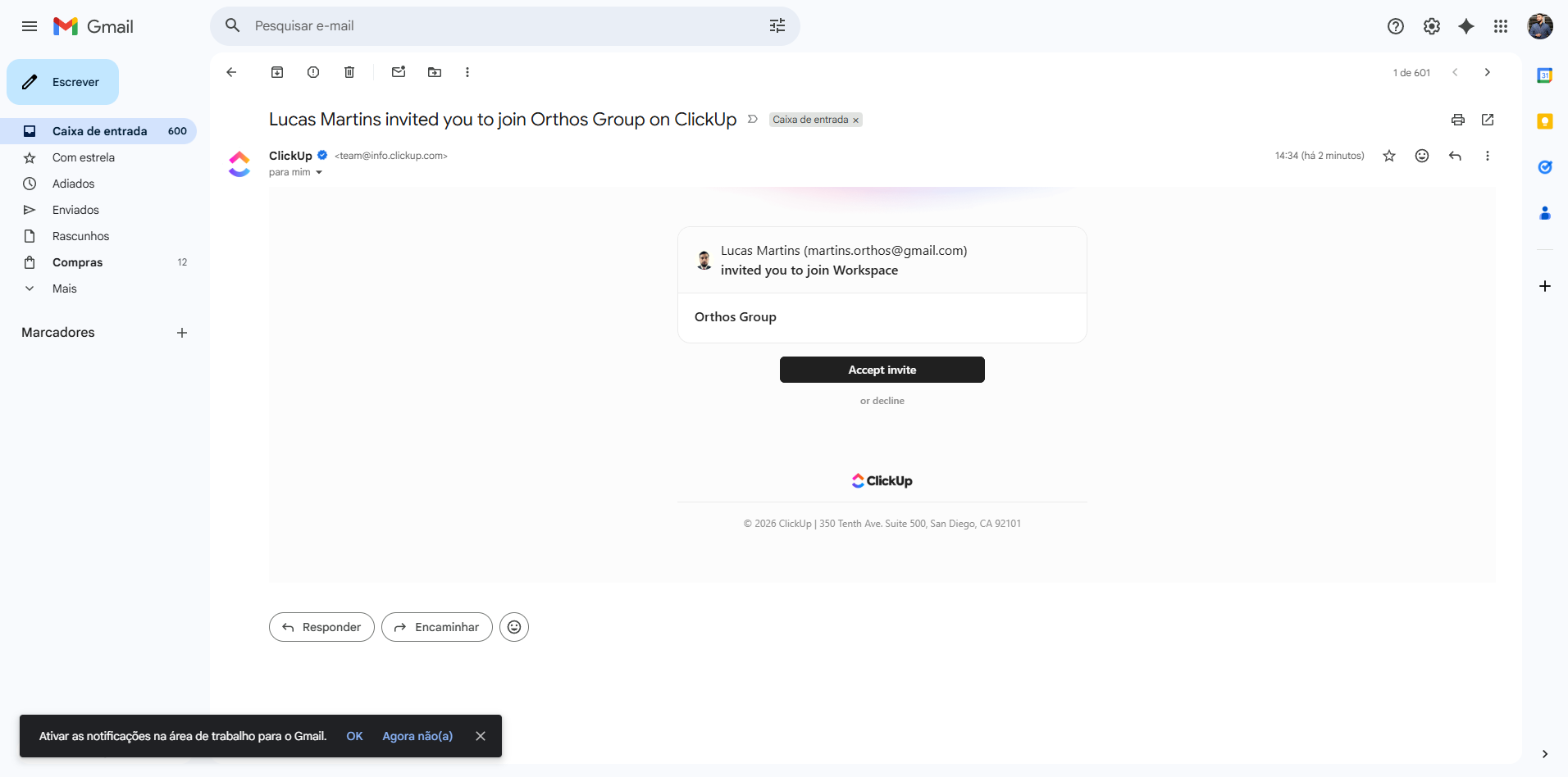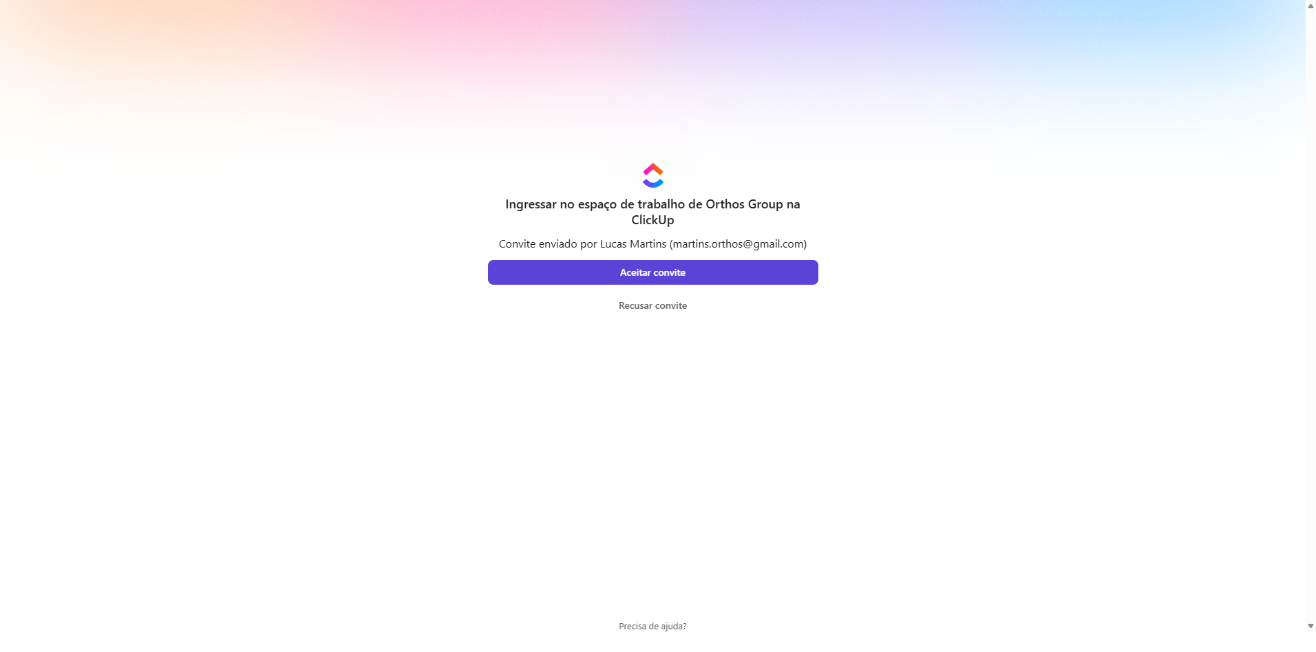 Então, este é o tutorial de como acessar o ClickUp. Vocês receberam em seus e-mails pessoais o convite. É algo parecido com isto, certo?
