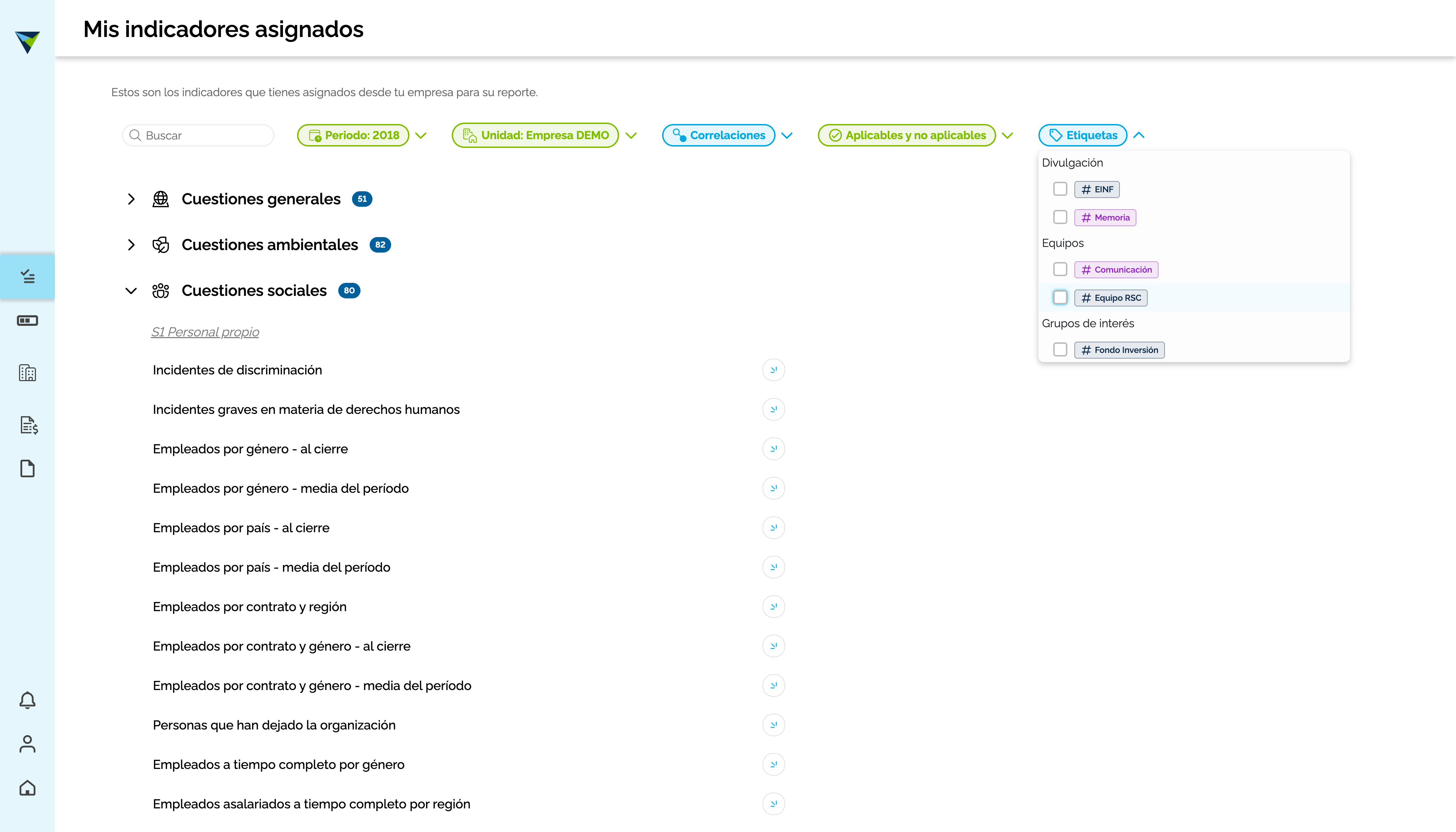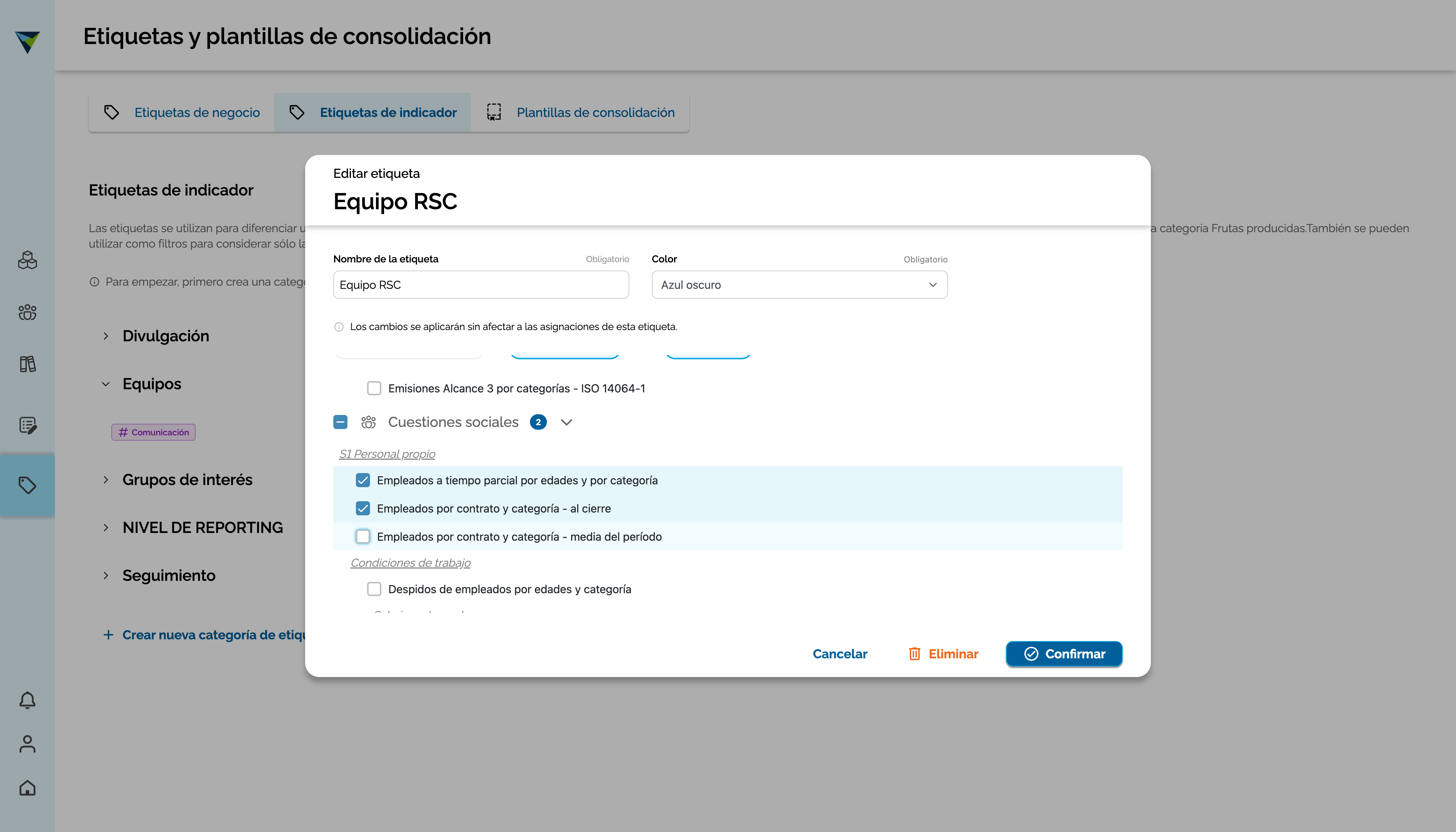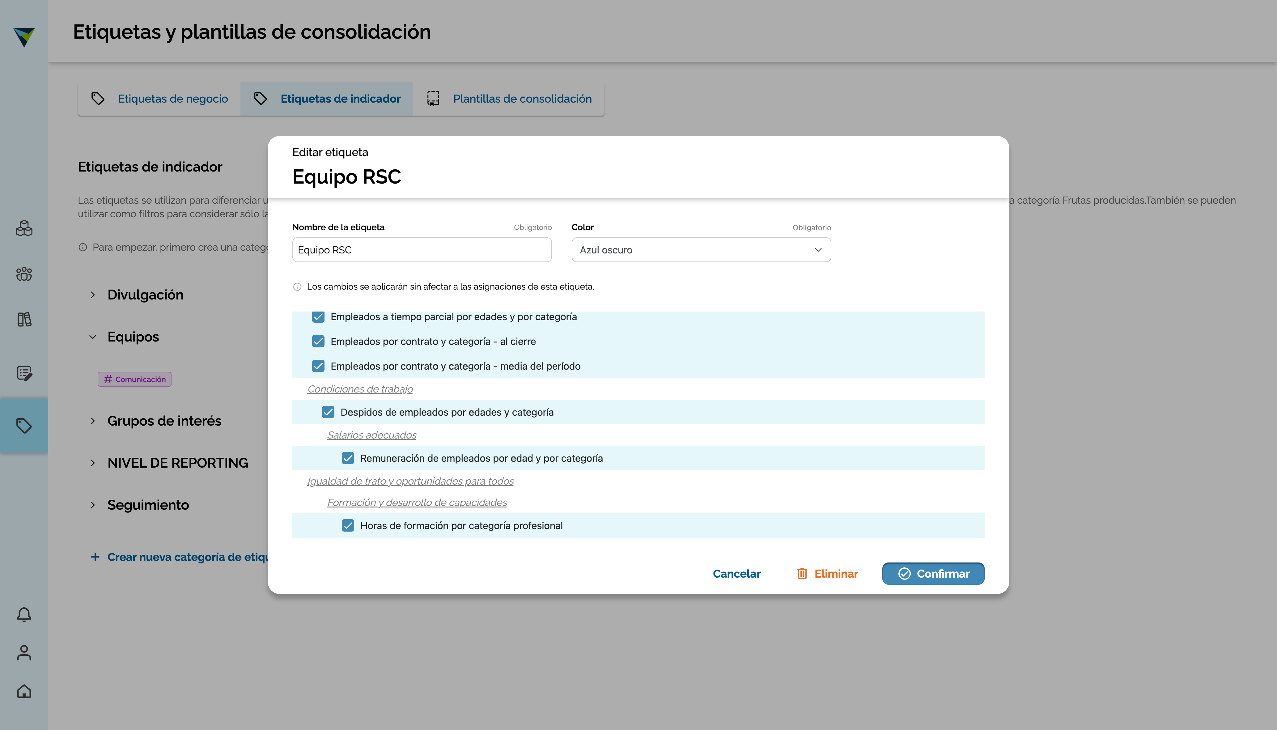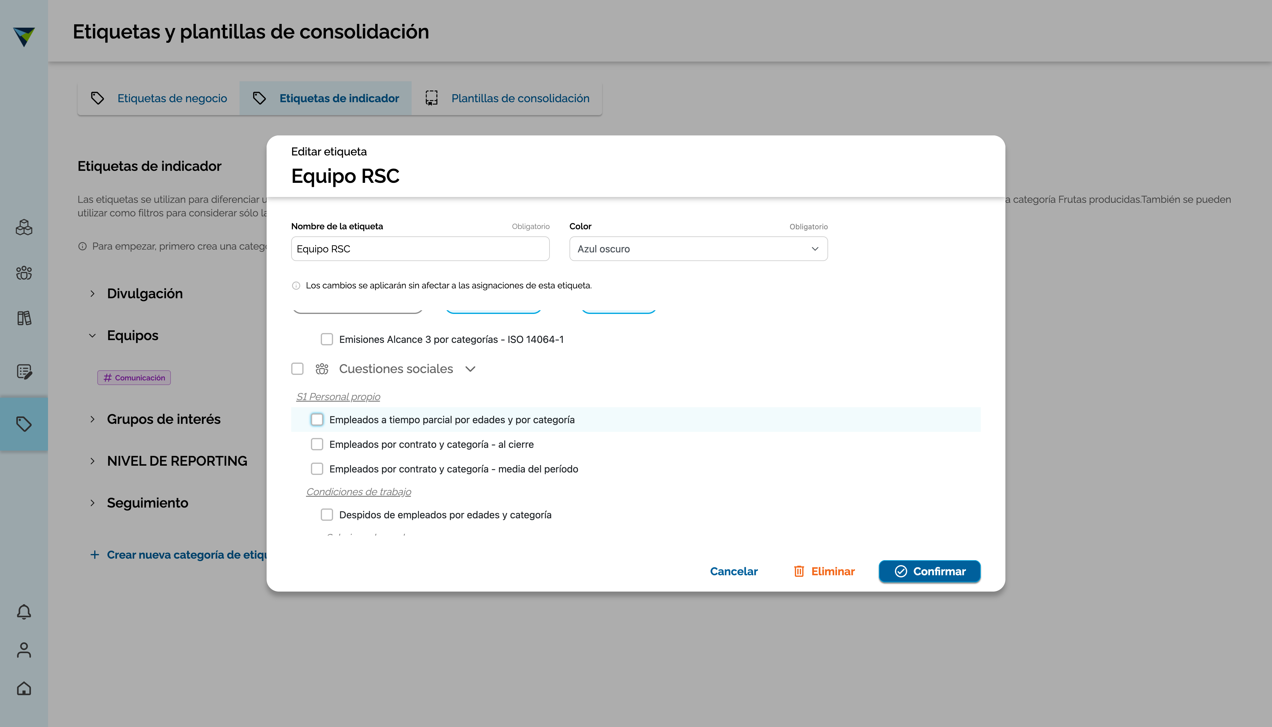 Por ejemplo, vamos a asignar esta etiqueta a todos los indicadores sobre empleados que tienen información por categorías, seleccionando varios indicadores.