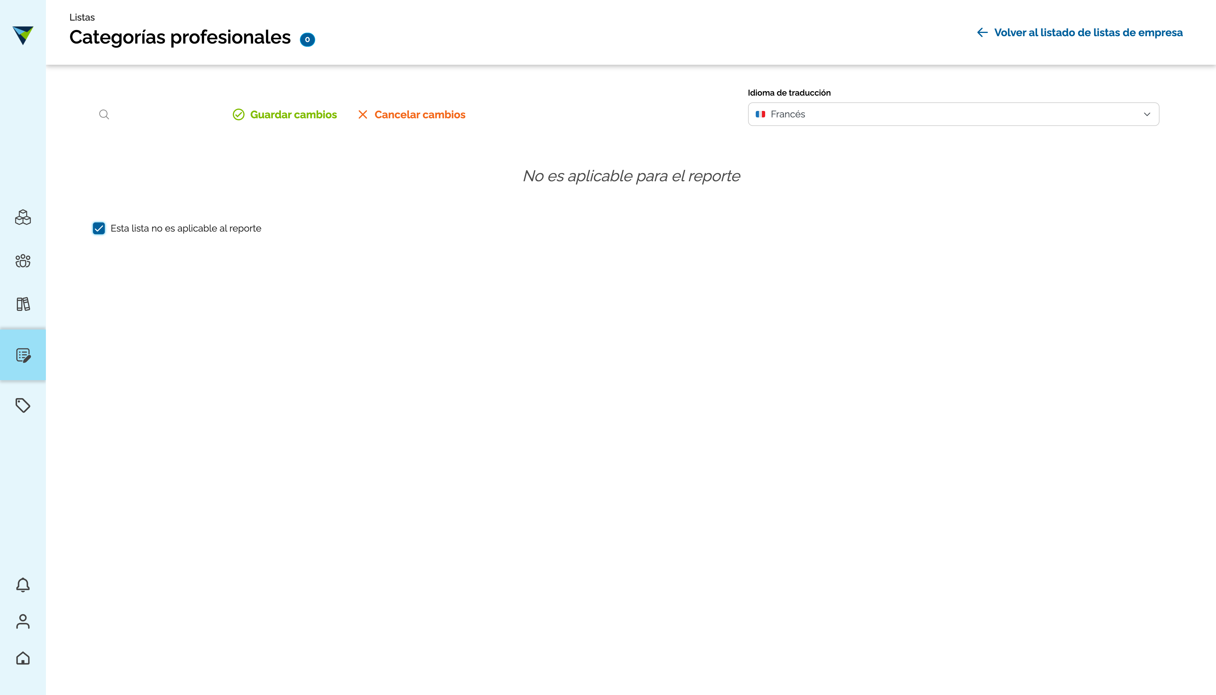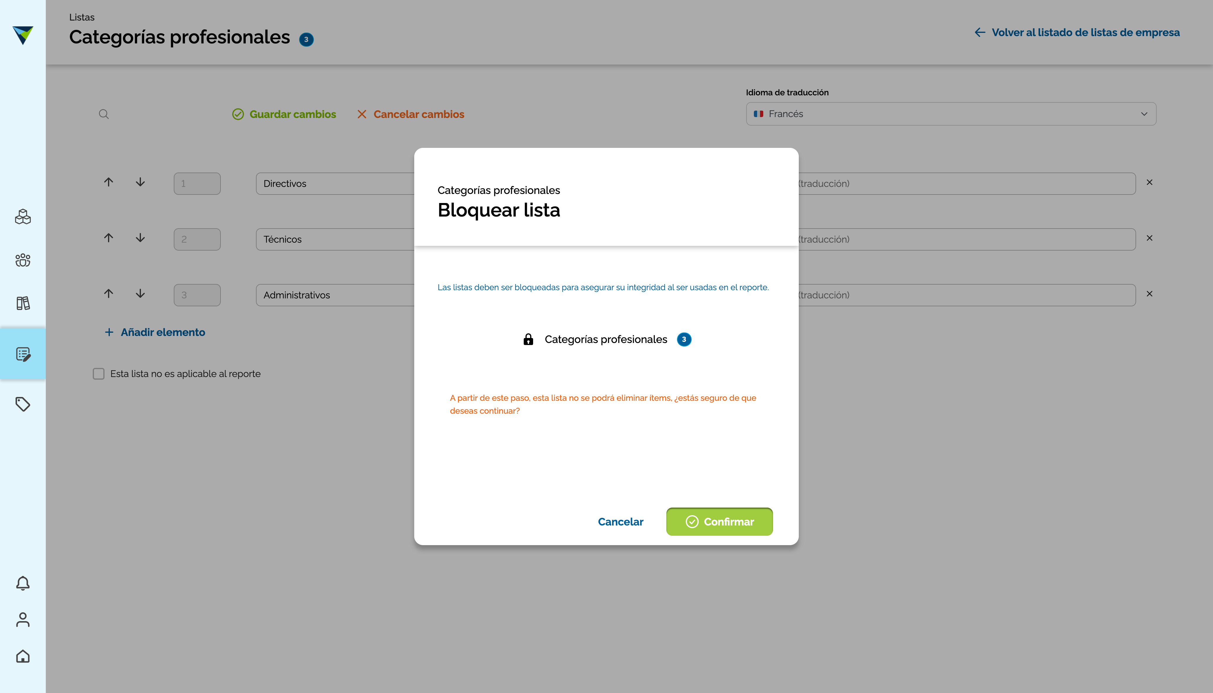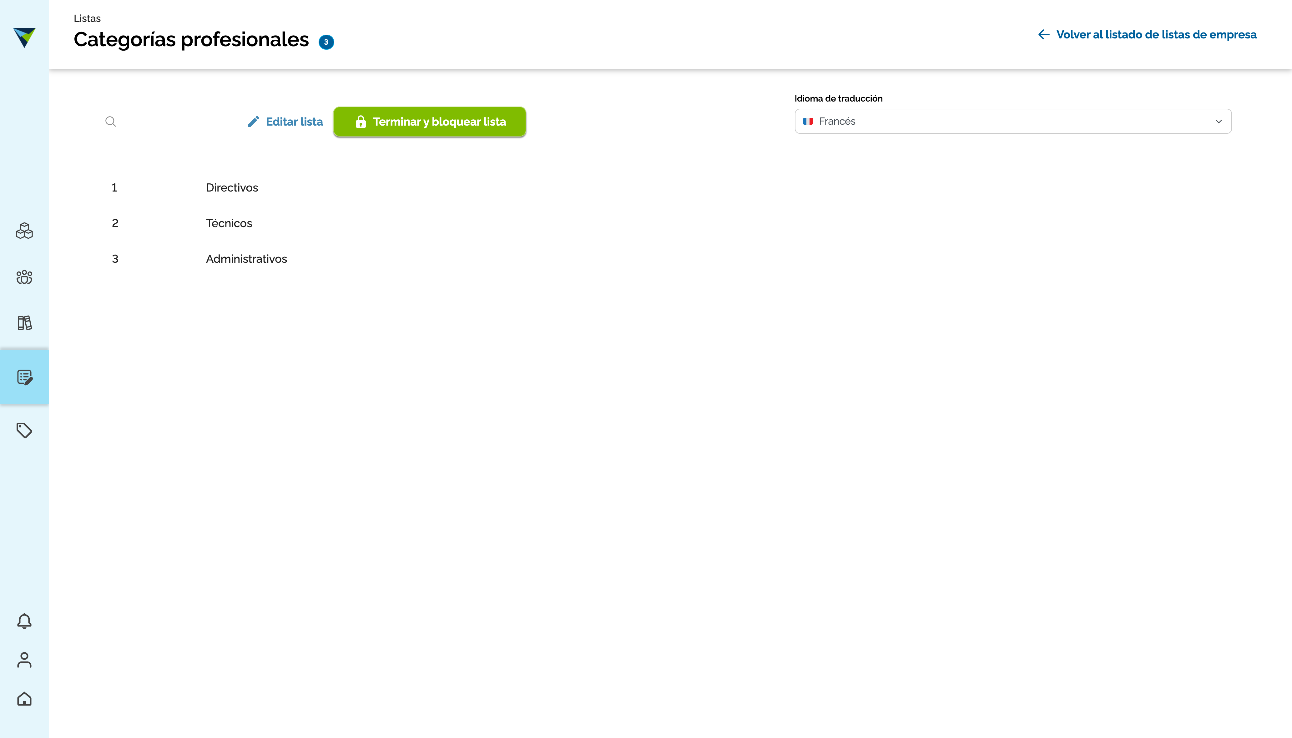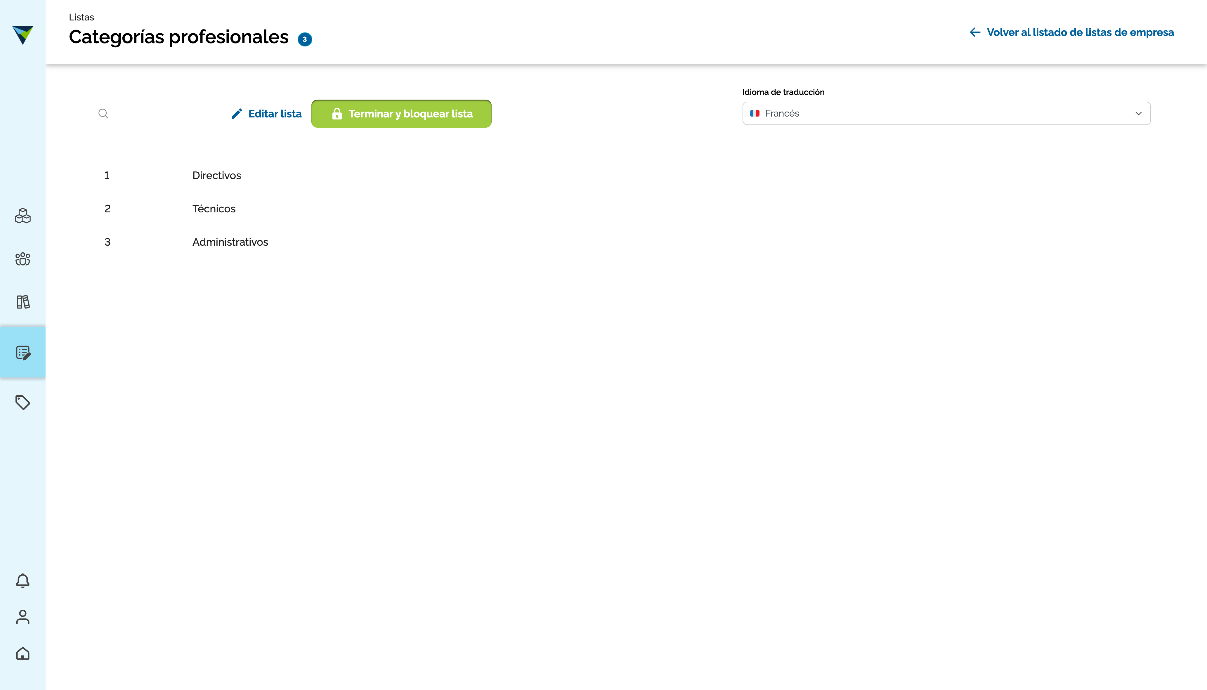 Una vez que la lista está completa y no hay más categorías profesionales que use la empresa ni idiomas necesarios, se guarda y finaliza bloqueando la lista. Esto es imprescindible para que se pueda usar.