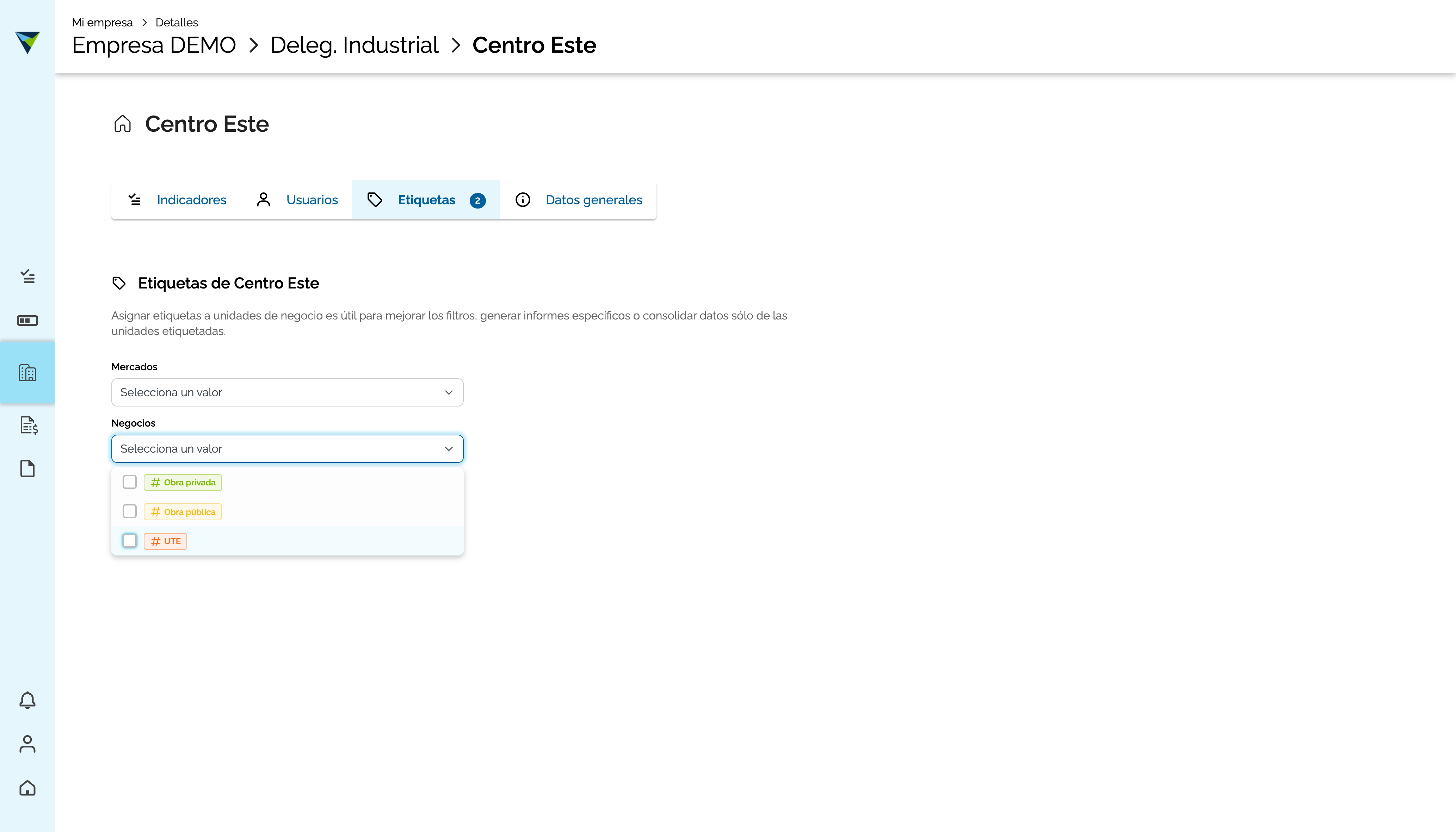 Aquí veo las distintas unidades de negocio con las etiquetas ya asignadas. También veo la etiqueta que acabo de crear y puedo determinar que esta unidad de negocio, por ejemplo, el centro oeste, la necesita. Hago clic, voy a configurarlo y le vinculo la etiqueta del negocio que acabo de crear.