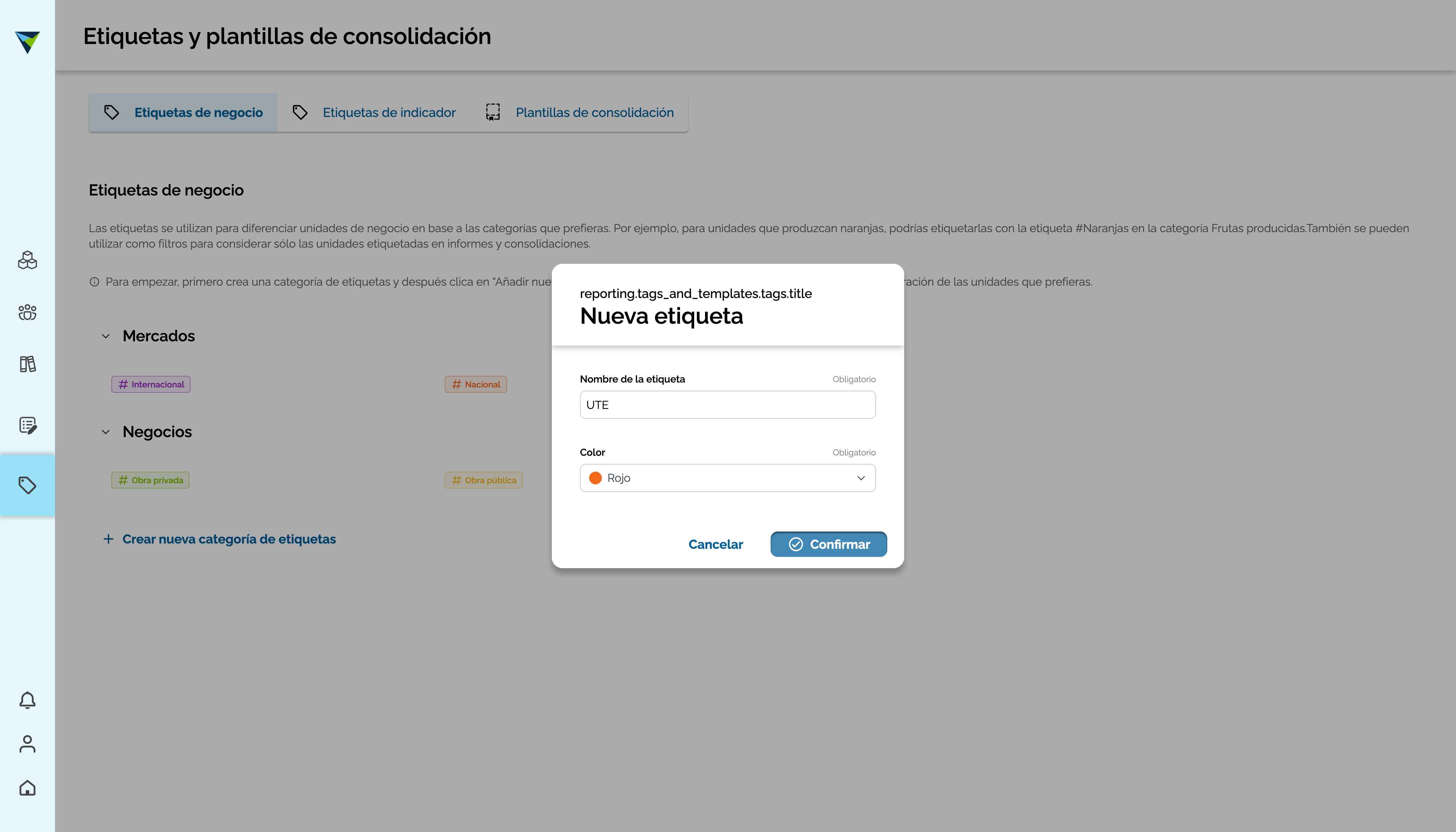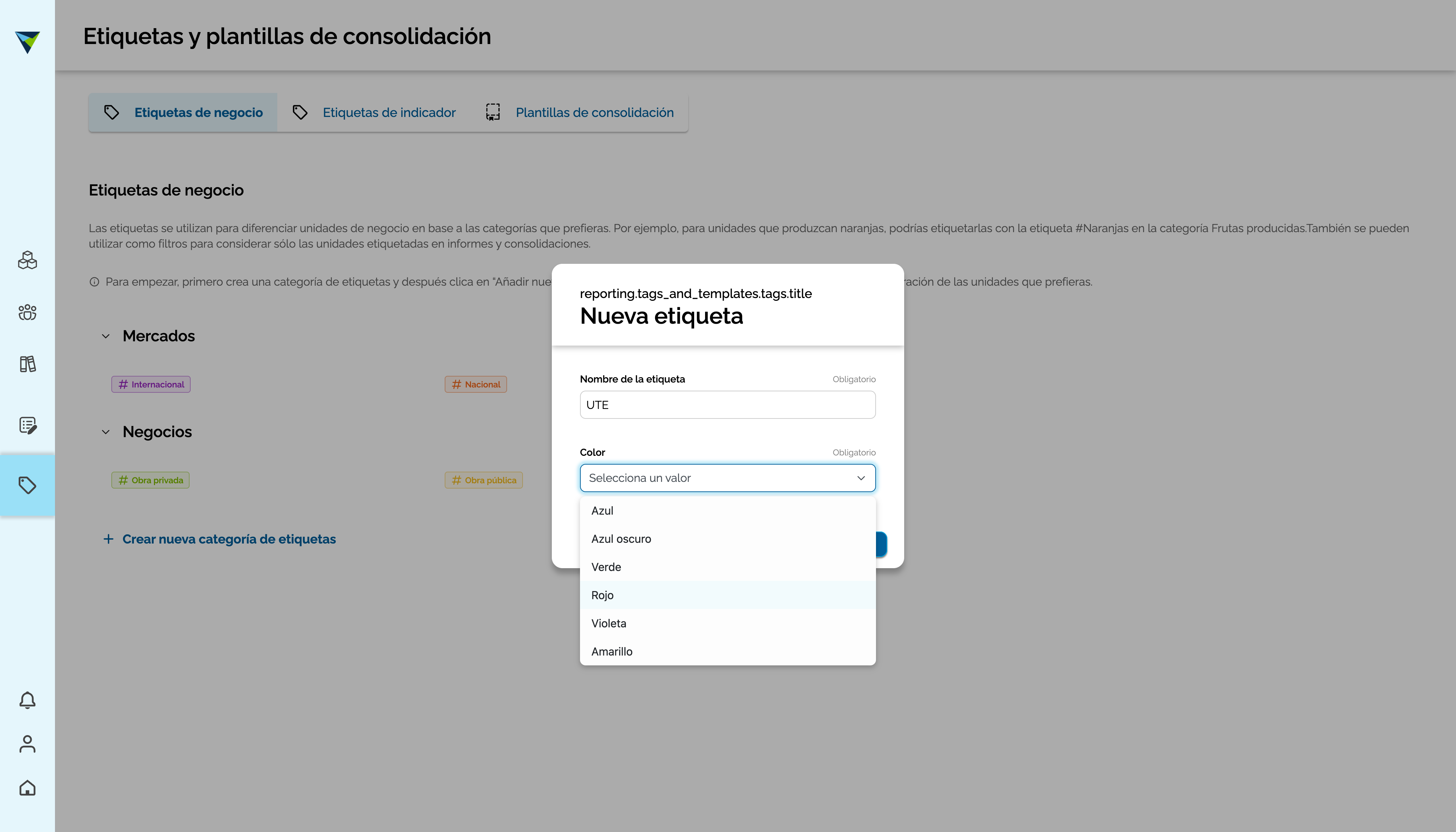 Esto es, al hacer clic aquí, puedo etiquetar mi estructura de negocios. Aquí tenemos varias etiquetas. Por ejemplo, vamos a agregar una etiqueta nueva aquí, "UTE" que en este caso será unión transitoria de empresas o unión temporal de empresas.