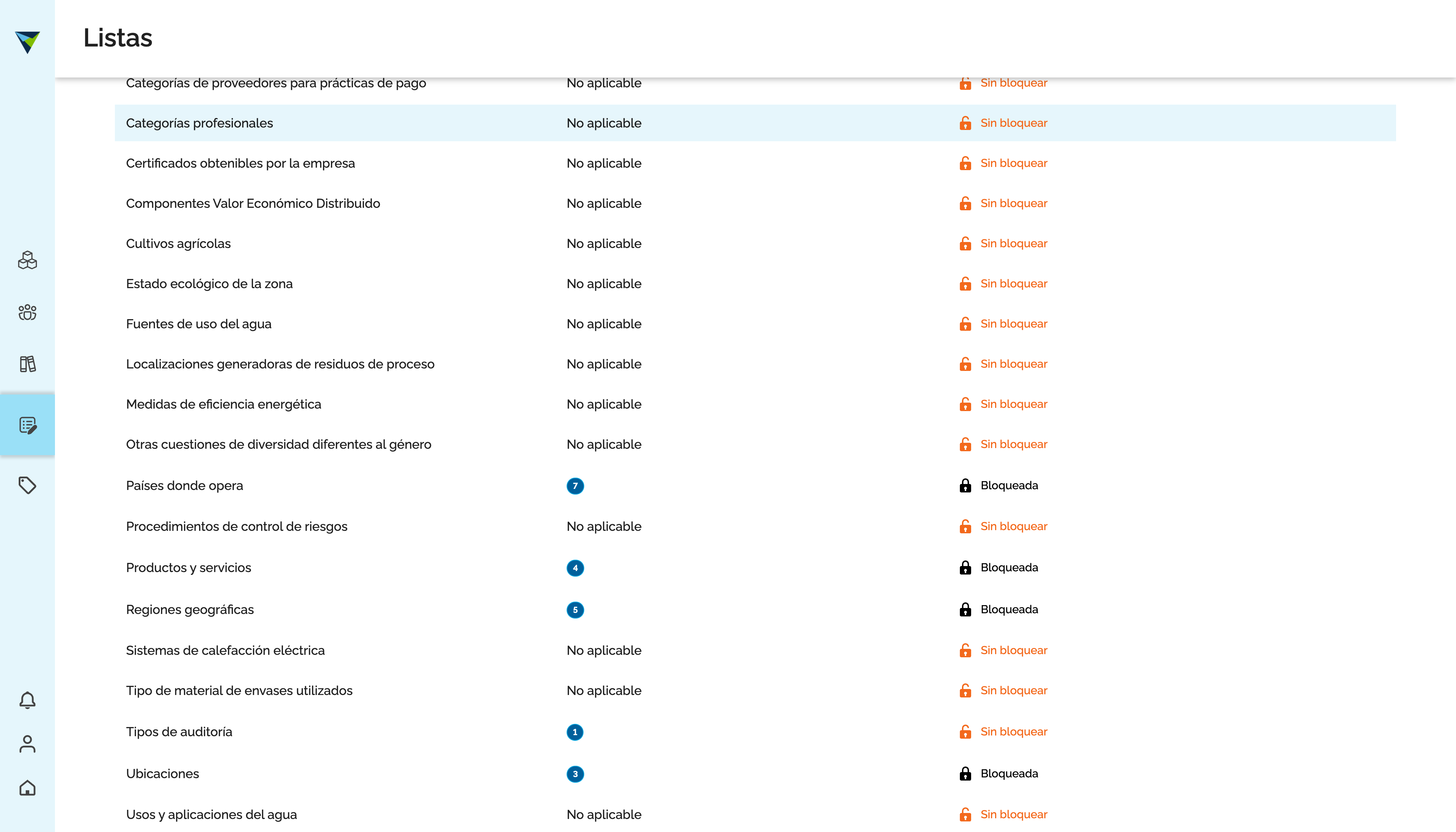 Vamos a tomar una de las más habituales: «categorías profesionales». Si hacemos clic en esta lista, vemos que por ahora no está en uso y no está bloqueada.