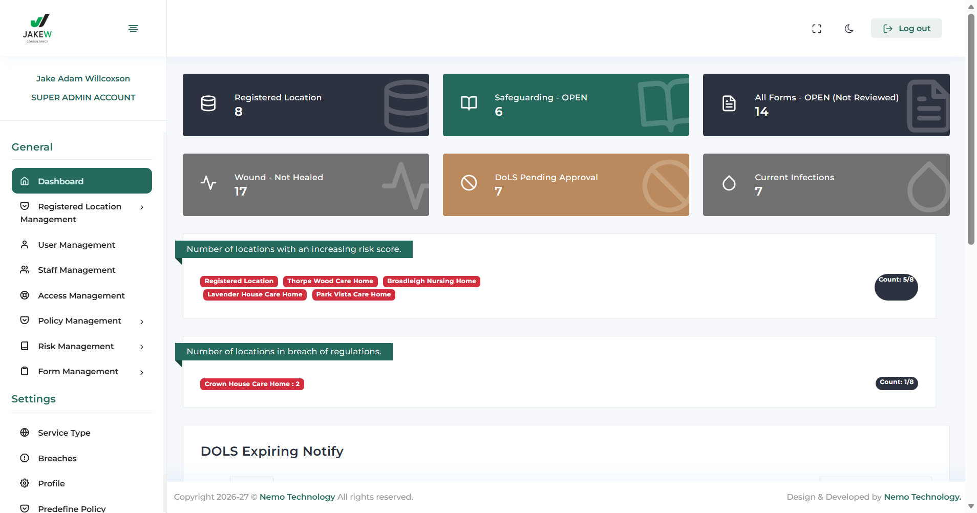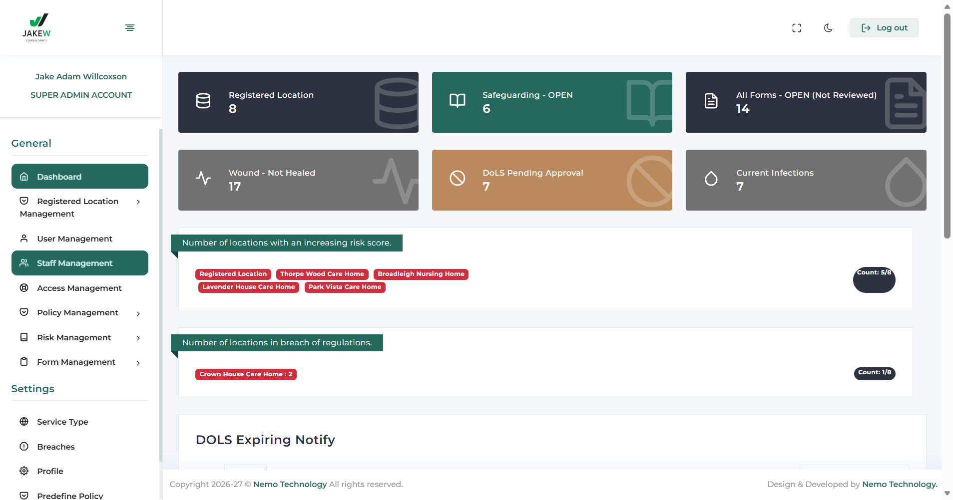 In this guide, we'll learn how to use the dashboard for the login software to manage locations, safeguardings, forms, wounds, and infections. We will also cover how to view and update records, track risk trends, and manage staff and user accounts. This will help you understand how to navigate the system and keep your service information up to date.