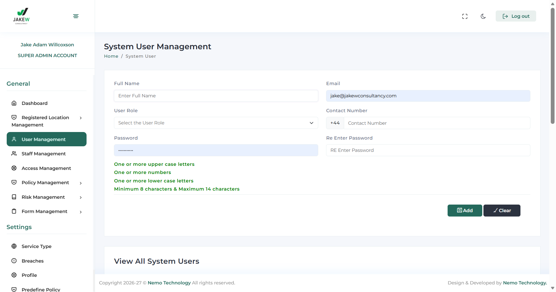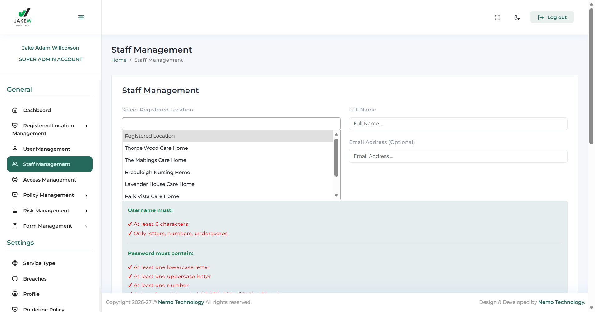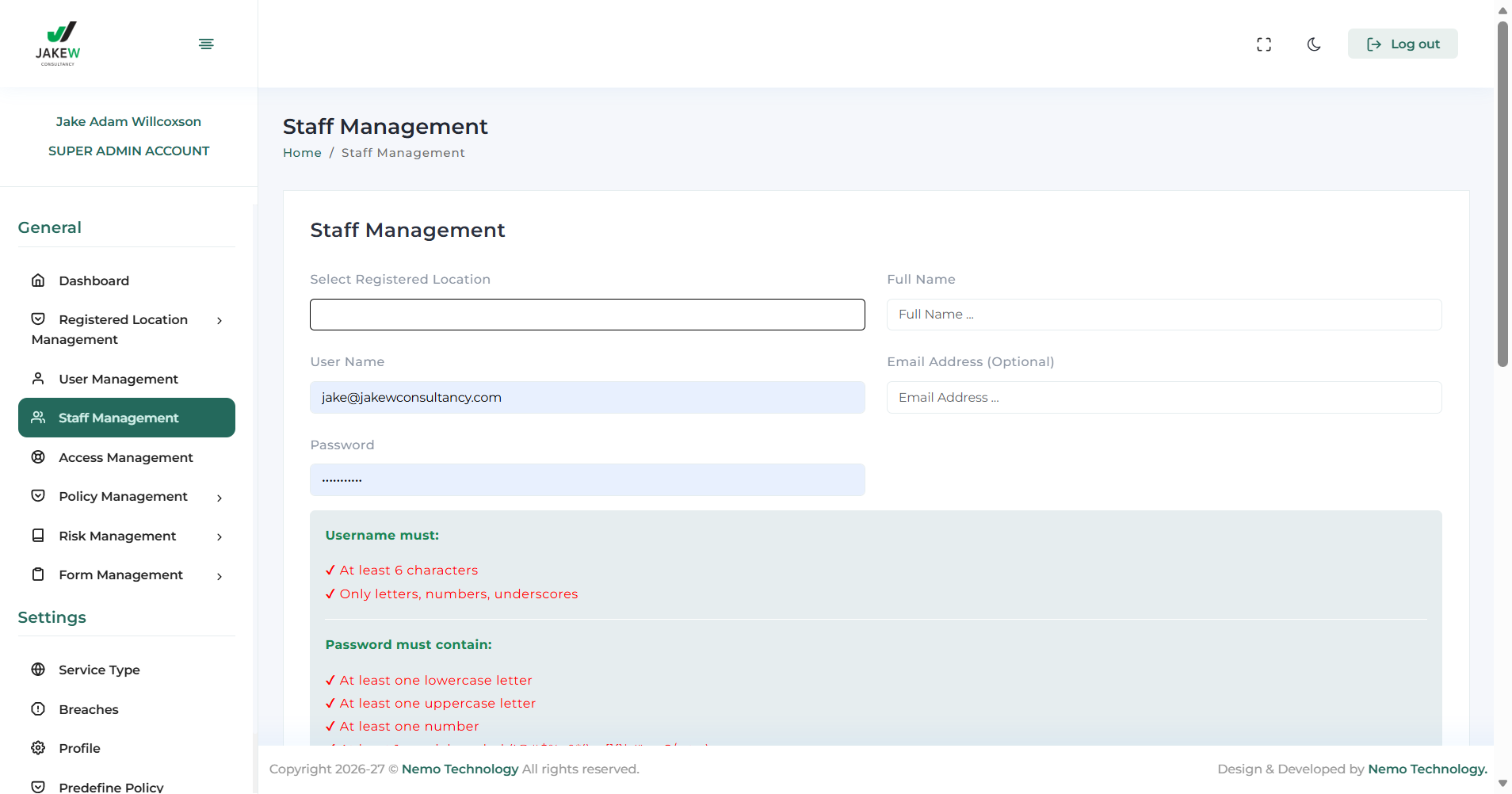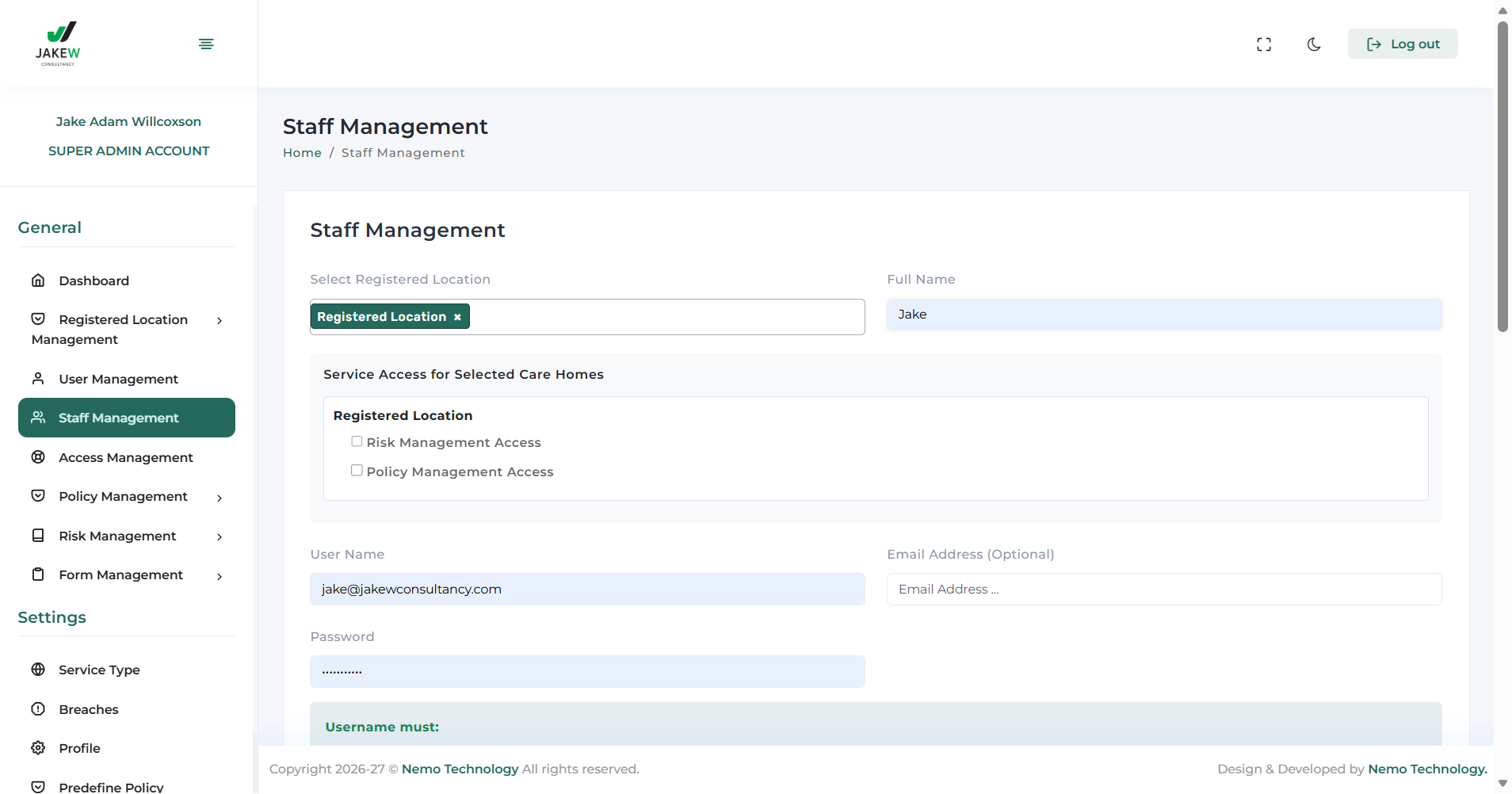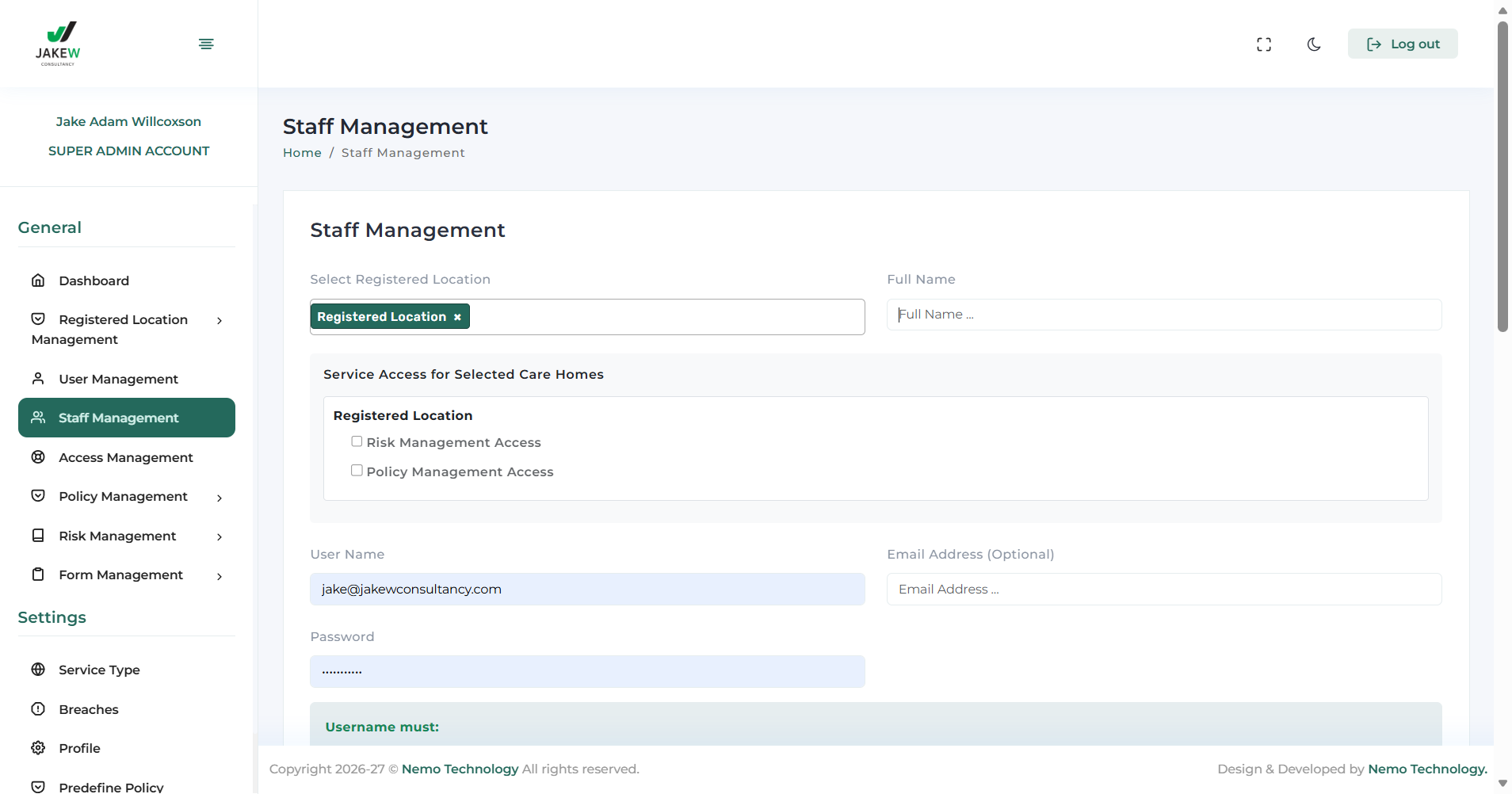 Select their location. Enter the staff member's name. Choose whether they need access to raise forms and view policies, only view policies, or just access policies.