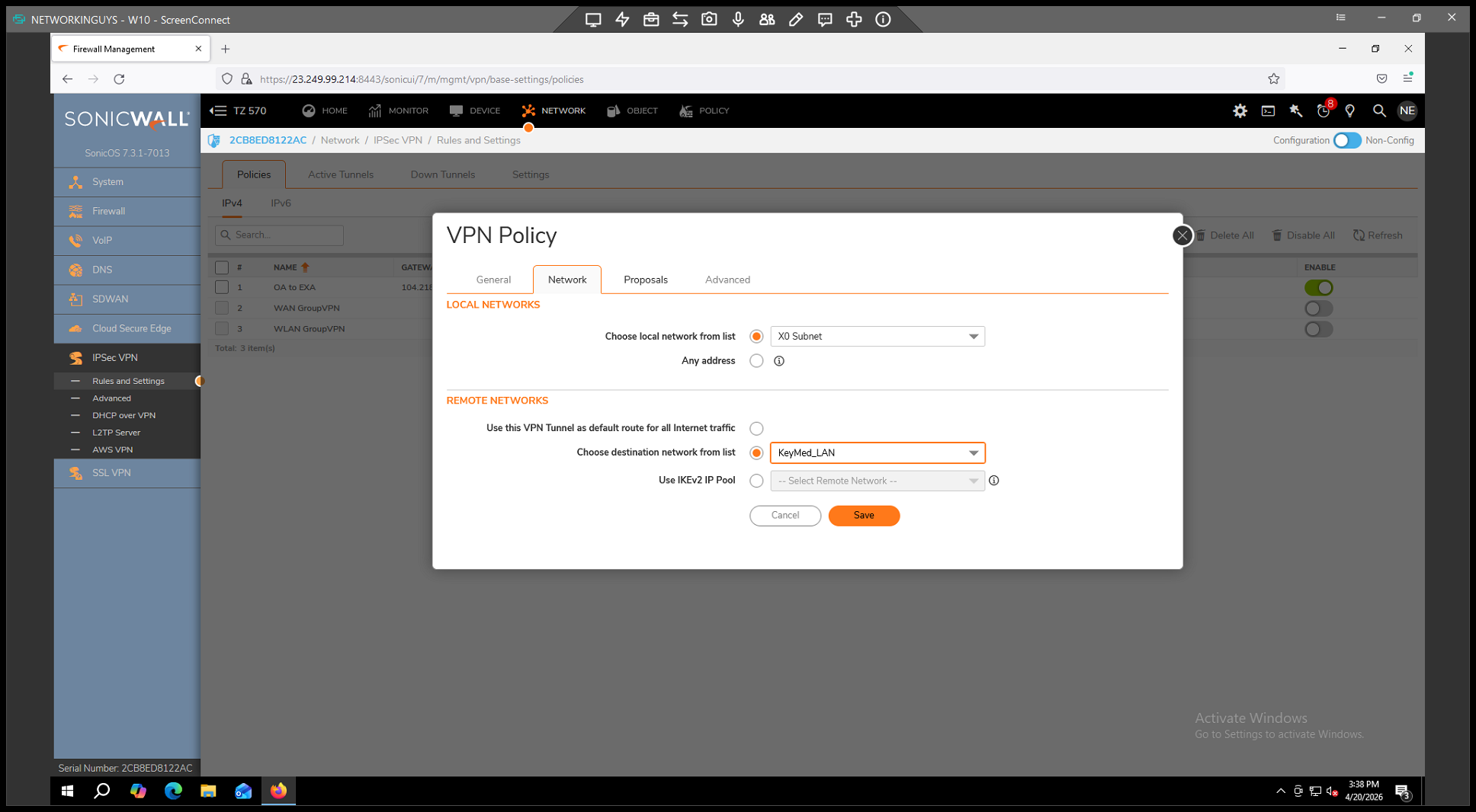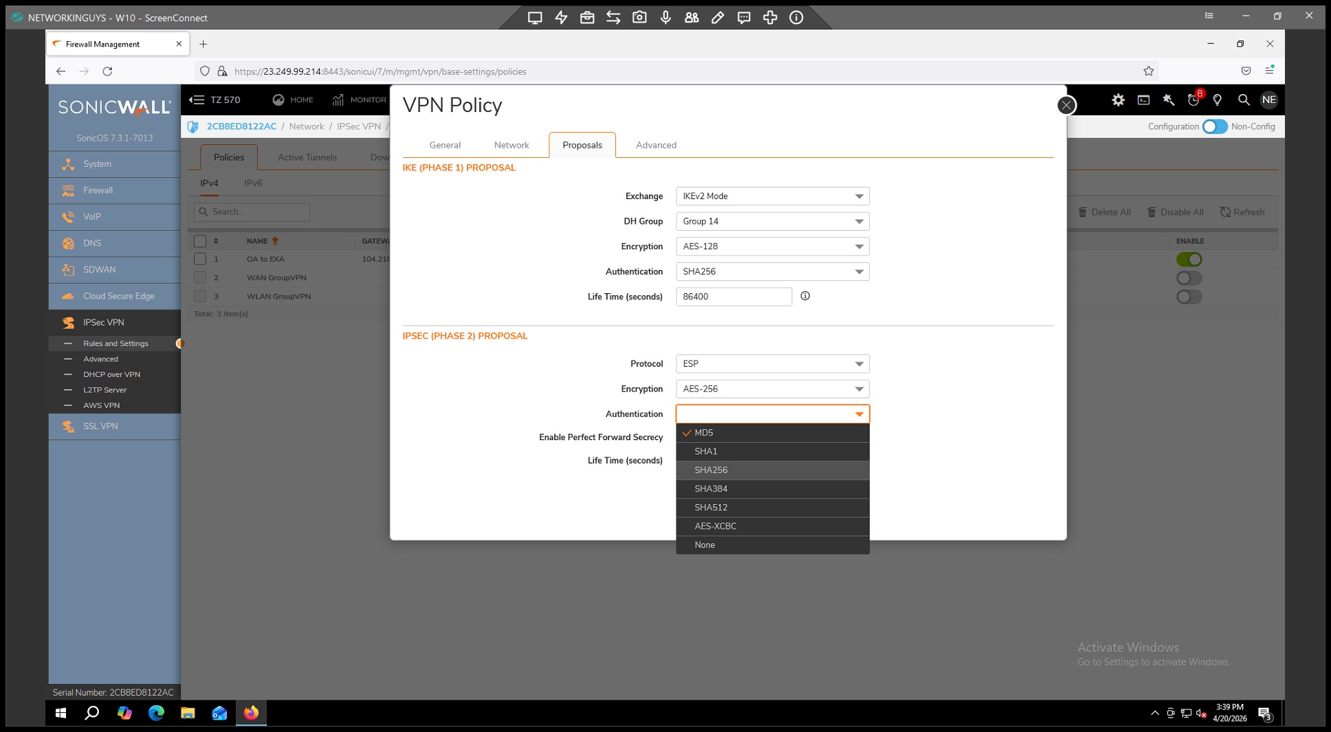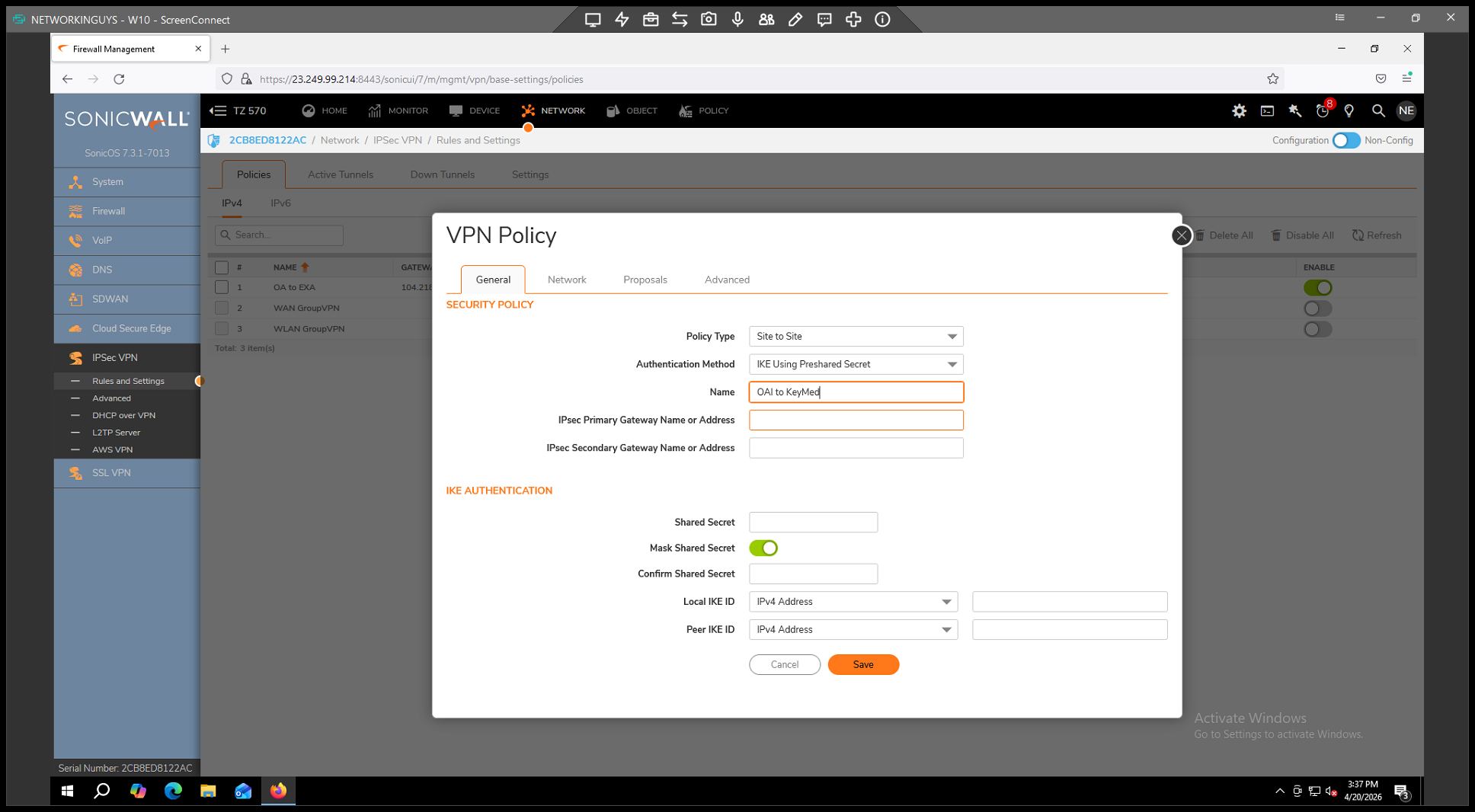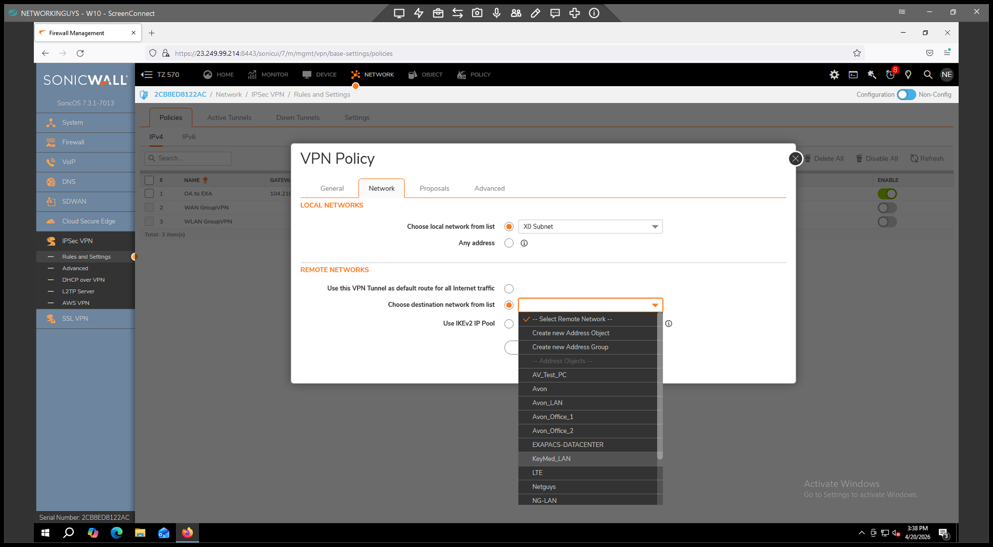 Setting up a Site-to-Site IPsec VPN on a SonicWall firewall involves creating an address object for the remote network, defining the VPN policy, and configuring encryption and authentication protocols. Follow these steps to build and configure your secure VPN tunnel.