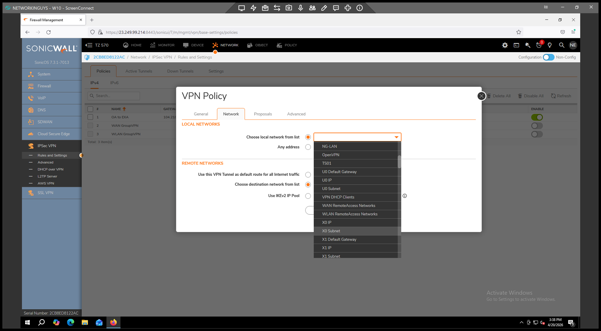 (for instance, the X0 subnet) from the local network dropdown list. 3. In the Remote Networks section,