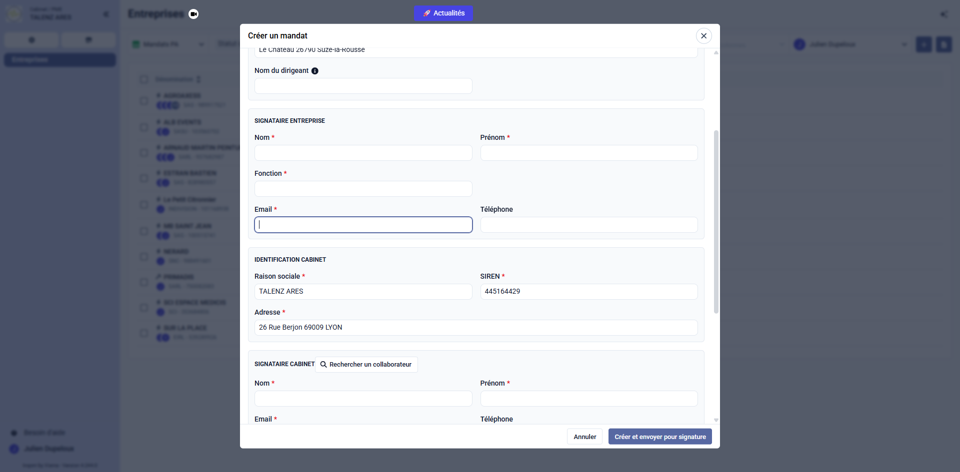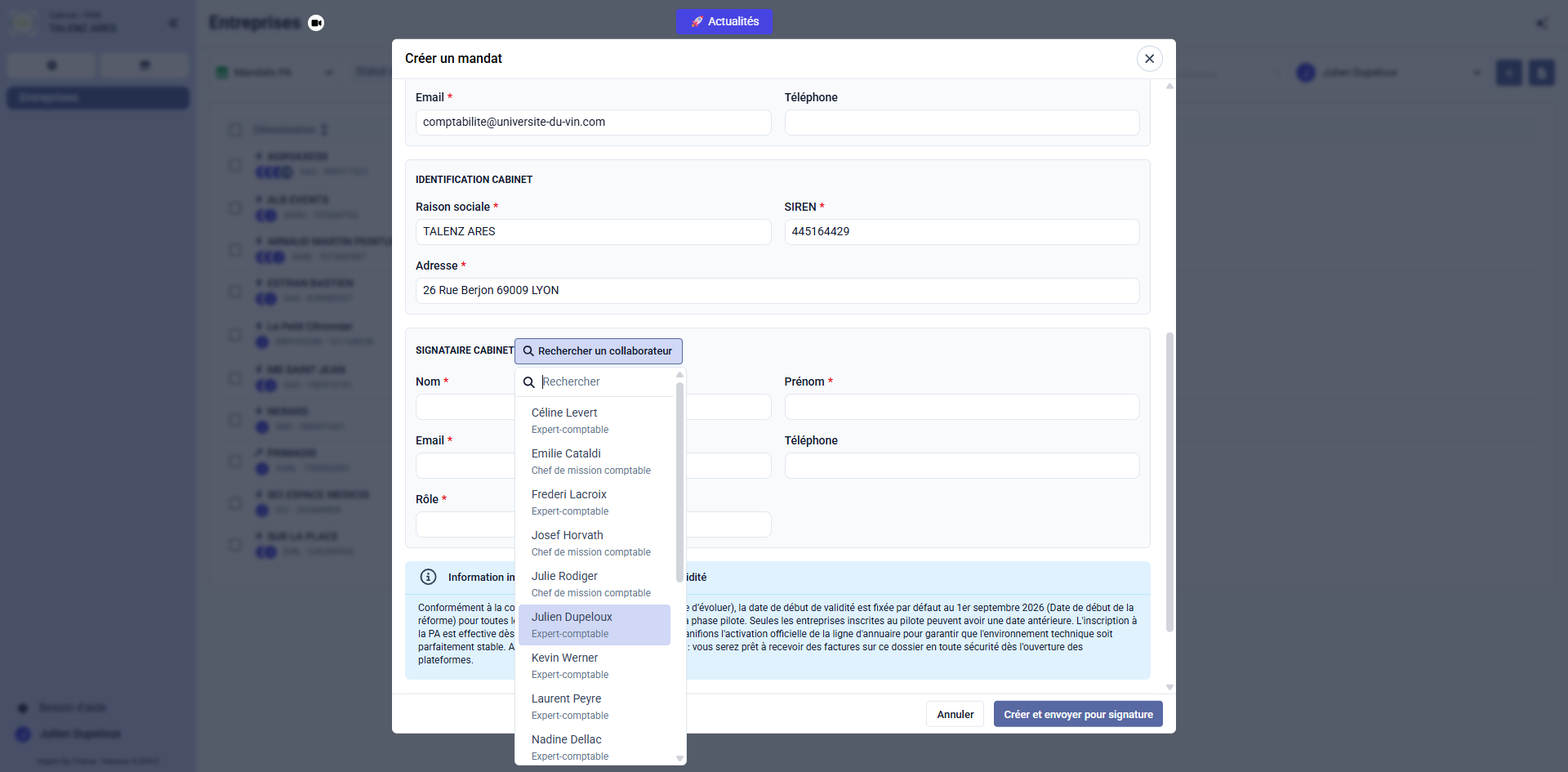 Passez à la section Signataire cabinet et cliquez sur le menu déroulant Rechercher un collaborateur.