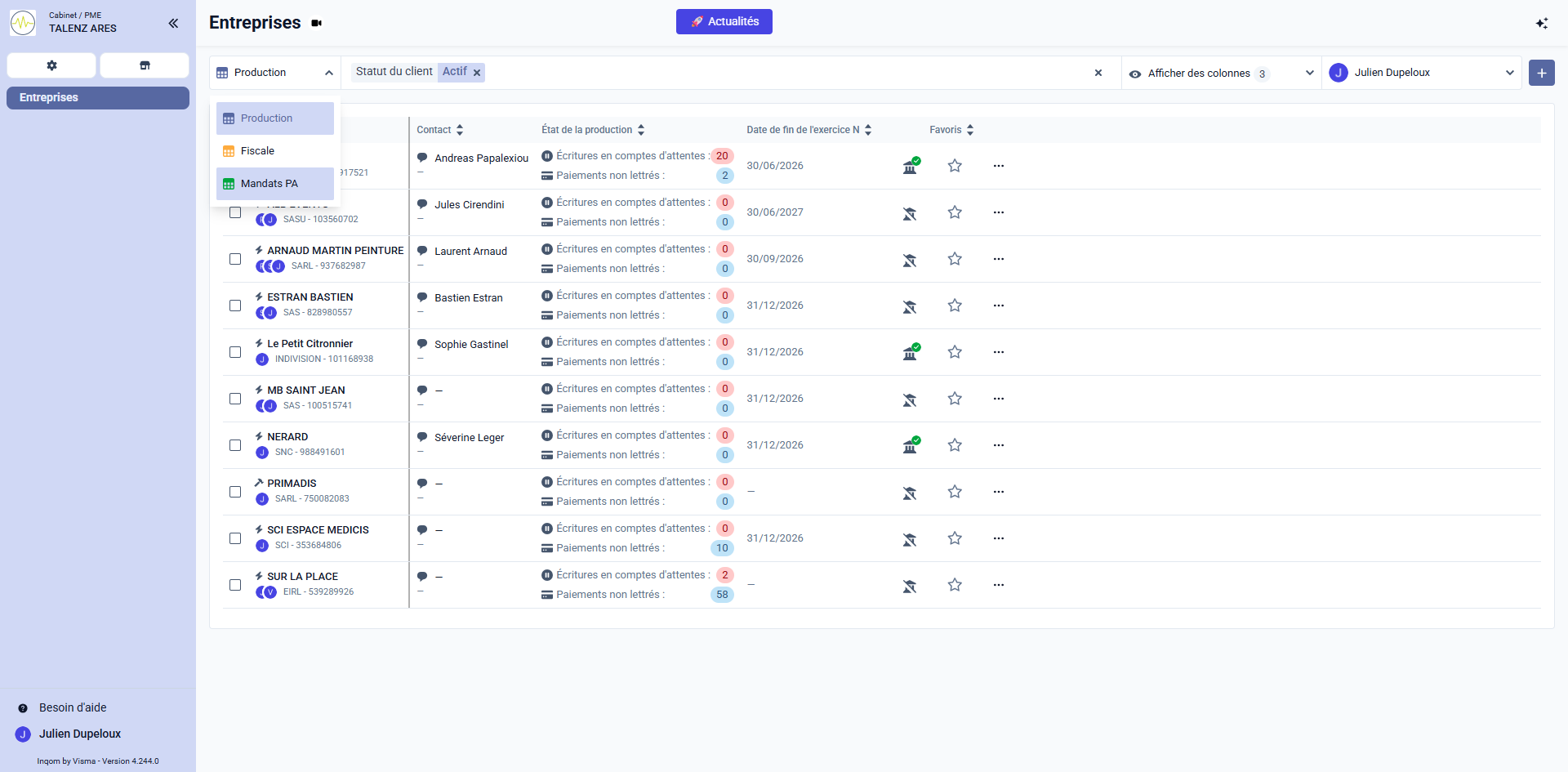 Sélectionnez la vue Mandats PA depuis le menu déroulant principal des vues (généralement positionné sur "Production" par défaut).