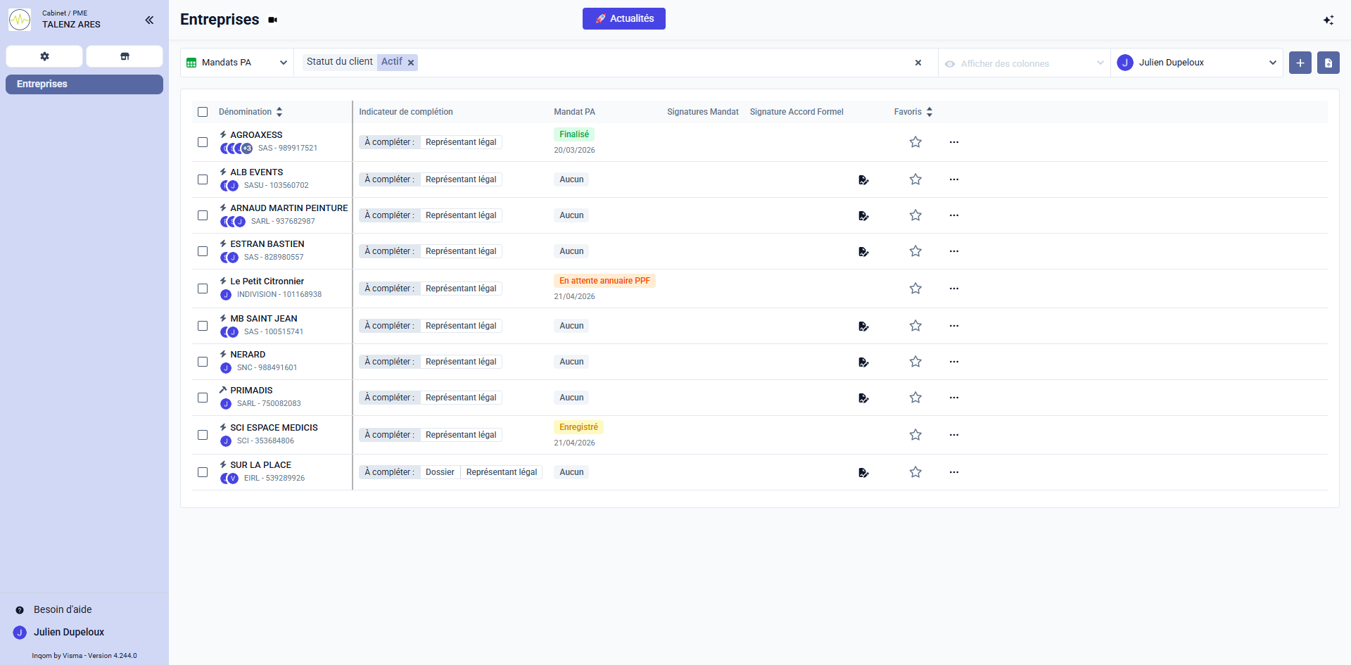 Dans la liste des entreprises, cliquez sur l'icône au bout de la ligne de l'entreprise concernée pour ouvrir le menu d'actions, puis choisissez de créer un mandat.