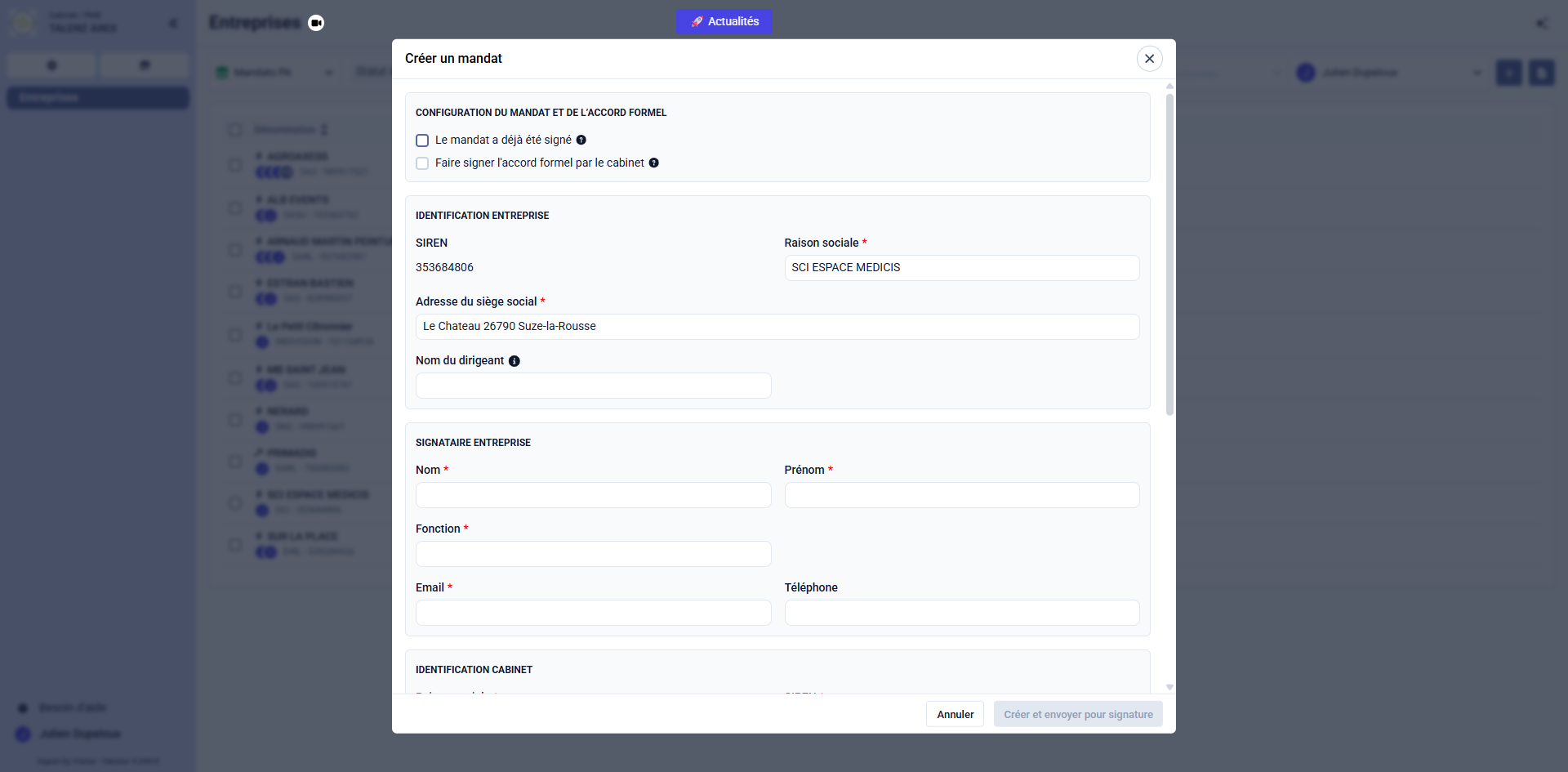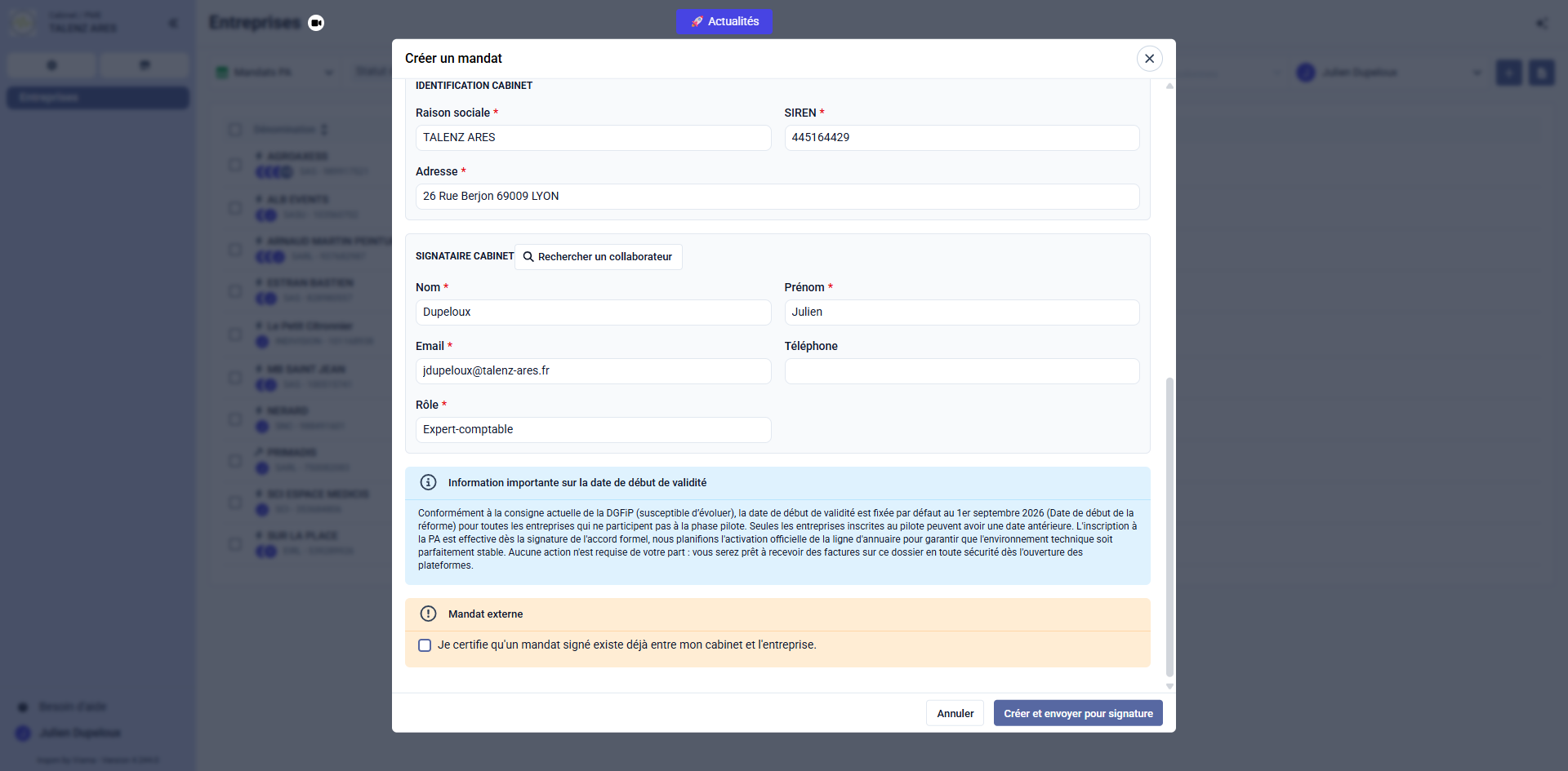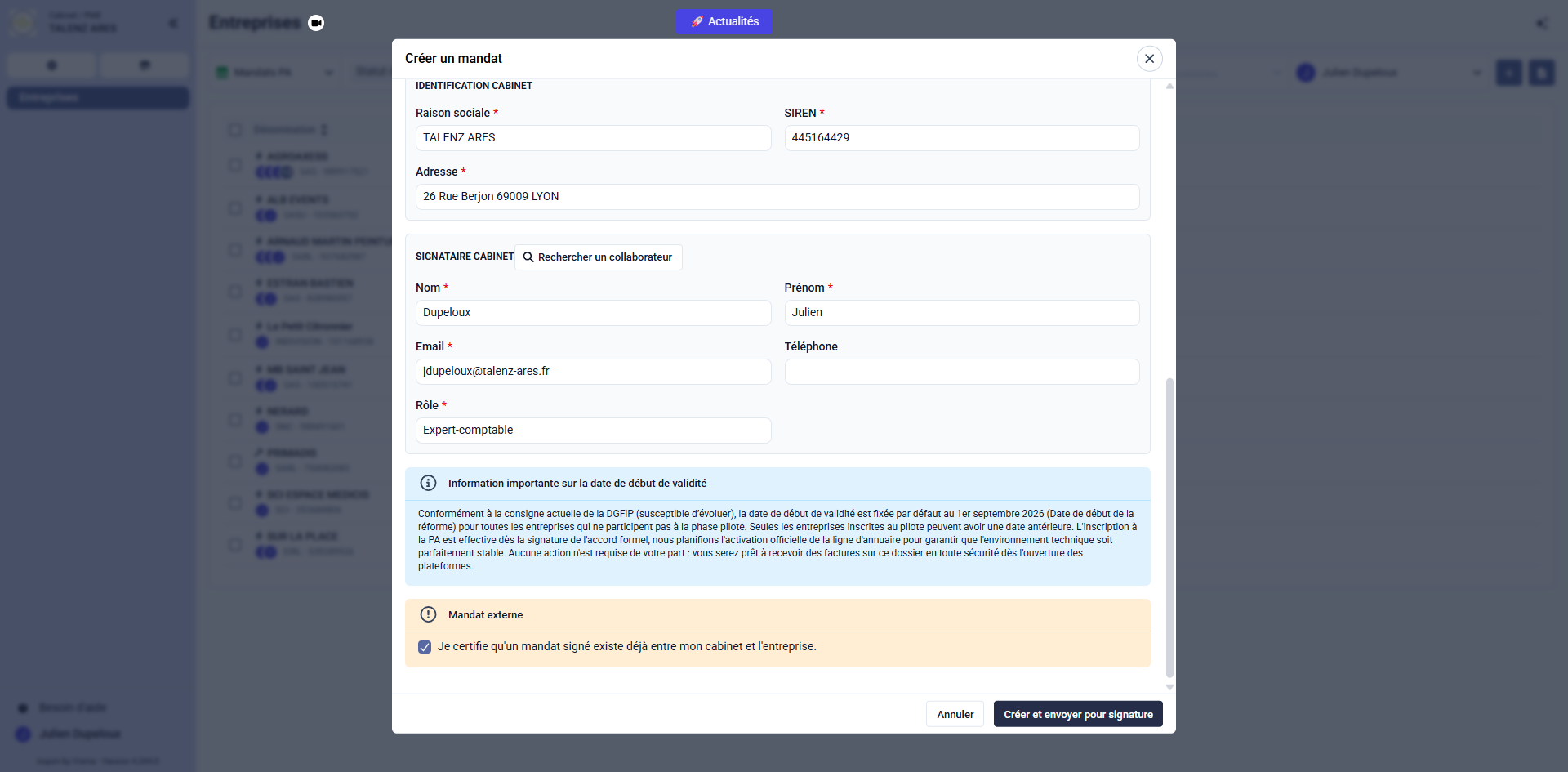 Cochez la case Je certifie en bas de la fenêtre pour valider le fait qu'un mandat existe entre le cabinet et le client