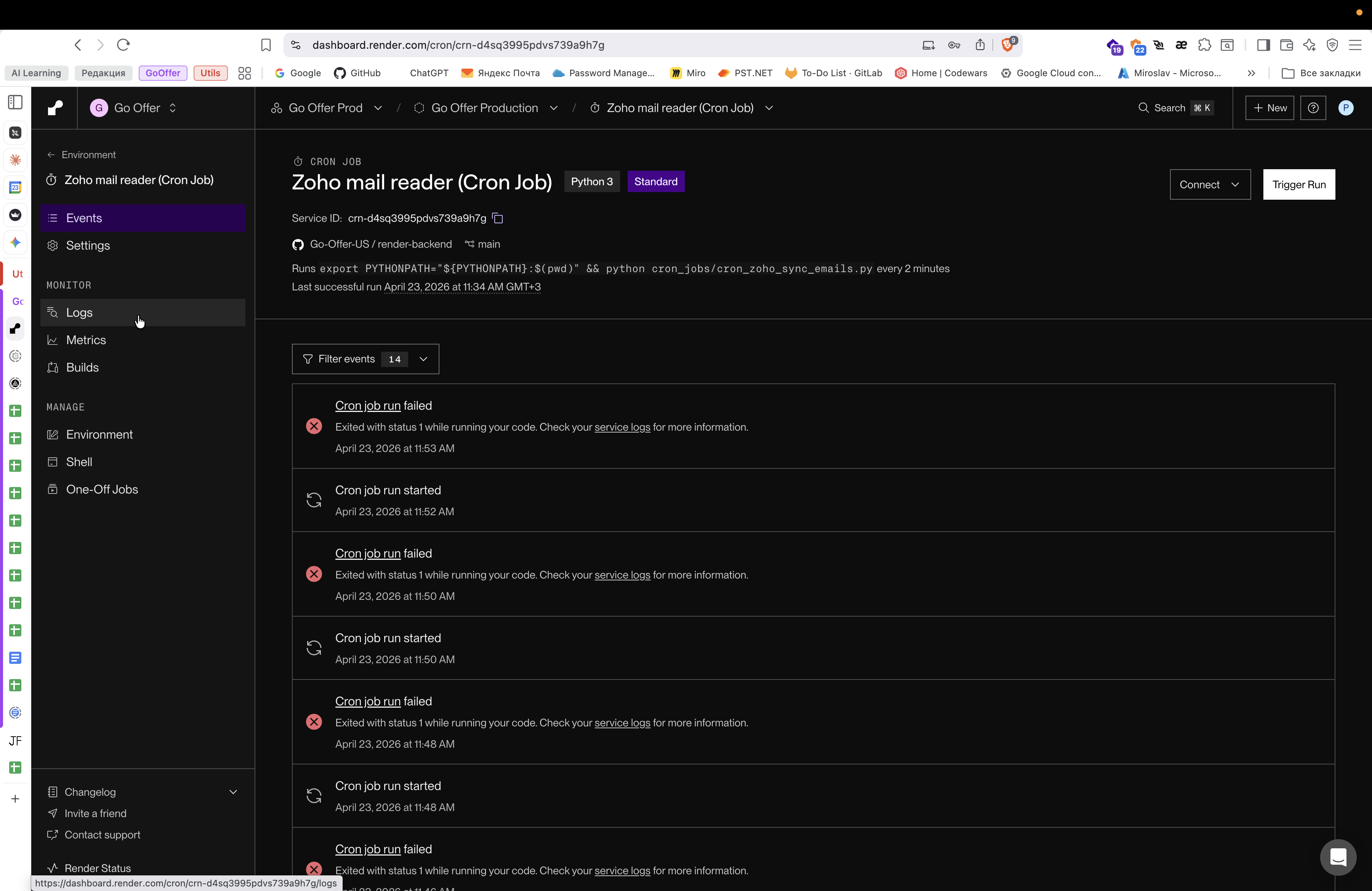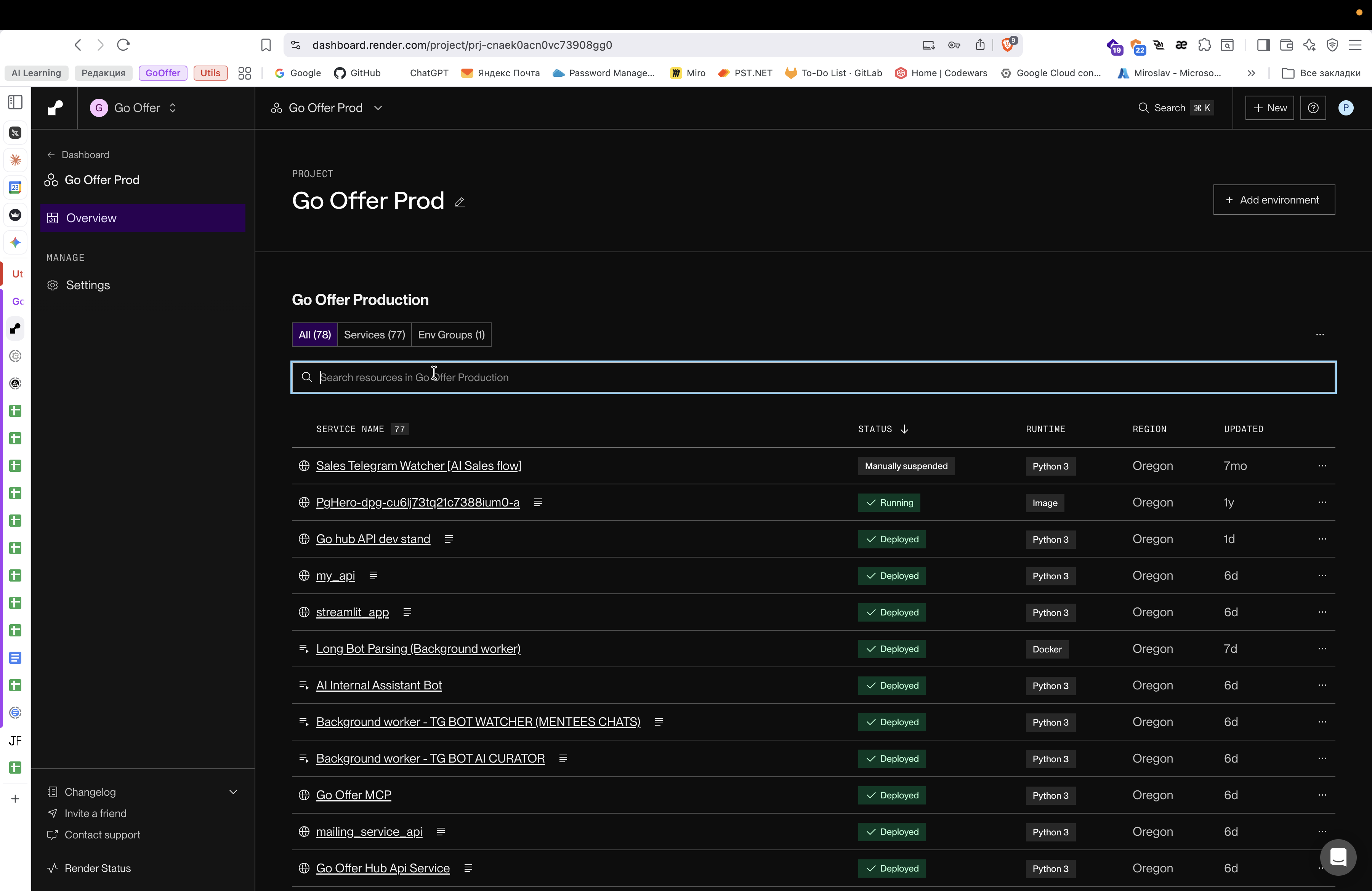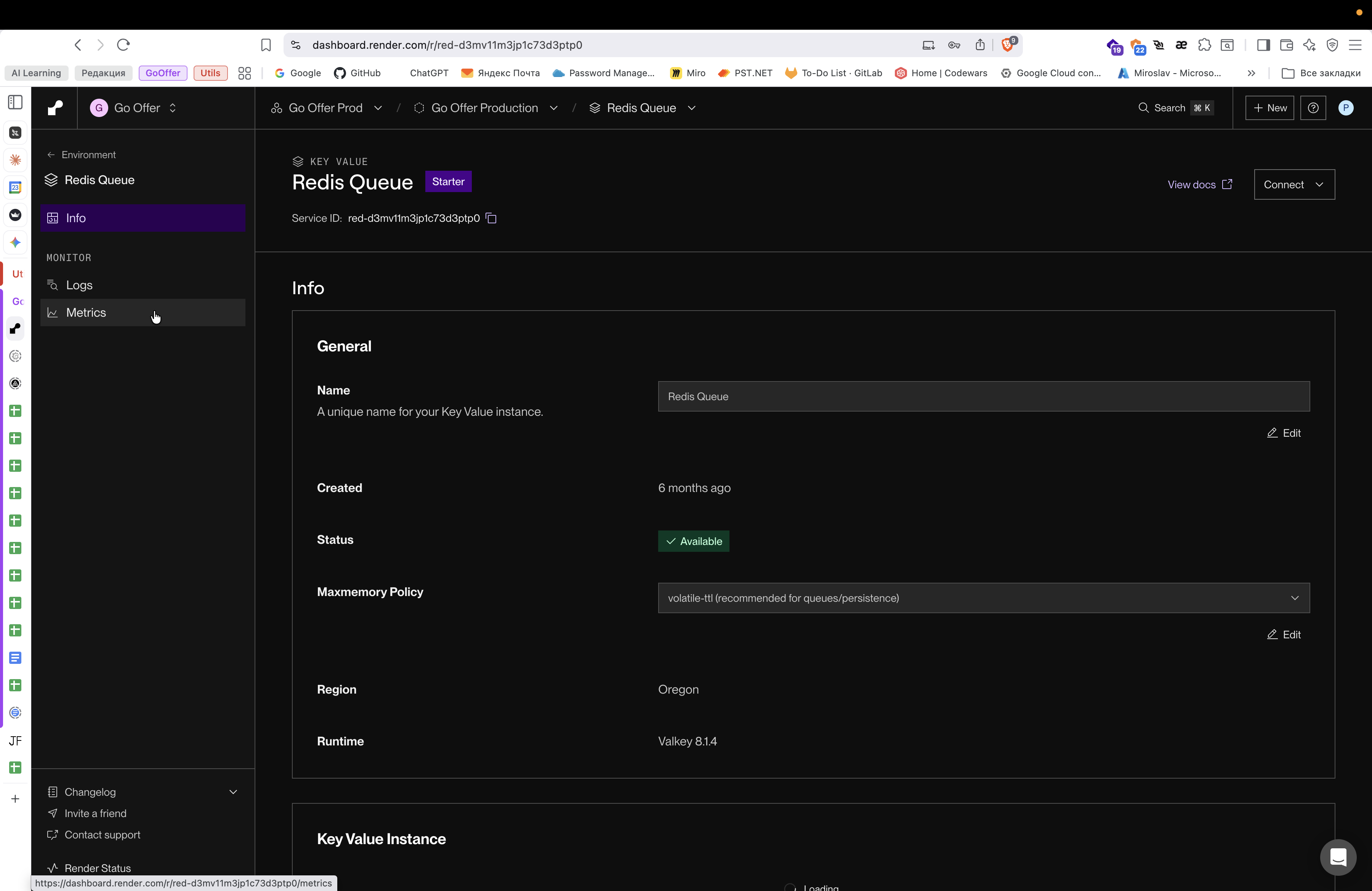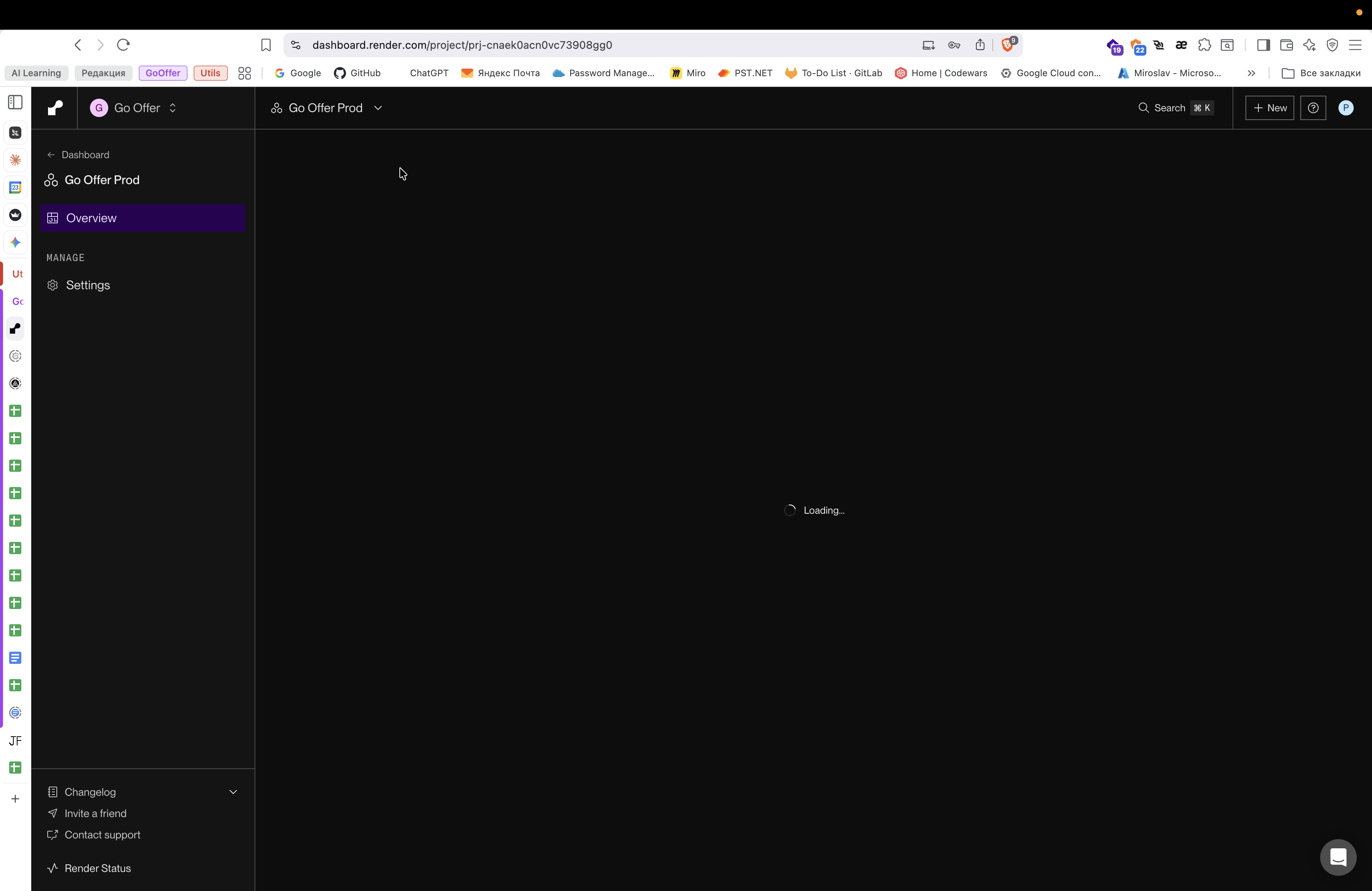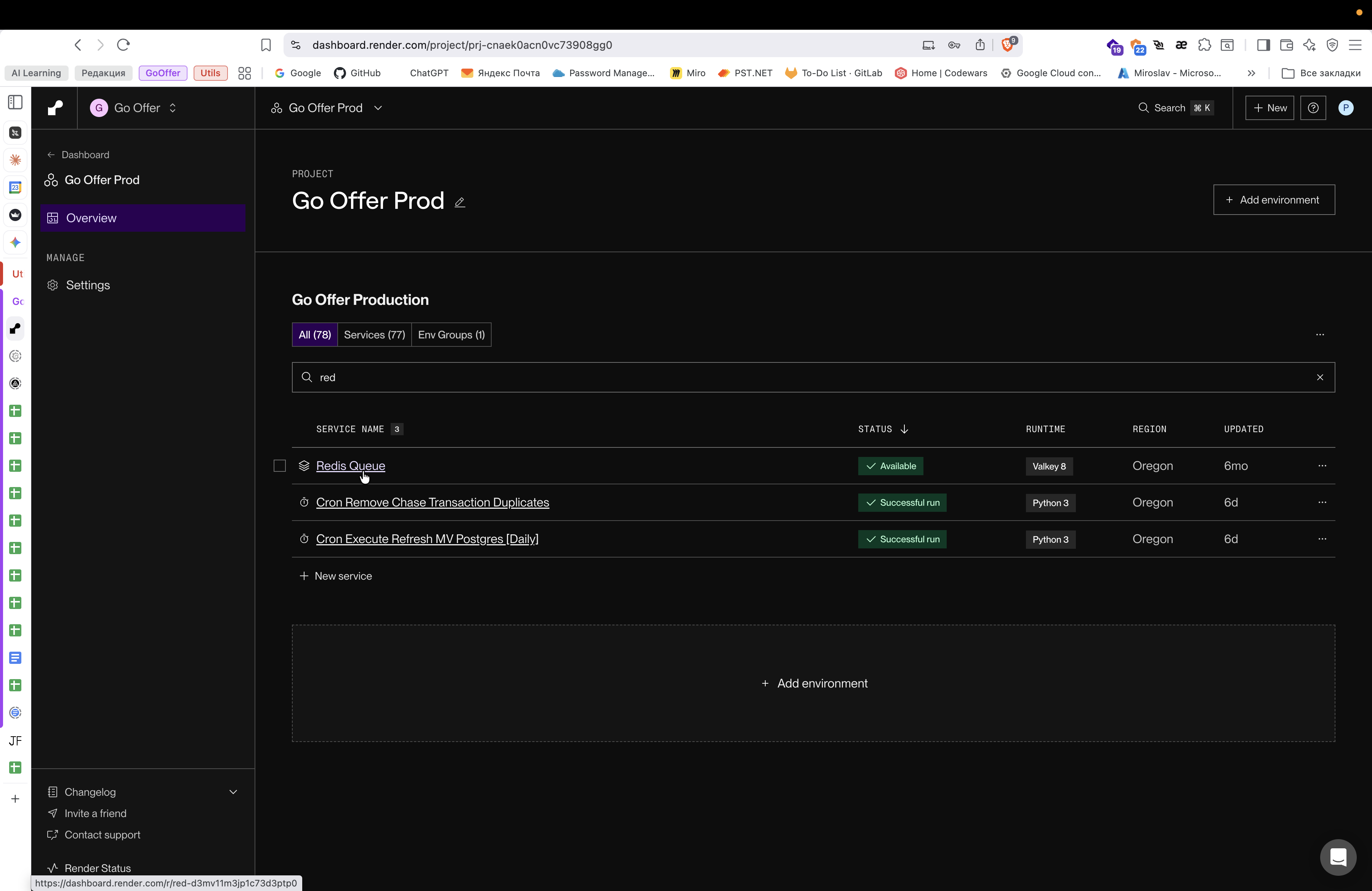 Перейдите в проект Go Offer Prod в дашборде Render.