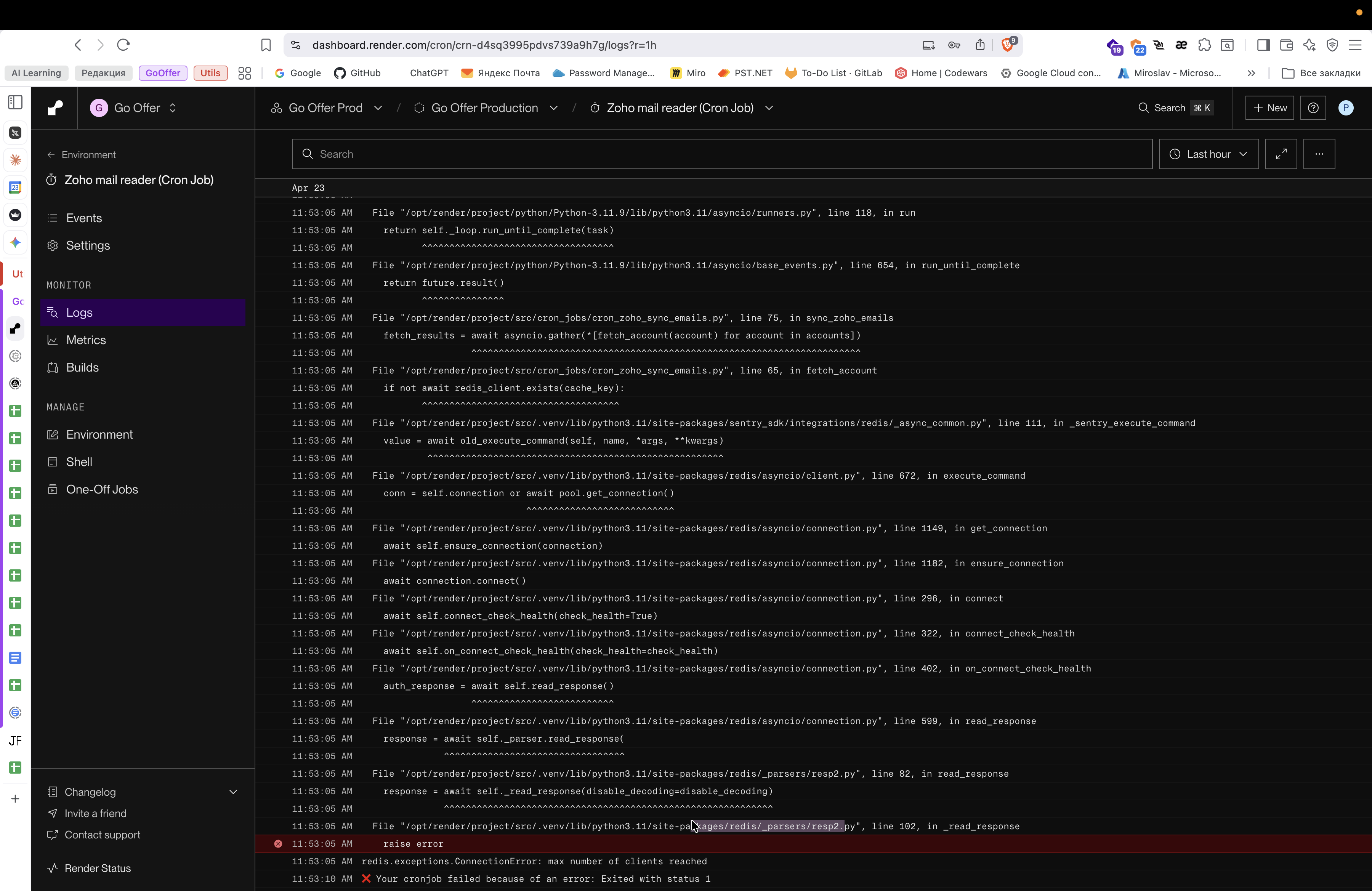 Крон-задача парсинга почты (Zoho Mail Reader Cron) начала падать с ошибкой ConnectionError. Анализ показал, что проблема связана с исчерпанием пула соединений Redis — соединения не закрываются корректно, что приводит к превышению лимита активных клиентов.