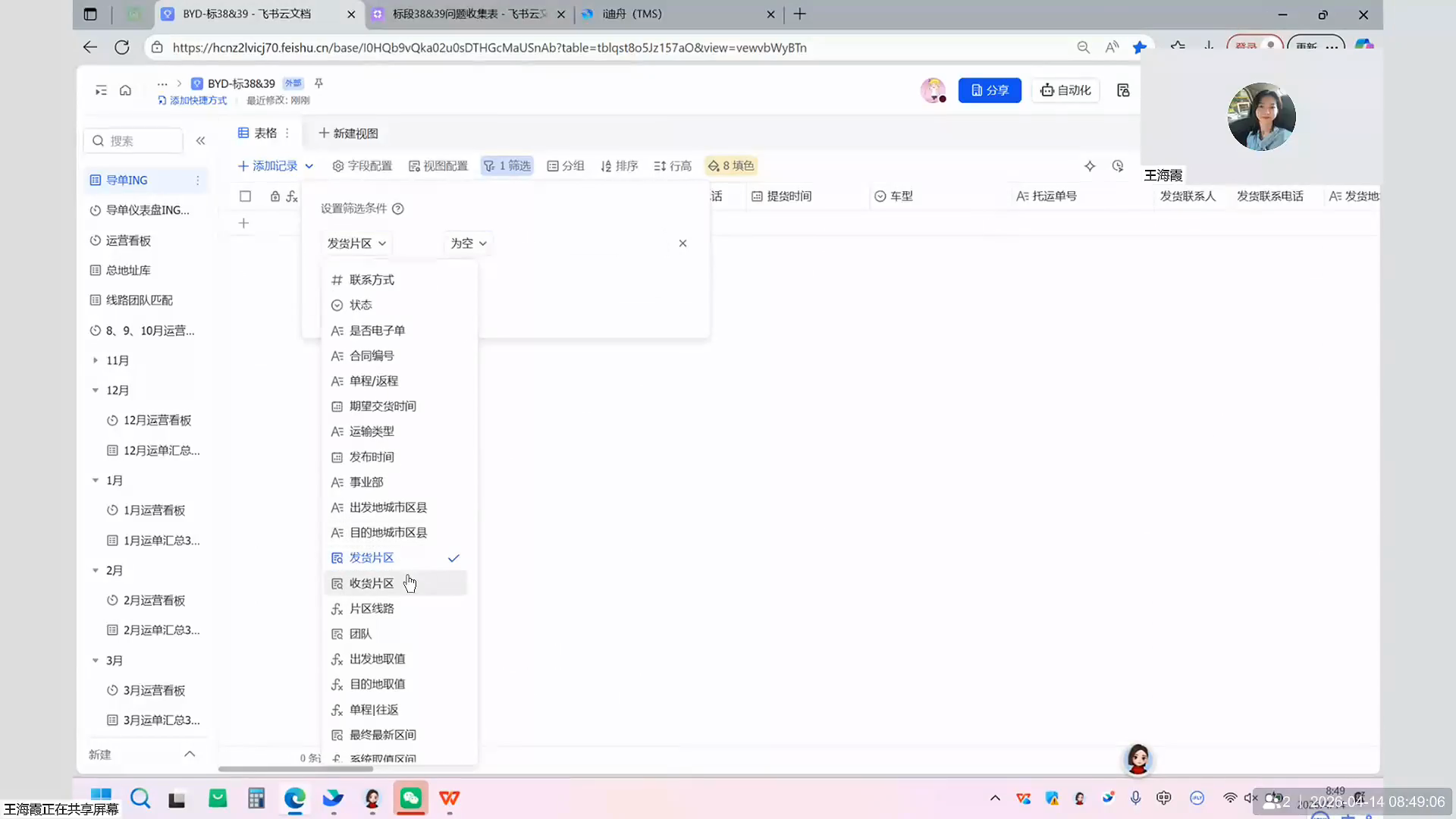 在表格顶部打开筛选面板,点击选择 发货片区 字段。