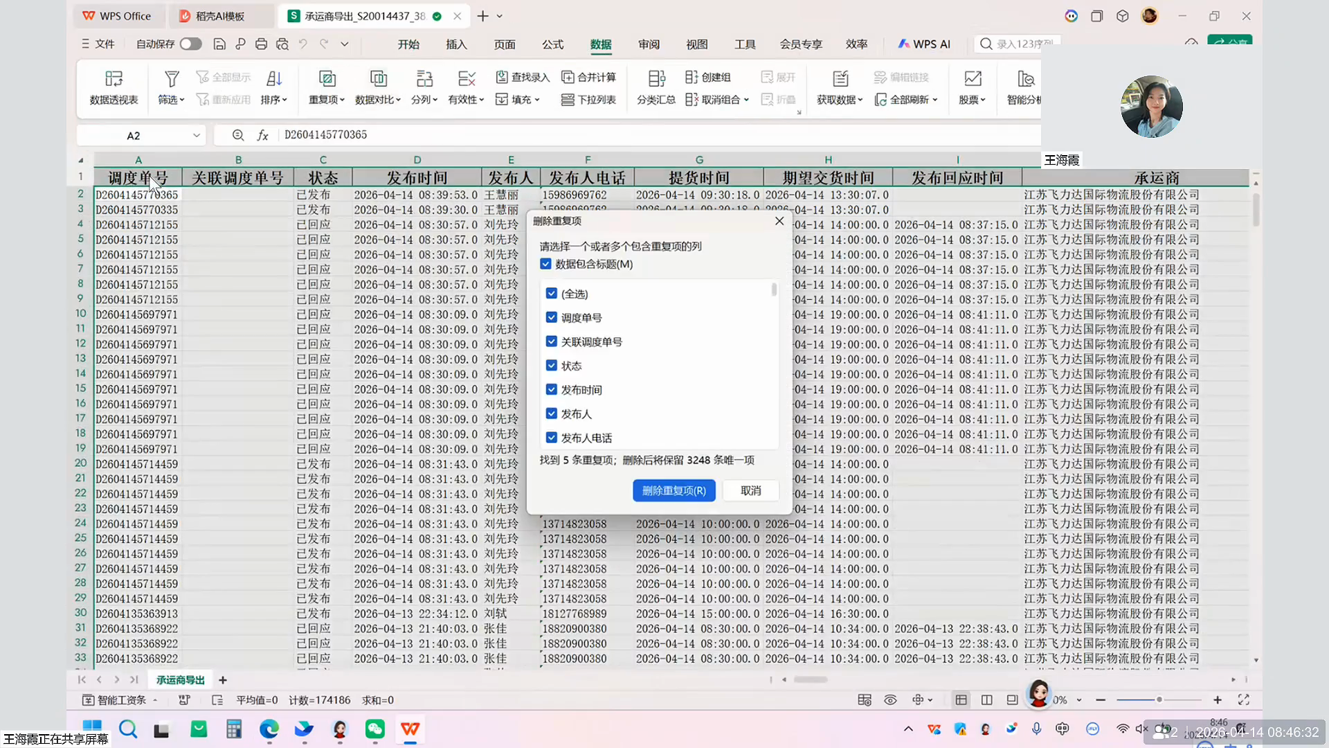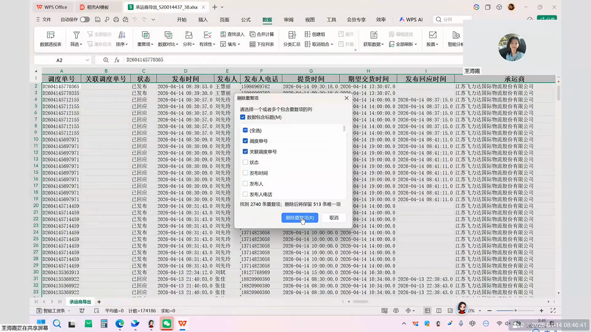 使用 WPS 或 Excel 打开下载好的文件,点击菜单栏中的 删除重复项 功能,仅勾选 调度单号 字段来进行去重。