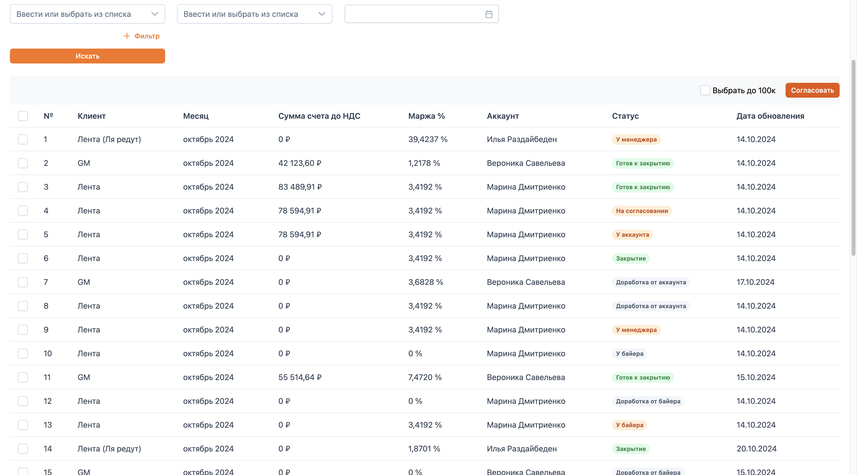 В перечне флайтов аккаунт-директор видит все флайты, которые еще не согласованы им, и те, что находятся у его подчиненных в работе. Аккаунт-директор может отфильтровать флайты по нужному фильтру. По умолчанию установлены фильтры: «Клиент», «Сумма счета до НДС», «Месяц».