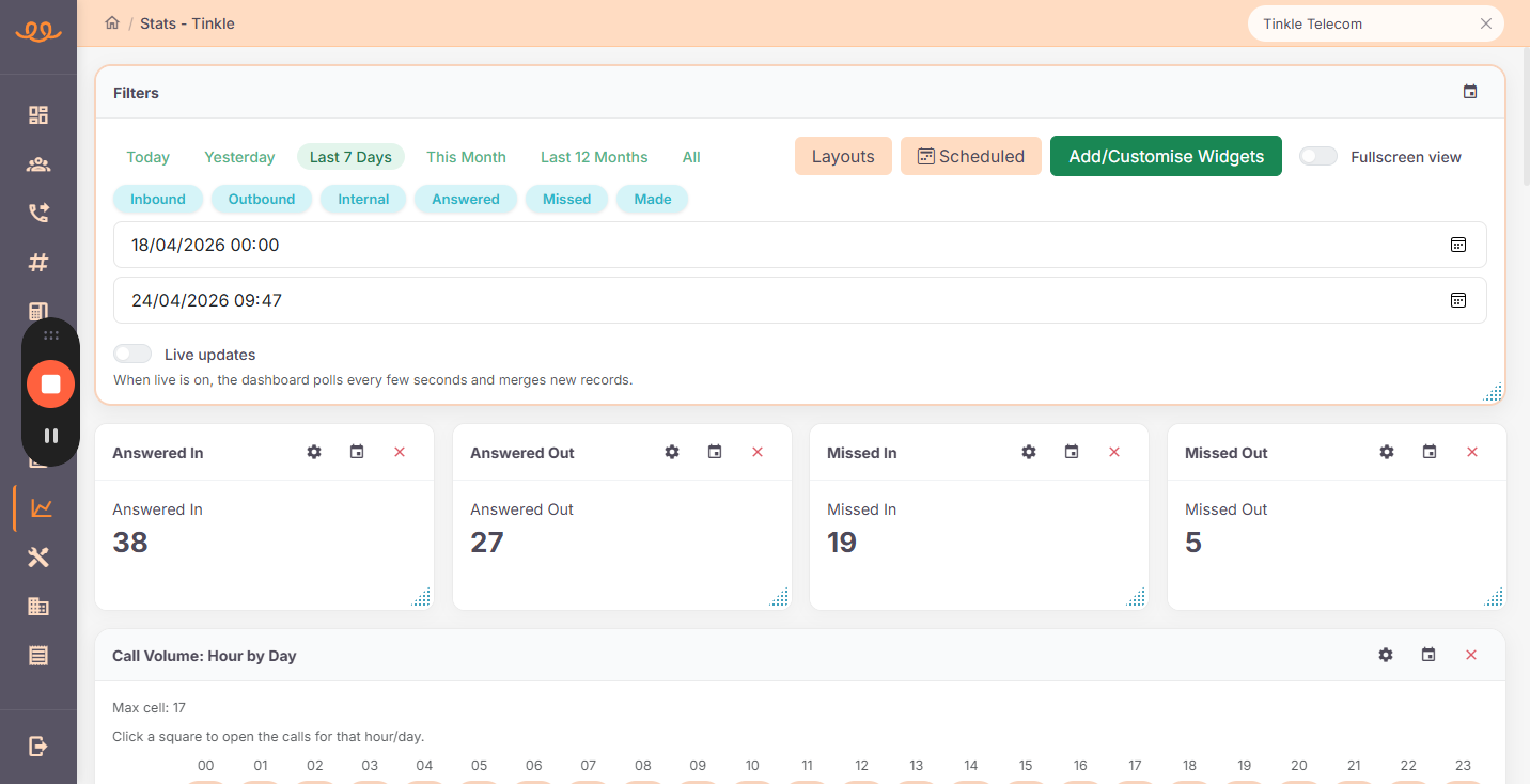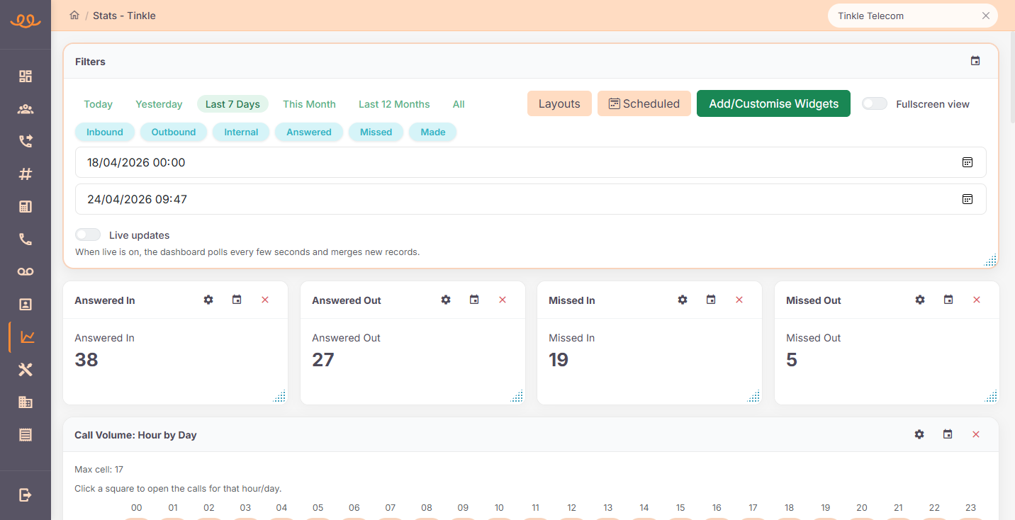 The dashboard offers a variety of visual widgets to help you analyze call volumes and identify trends over time.