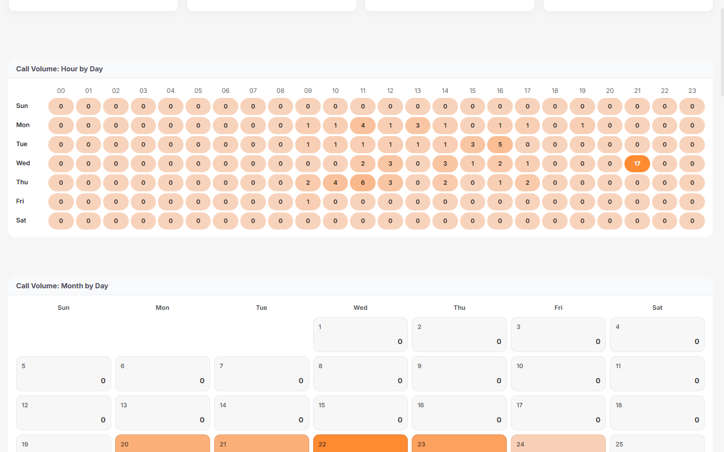 You can click directly on specific data points within widgets—such as the colored cells in the Call Volume: Hour by Day heatmap—to drill down into detailed call records for that specific time block.