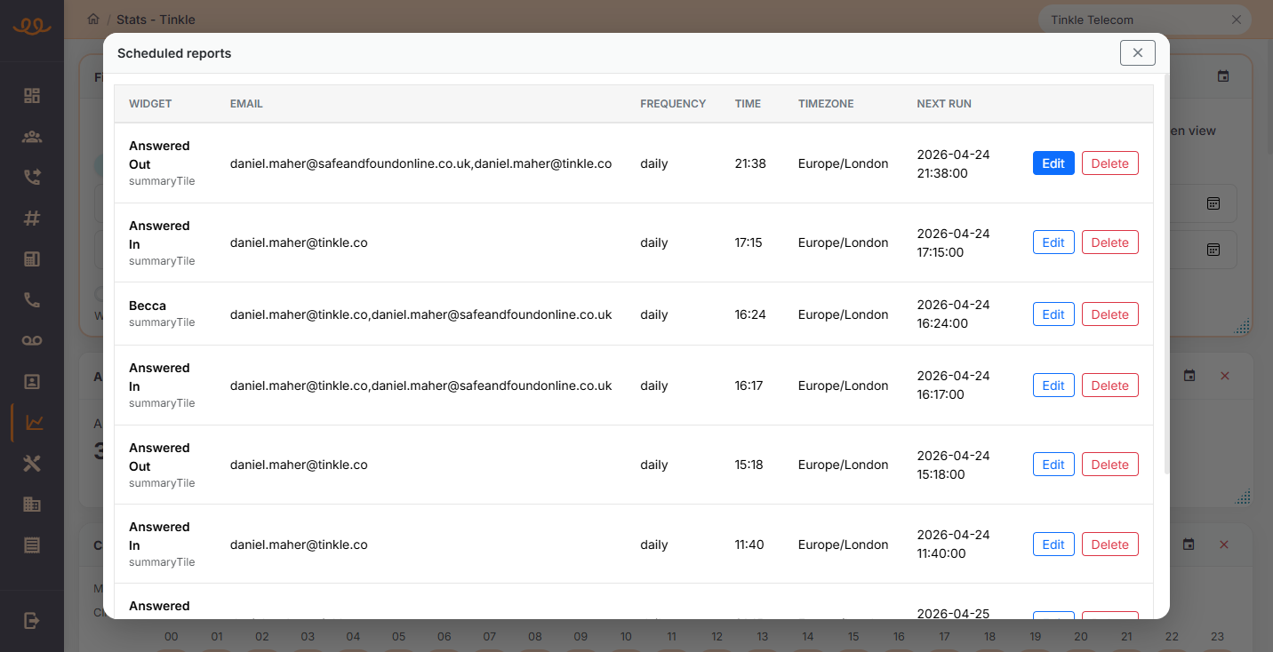 Click Edit next to any existing report to modify its configuration. You can update recipient email addresses, adjust the delivery frequency, or change the data format (e.g., grouped calls vs. raw rows).