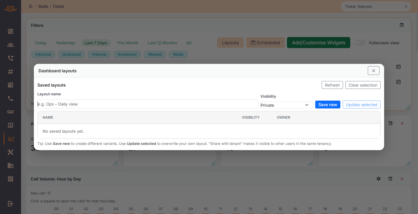 Accessing call analytics and configuring your dashboard widgets in Tinkle CX allows you to gain deeper insights into your team's performance. You can manage saved layouts, schedule automated reports, and drill down into specific metrics using interactive visualizations.