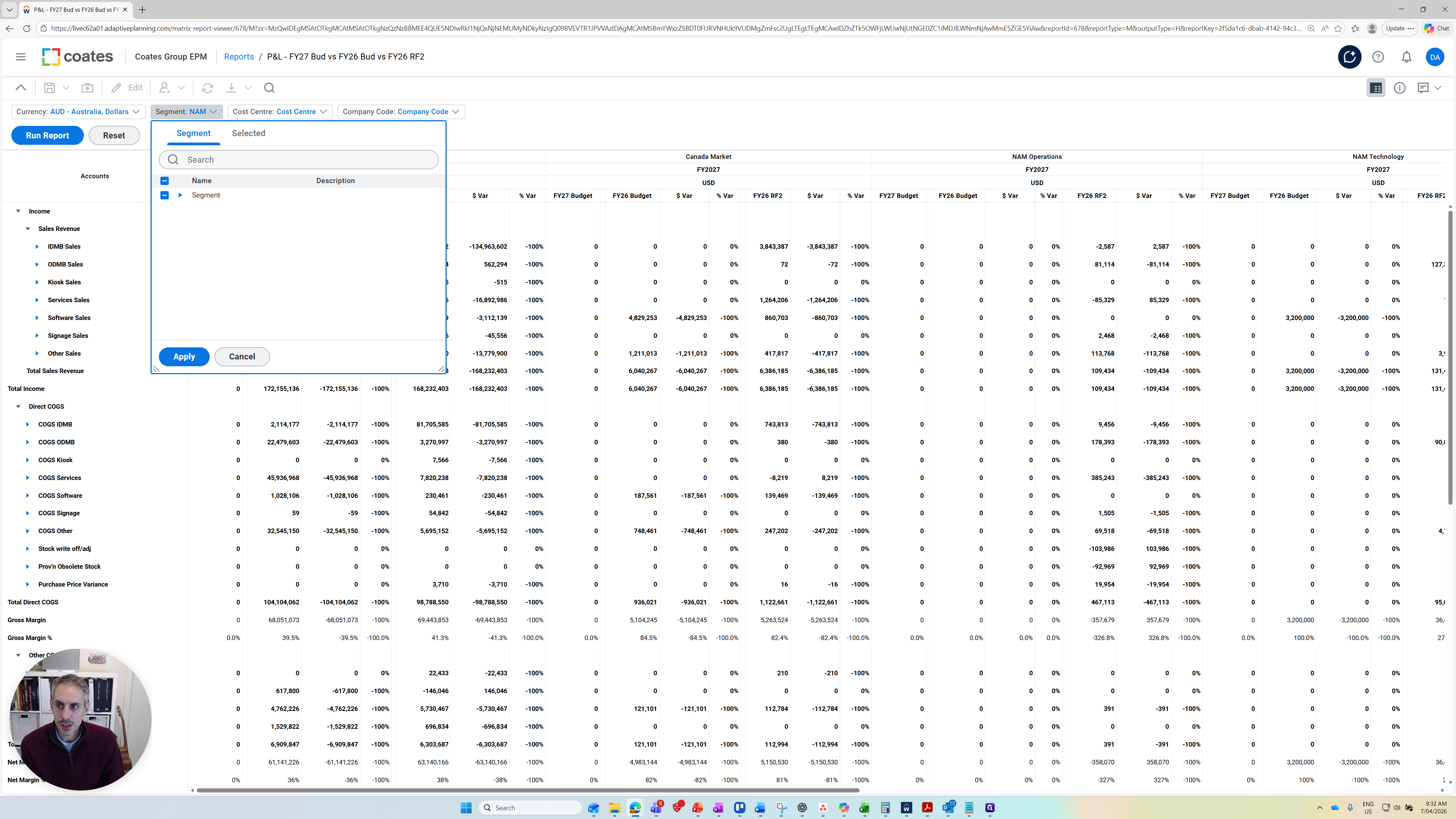We have the same setup as the CFO report regarding the rows and types of accounts we are capturing. The layout of the segments and cost centers is also consistent.