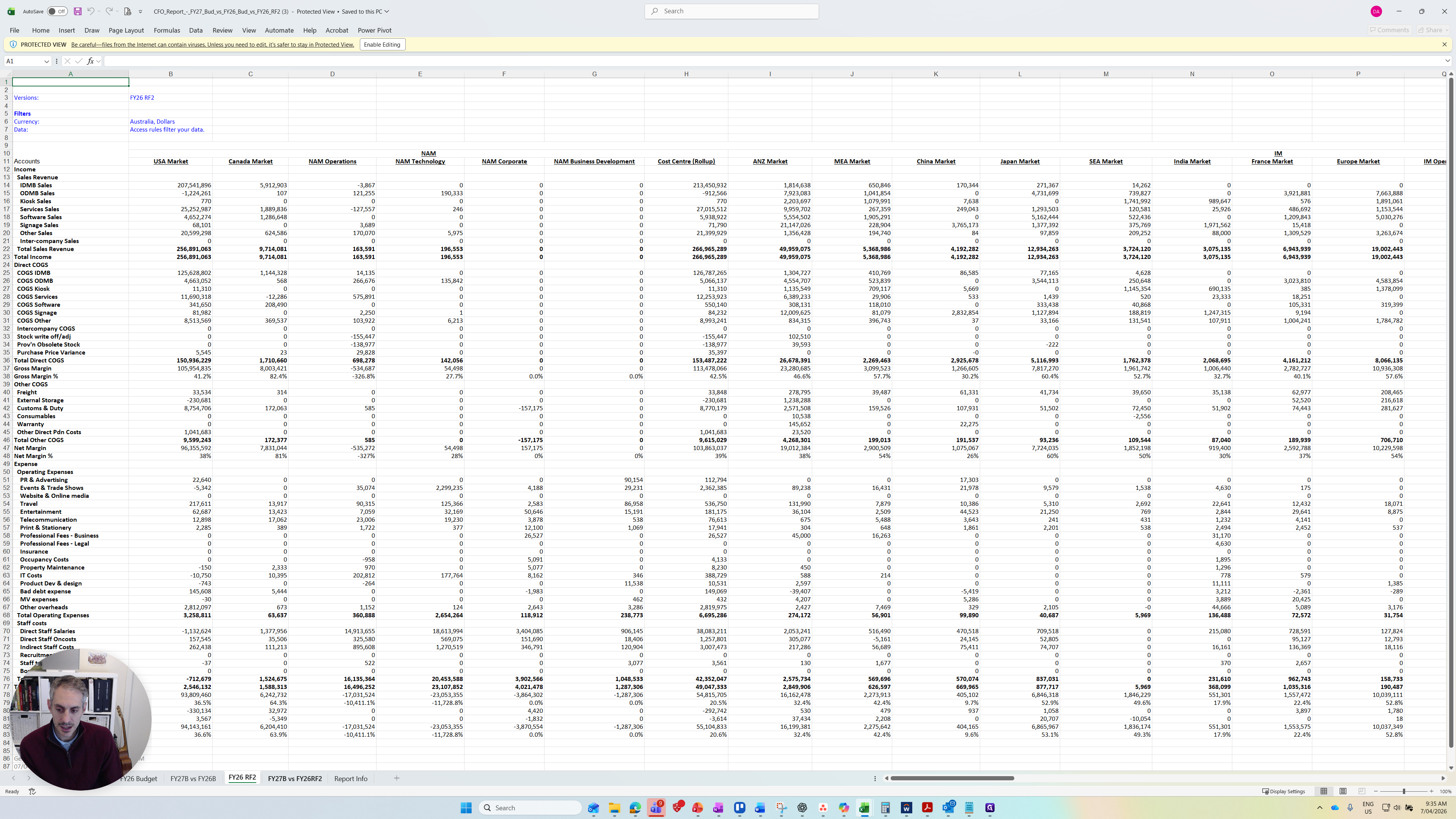 In the bottom corner, you can see different tabs for the FY27 Budget, FY26 Budget, the variance between them, and the Reforecast Two prepared in January, along with its variance.