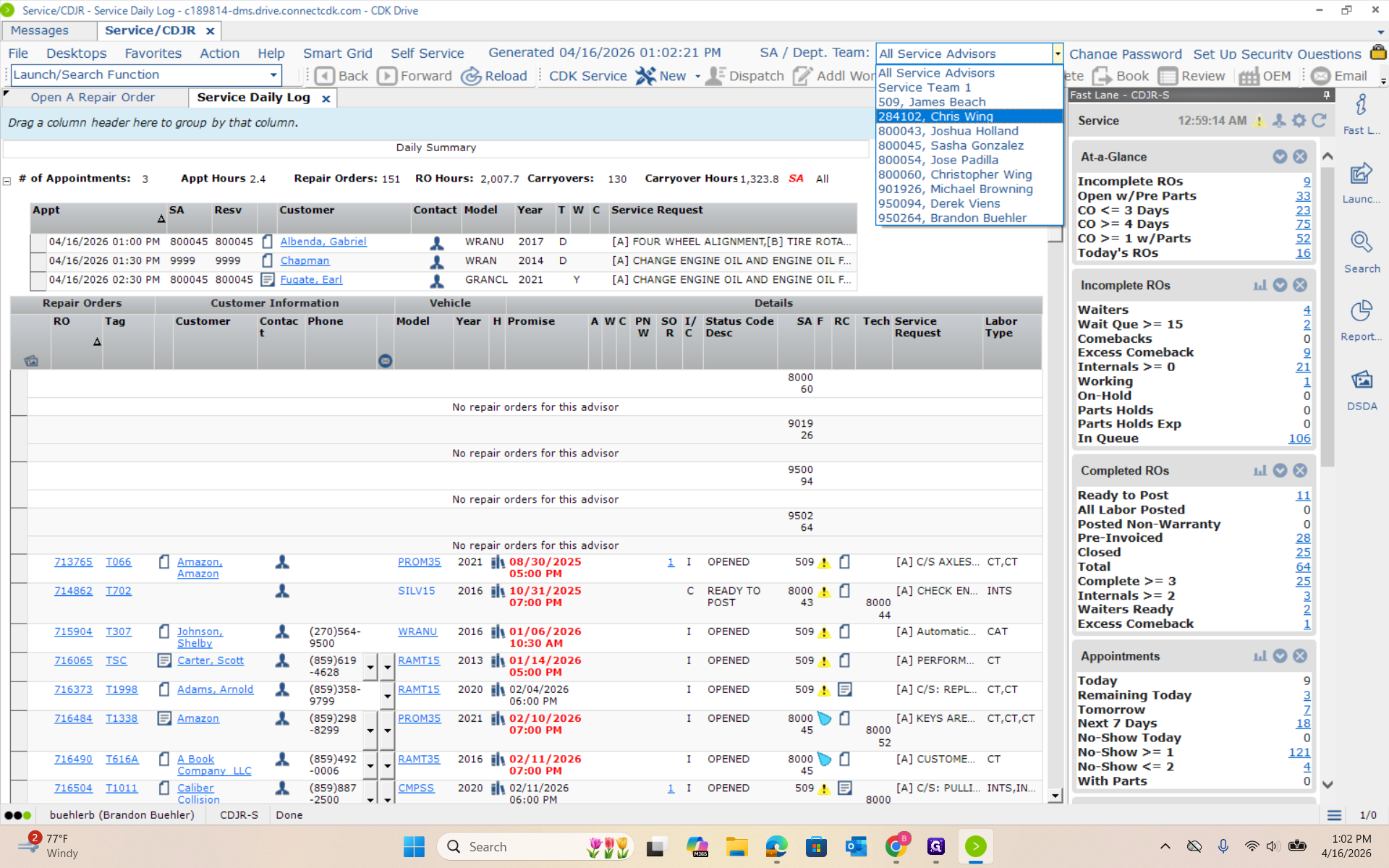 Click All Advisors, find your name, and select it. You will see your open ROs and their current status.