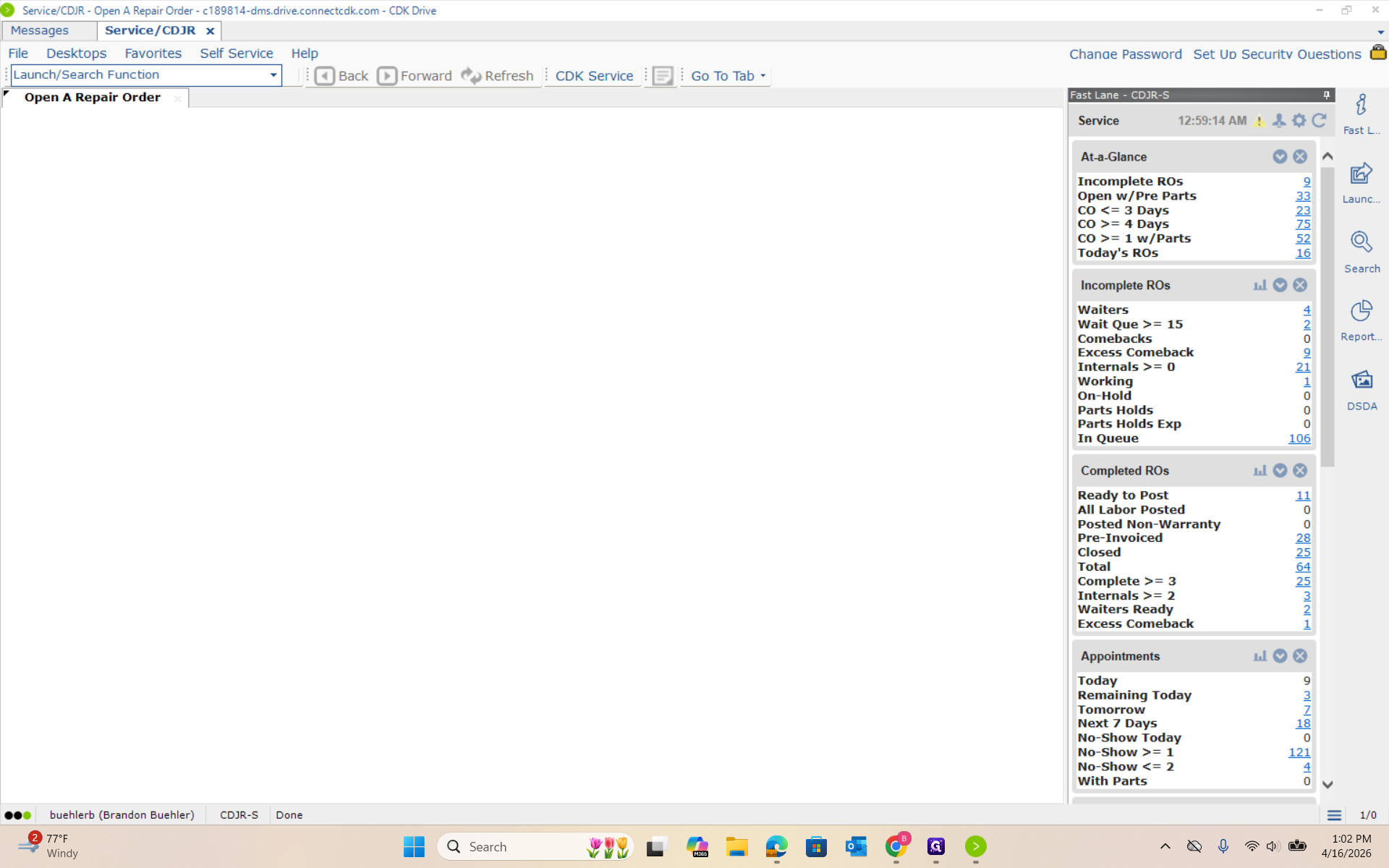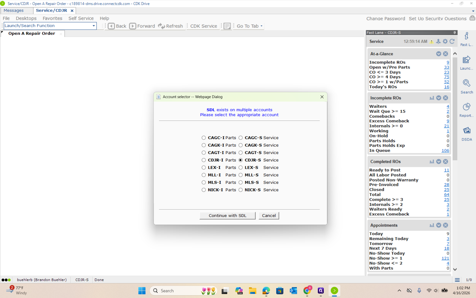 We will open your service daily log, which contains your open ROs. First, click Launch. Type "SDL" and press Enter.